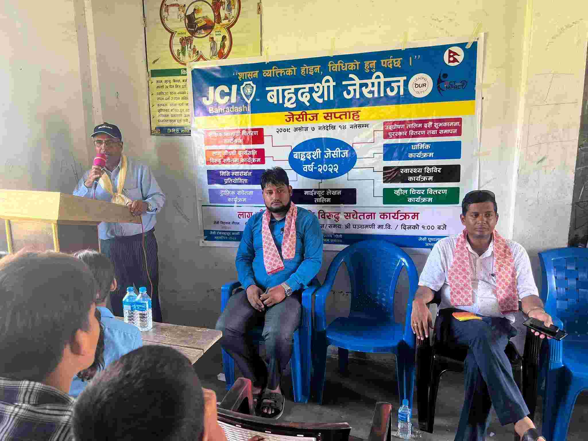 बाह्रदशी जेसीजको सप्ताह अंतरगत मिति 2079/06/07 गते लागूऔषध दुर्व्यसनि तथा सचेतना कार्यक्रम बाह्रदशी ६ मा रहेको श्री पञ्चमणी माध्यमिक विध्यालमा सम्पन्न भएको छ । उक्त कार्यक्रमका सहजकर्ता ईन्द्र प्रसाद ओली हुनुहुन्थ्यो । कार्यक्रममा कक्षा सात देखि कक्षा दस सम्मका विद्यार्थीहरुको उपस्थित थियो ।