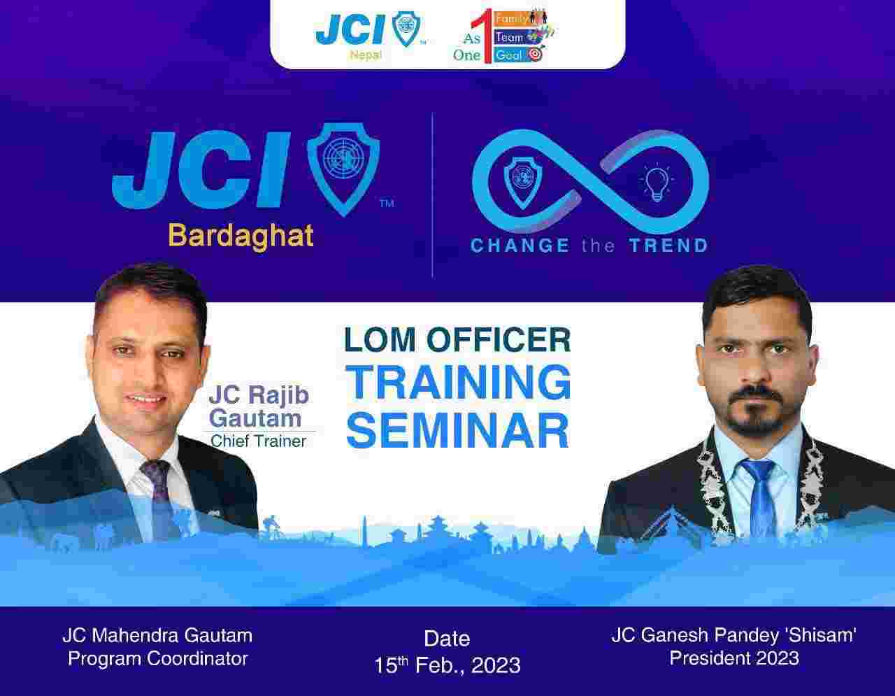 बर्दघाट जेसीज वर्ष २०२३ का अध्यक्ष जेसी गणेश पाण्डे ‘शिसम’को सभापतित्व, बुटवल जेसीजका बर्ष २०२० का अध्यक्ष तथा प्रमुख प्रशिक्षक जेसी राजीव गौतमको प्रमुख आतिथ्यता संस्थापक अध्यक्ष जेसी राजु न्यौपाने र पुर्व अध्यक्ष गणेश न्यौपाने र निवर्तमान अध्यक्ष तथा नेपाल जेसीज वर्ष २०२३ का लागि Chamber of Commerce Partnership Commission, Coordinator जेसी दिनेश न्यौपानेको आतिथ्यतामा उक्त तालिम प्रदान गरिएको हो ।