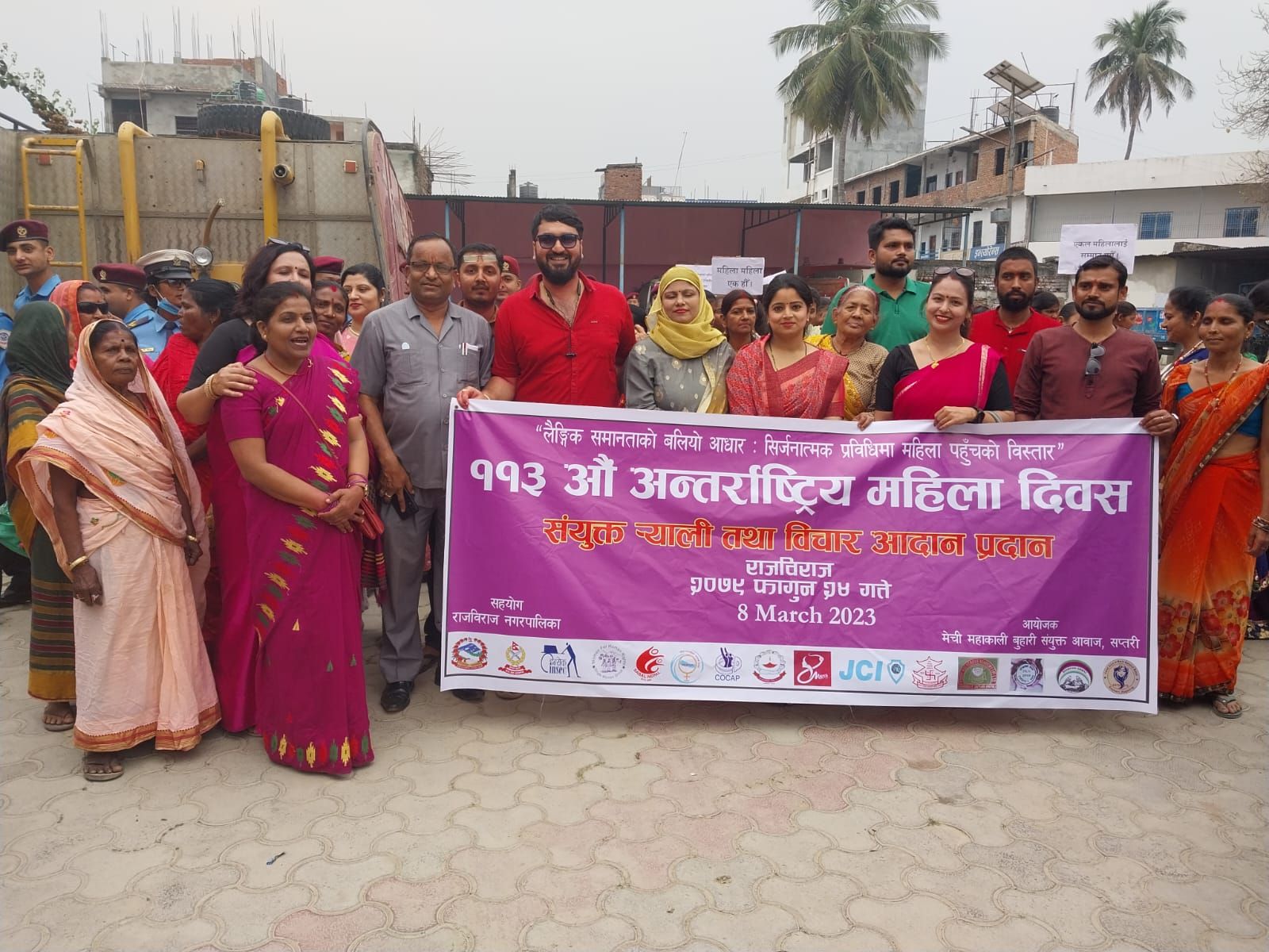 “लैङ्गिक समानताको बलियो आधार: सिर्जनात्मक प्रविधिमा महिला पहुँचको विस्तार” नाराका साथ वि.सं. २०७९ फागुन २४ गते राजविराजमा संयुक्त र्याली तथा विचार आदान प्रदान कार्यक्रम गरि नारी दिवस मनाइएको छ। राजविराज जेसीज तथा राजविराज नगरपालिकाको सहयोगमा इन्सेक, मेचीमहाकाली बुहारी संयुक्त आवाज, महिला मानवअधिकार रक्षक सञ्जाल, जिल्ला प्रहरी कार्यालय, एकल महिला समूह, परिकल्पना नेपाल, कोक्याप, सामुदायिक सेवा केन्द्र, सबल नेपाल, प्राइम होलिक्रस एकेडेमी, नेपाल राष्ट्रिय मारवाडी महिला सङ्गठन लगायत सङ्घ–संस्थाले जुलुस, गोष्ठी र अन्तक्रिया गरेर महिला माथि भइरहेको हिंसा र विभेदमाथि बहस गरेका छन्। कार्यक्रमका प्रमुख अतिथि राजविराज नगरपालिकाका कार्यवाहक नगर प्रमुख इसरत परविनले सचेतनाका साथै महिलाहरू आर्थिक रुपमा सबल र आत्मनिर्भर नभएसम्म विकास असम्भव रहेको बताइन्। कार्यक्रममा प्रमुख जिल्ला अधिकारी भूपेन्द्र थापाले महिलाको सहभागिता बढाउँदै र क्षमता अभिवृद्धि गर्दै सशक्त रूपमा अघि बढ्न आह्वान गरेका थिए। राजविराज जेसीज वर्ष २०२३ का अध्यक्ष जेसी उज्ज्वल काबराले महिला सशक्तीकरणले समाजमा घनात्मक प्रभाव पर्ने जिकिर गरेका थिए। प्रहरी उपरिक्षक नरेन्द्र कार्कीले समानुपातिक समावेशी सिद्धान्तको आधारमा राज्यका विभिन्न निकायमा महिलाको पहुँच बढदै गएको र महिला अधिकारका विषयमा प्रहरी संवेदननशील रहेको बताए। मेचीमहाकाली बुहारी संयुक्त आवाज सप्तरीकी अध्यक्ष अनीता देवकोटाको अध्यक्षतामा आयोजित कार्यक्रममा महिला शिक्षक मञ्जु श्रेष्ठ, अधिकारकर्मी मालती चौधरी, नागरिक समाजका अध्यक्ष थान सिंह भन्साली, सामुदायिक सेवा केन्द्रका अध्यक्ष हितनारायण लाल दास, मारवाडी महिला मञ्चकी अध्यक्ष शारदा काबरा, परिकल्पना नेपालकीअ ध्यक्ष सुधा देब, मिलाफकी अध्यक्ष रमिला साह, पत्रकार दिनानाथ यादव, आदिवासी जनजाती पत्रकार महासङ्घकी प्रिया सिंह थारुले बाध्यकारी संवैधानिक व्यवस्थाले राजनीतिमा प्रतिनिधित्व गराउने मात्र नभई नीति निर्माण र नेतृत्वमा पुर्याउने वातावरण आवश्यक रहेको बताए।