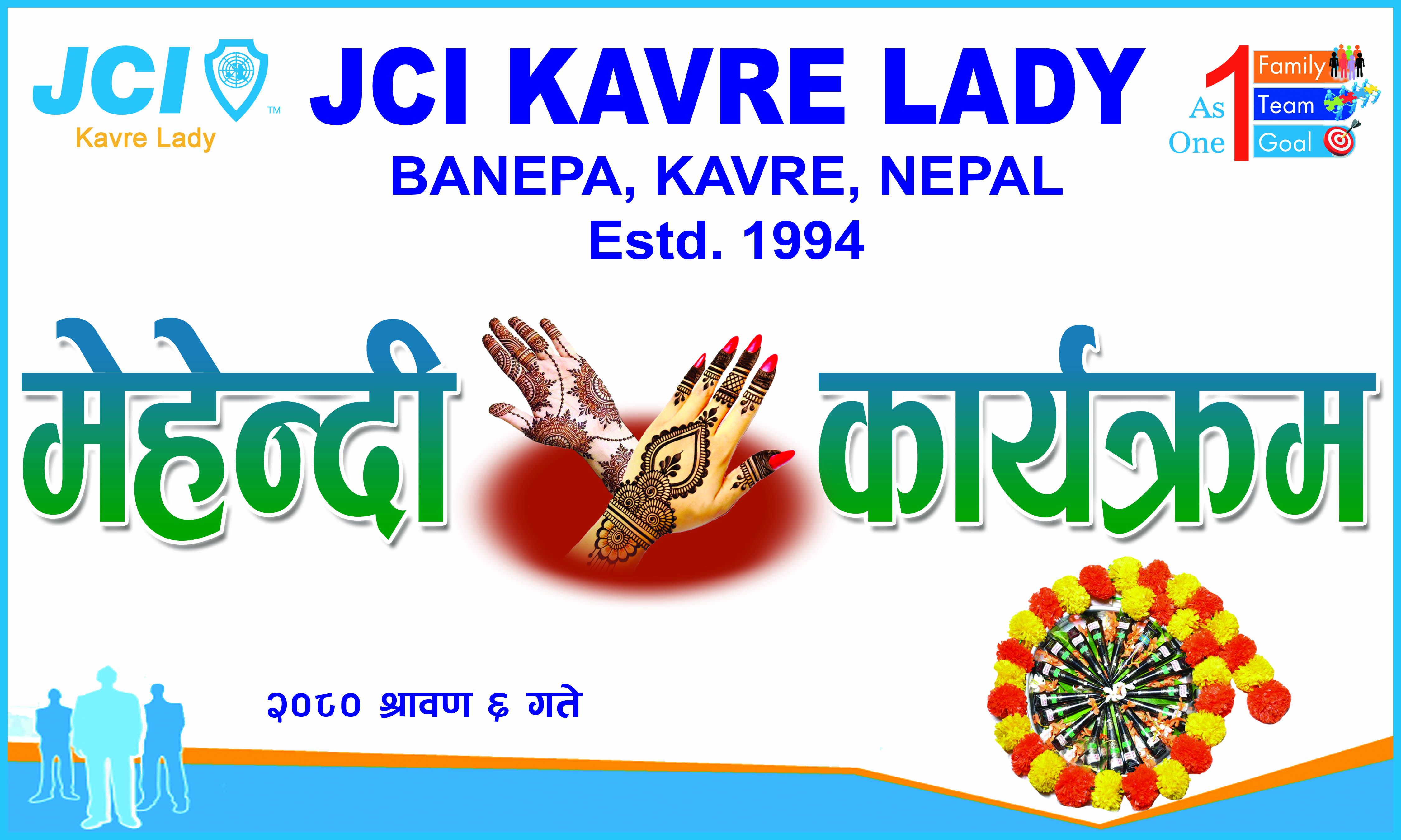 आज मिति २०८०/४/६ काभ्रे लेडी जेसीजको आयोजनामा भएको मेहेन्दी कार्यक्रम काभ्रे लेडी जेसिजका पूर्व अध्यक्ष जेसी रुबिना मकै श्रेष्ठज्यूको प्रमुख आतिथ्यतामा, काभ्रे लेडी जेसिज वर्ष २०२३ का अध्यक्ष जेसी बुद्ध लक्ष्मी मानन्धर ज्यूको सभापतित्वमा एवम् मातृशाखा काभ्रे जेसीज वर्ष २०२३ का अध्यक्ष जेसी सुमित मानन्धरज्यू, काभ्रे लेडी जेसिजका मानार्थ सदस्य तथा सौन्दर्य कला व्यवसाय संघका केन्द्रीय सह कोषाध्यक्ष लक्ष्मी श्रेष्ठज्यू , नेपाल जेसिजका राष्ट्रिय लेडी एकेडेमी संयोजक एवं काभ्रे लेडी जेसिजका नि.वर्तमान अध्यक्ष जेसी सुमित्रा श्रेष्ठ बाढेज्युको आतिथ्यतामा सम्पन्न भएको छ। उक्त कार्यक्रममा आफ्नो अमूल्य समय दिएर पाल्नु भएका काभ्रे लेडी जेसिज, काभ्रे जेसिजका पूर्व अध्यक्षज्यूहरु बोर्डका पदाधिकारी,सदस्यज्यूहरु तथा उपस्थित सम्पूर्णमा हार्दिक आभार एवं धन्यवाद व्यक्त गर्दछु ।