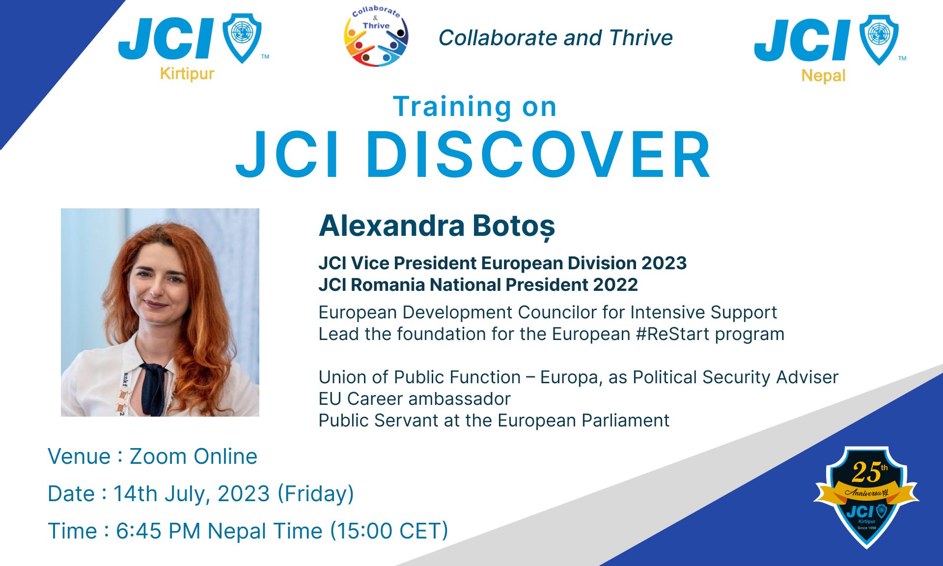 On July 14th, a training session on JCI Discover was conducted by JC Alexandra Botos, enlightening JCI members from across Nepal. The session aimed to enhance their understanding of JCI and its principles. Attendees gained valuable knowledge about JCI's mission, vision, and various opportunities for personal and professional development. The training proved to be an enriching experience, empowering members to further contribute to their communities and make a positive difference through JCI initiatives.