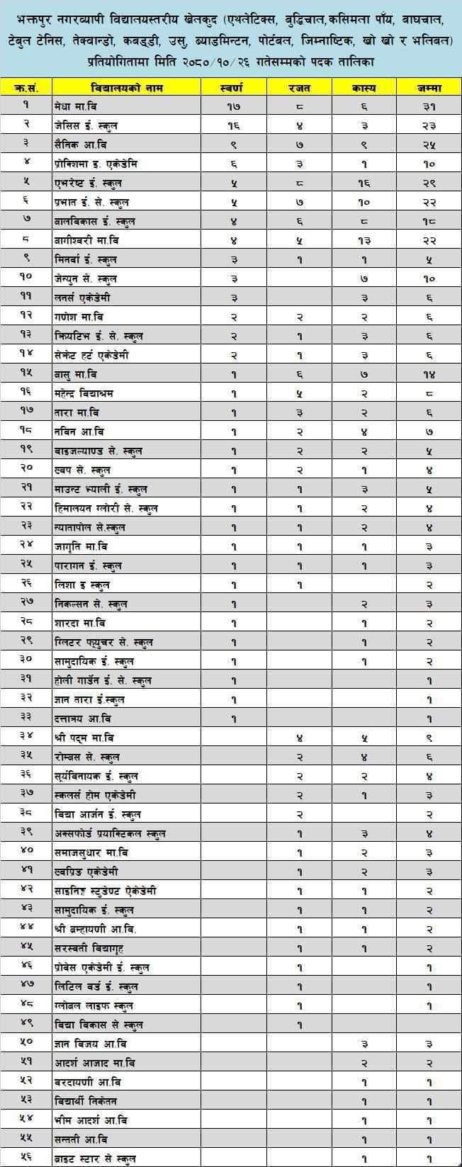 भक्तपुर नगरपालिका द्वारा आयोजना गरिएको भक्तपुर नगरव्यापी विद्यालय स्तरिय खेलकुद प्रतियोगितामा भक्तपुर जेसिज बाट सन्चालित जेसिज माध्यमिक विद्यालयले १६ वटा स्वर्ण, ४ वटा रजत तथा ३ वटा कास्य पदक हासिल गर्न सफल भएको छ । उक्त प्रतियोगितामा एथ्लेटिक्स्, बुद्धिचाल्, कसिमला पाँय, बाघचाल्, टेबुल टेनिस्, तेकवान्दो, कवड्डि, उसु, ब्याड्मिन्टन्, पोर्टबल्, जिम्न्यास्टिक्, खो खो र भलिबल जस्ता खेलहरु समावेश गरिएको थियो । उक्त प्रतियोगिता मा ७६ वटा विद्यालय हरु को सहभागिता रहेको थियो ।