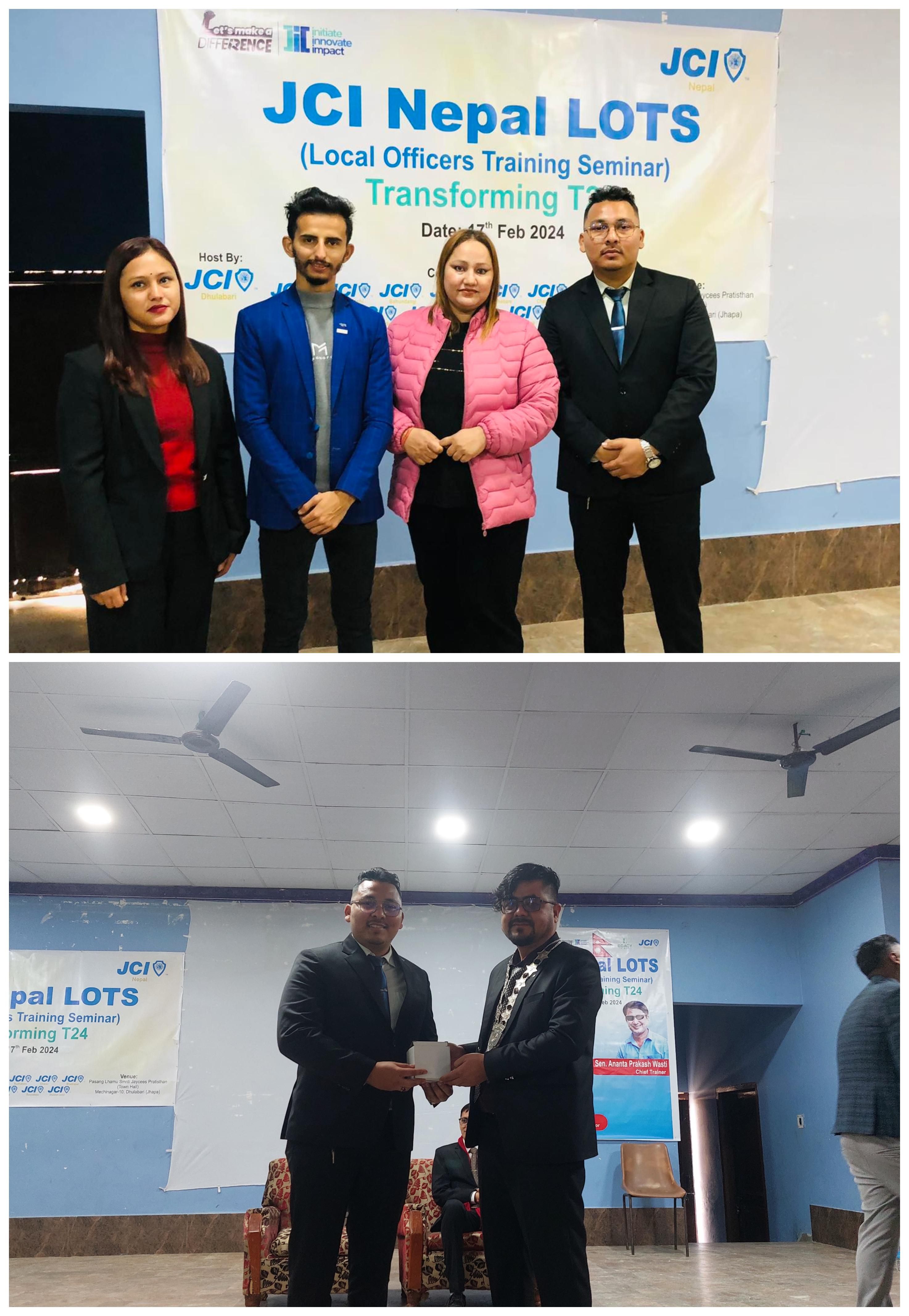 On February 17, 2024, JCI Surunga participated in the JCI Nepal Local Officers' Training Seminar (LOTS) along with 12 other LOMs from Area-A, hosted by JCI Dhulabari. The event took place at the Pashang Lhamu Smriti Jaycees Pratisthan (Townhall) in Mechinagar-10, Dhulabari, Jhapa, starting at 12 noon and lasting for approximately three and a half hours. The event aimed to enlighten participants about JCI and the roles, duties, and responsibilities associated with various posts within the organization.