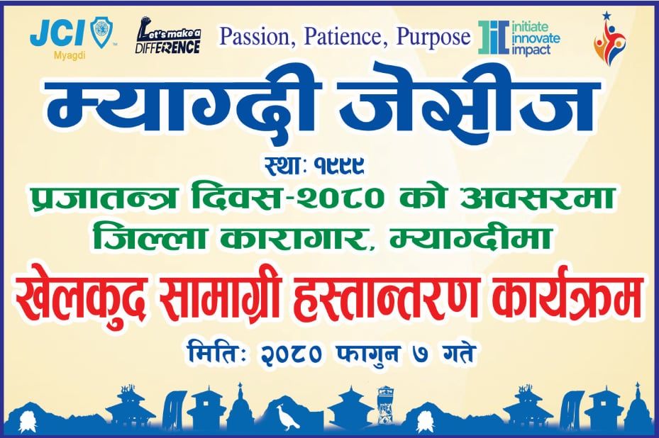 प्रजातन्त्र दिवस २०८० काे अवसर पारेर म्याग्दी जेसीजले जिल्ला कारागार म्याग्दीमा खेलकुद सामाग्री हस्तान्तरण गरिएकाे छ । साेमबार एक कार्यक्रमका बिच उक्त सामाग्री कारागारलार्इ हस्तान्तरण गरीएकाे हाे । वर्ष २०२४ का सह–काेषाध्यक्ष जेसी नविन पाैडेलकाे संयाेजकत्वमा सम्पन्न कार्यक्रममा शाखा अध्यक्ष जेसी. दिनेश बानियाँ ,पूर्व राष्टि्य अध्यक्ष सि.धनञ्जय कुमार श्रेष्ठ, पूर्व अध्यक्ष ज्युहरू लगायत म्याग्दी जेसीज वर्ष २०२४ का पदाधिकारीहरू र सदस्य ज्युहरूकाे उपस्थित रहेकाे थियाे ।