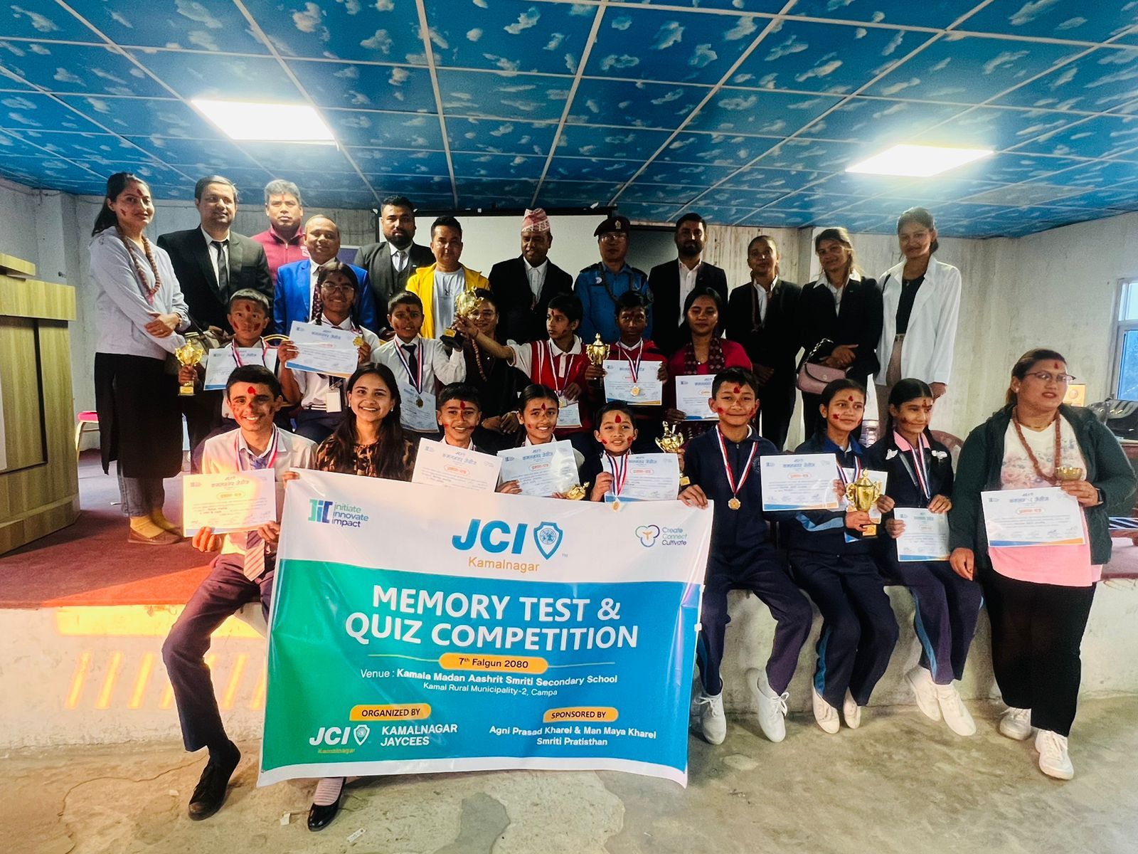 मिति २०८० फागुन ०७ गतेका दिन कमलनगर जेसिजको आयोजनामा अग्नि प्रसाद खरेल तथा मनमाया खरेल स्मृती प्रतिष्ठानको प्रायोजनमा कमल गाउँपालिका स्तरीय आधारभुत तहमा अध्ययनरत विद्यार्थीहरुका लागि कक्षा १ देखि ५ सम्म Memory Test र कक्षा ६ देखि ८ सम्मका लागि हाजिरीजवाफ प्रतियोगिता कार्यक्रम-कमलनगर जेसीज वर्ष २०२४ का अध्यक्ष जेसि देवी प्रसाद दाहाल ज्युको अध्यक्षतामा श्री कमला मदन आश्रित स्मृति माध्यमिक विद्यालय, कमल-२क्याम्पाको सभाहलमा सम्पन भएको छ। उक्त कार्यक्रममा प्रमुख अतिथी कमल गाउँपालिका श्रदेय् उपाध्यक्ष श्री प्रमिला न्याैपाने तिवारी ज्यु रहनुभएको थियो भने कार्यक्रमको संयोजक कमलनगर जेसीज वर्ष २०२४ का जन-सम्पर्क अधिकारी जेसी मनिषा कठायत ज्यु रहनु भएको थियो l