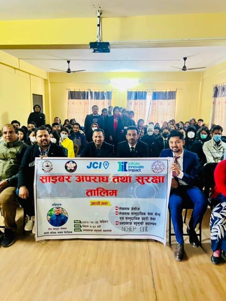 मिति २०८० माघ २५ गते तदनुसार 2024 February 8 का दिन लेखनाथ जेसीज, लेखनाथ सामुदायिक सेवा केन्द्र एवं सामुदायिक प्रहरी सेवा तथा जनप्रकाश बहुमुखी क्याम्पस NEHEP Unit संयुक्त सहकार्यमा Cyber crime and Security Training कार्यक्रम जनप्रकाश बहुमुखी क्याम्पसमा करिब ९० जनाको उपस्थितिमा सम्पन्न भएको छ। वडा नं २९ का वडाध्यक्ष श्री श्री प्रसाद गुरुङको प्रमुख आतिथ्यतामा समपन्न उक्त कार्यक्रममा क्याम्पस प्रमुख ऋषिराम बुढाथोकी, प्रहरी निरिक्षक याम नारायण अर्याल लगायतले शुभकामना मन्तव्य राख्नुभएको थियो। वरिष्ठ प्रहरी नायब निरिक्षक होतबहादुर रोक्का ज्युको प्रमुख प्रशिक्षणमा सम्पन्न कार्यक्रममा शशिस भट्टराई, स्मृती थापा लगायतले प्रशिक्ष्ण उत्कृष्ट रहेको बताउनुभयो। लेखनाथ जेसीज अध्यक्ष जेसी प्रकाश राई भाट, लेखनाथ सामुदायिक सेवा केन्द्र एवं सामुदायिक प्रहरी सेवाका अध्यक्ष कृष्ण अधिकारी तथा जनप्रकाश बहुमुखी क्याम्पस NEHEP युनिट संयोजक युवराज लामिछानेको संयुक्त सभाध्यक्षतामा सम्पन्न कार्यक्रममा कार्यक्रम संयोजक का. उपाध्यक्ष जेसी सुशील ढुंगानाले स्वागत मन्तव्य जु जेसी अध्यक्ष जु जेसी प्रान्जल पौडेलले आस्था पाठ तथा लेखनाथ सामुदायिक सेवा केन्द्र एवं सामुदायिक प्रहरी सेवा उपाध्यक्ष गङगा खनालले धन्यवाद मन्तव्य राख्नुभएको थियो भने कार्यक्रमको सन्चालन लेखनाथ जेसीजका महासचिव जेसी मौसम बरालले गर्नुभएको थियो।
