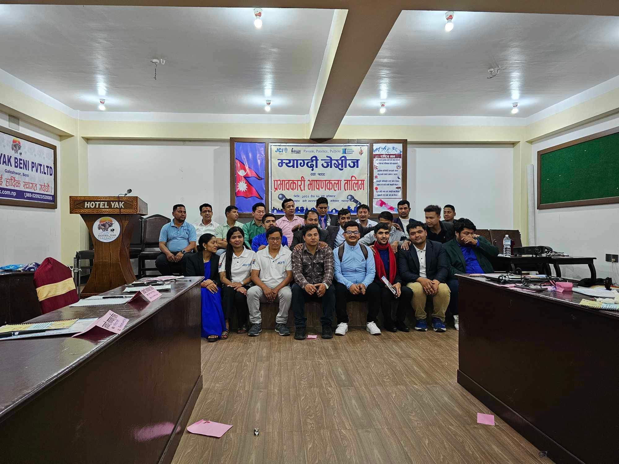 म्याग्दि जेसिज द्वारा आयोजित शाखा पदाधिकारी हरु को लागि प्रभावकारि भाषणकला तालिम बेनि नगरपालिका-९ अवस्थित होटेल याक मा सम्पन्न गरिएको छ! म्याग्दि जेसिज का शाखा अध्यक्ष जेसि दिनेश बानियाँ को अध्यक्षता, म्याग्दि जेसिज का पुर्व अध्यक्ष तथा नेपाल जेसिज का पुर्व राष्ट्रिय अध्यक्ष सिनेटर धनन्जय कुमार श्रेष्ठ को प्रमुख आतिथ्यता, म्याग्दि जेसिज का संस्थापक अध्यक्ष,बेनि नगरपालिका-७ का वडा अध्यक्ष तथा बेनि नगरपालिका का प्रबक्ता सिनेटर रमेश कुमार श्रेष्ठ को बिशिष्ट आतिथ्यता,म्याग्दि जेसिज का कार्यकारीणि उपाध्यक्ष जेसि कृष्ण प्रसाद पौडेल को स्वागत मन्तव्य रहेको कार्यक्रम को उद्घाटन समारोह को संचालन म्याग्दु जेसिज कि तालिम संयोजक जेसि धनमाया श्रेष्ठ र समापन समारोह को संचालन म्याग्दि जेसिज का महासचिव जेसि सज्जन श्रेष्ठ ले गरेका थिए!
