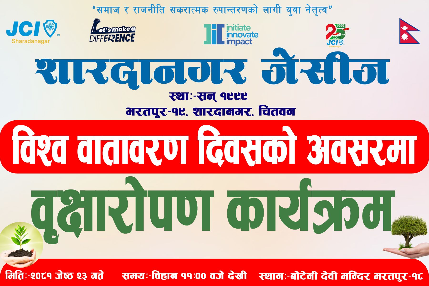आज मिति २०८१/०२/२३ गते तदनुसार 5th June 2024,बुधबार शारदानगर जेसिज द्वारा आयोजित बिश्व वातावरण दिवस को अवसर पारेर "हाम्रो भुमी हाम्रो भबिस्य"भन्ने मुलनारालाई आत्म साथ गर्दै भरतपुर १८स्थित बोटेनि देवि मन्दिर वरिपरि वृक्षारोपण कार्यक्रम शाखा अध्यक्ष जेसि भुवन सापकोटा ज्युको सभाध्यक्षता सम्पन्न गरियो।