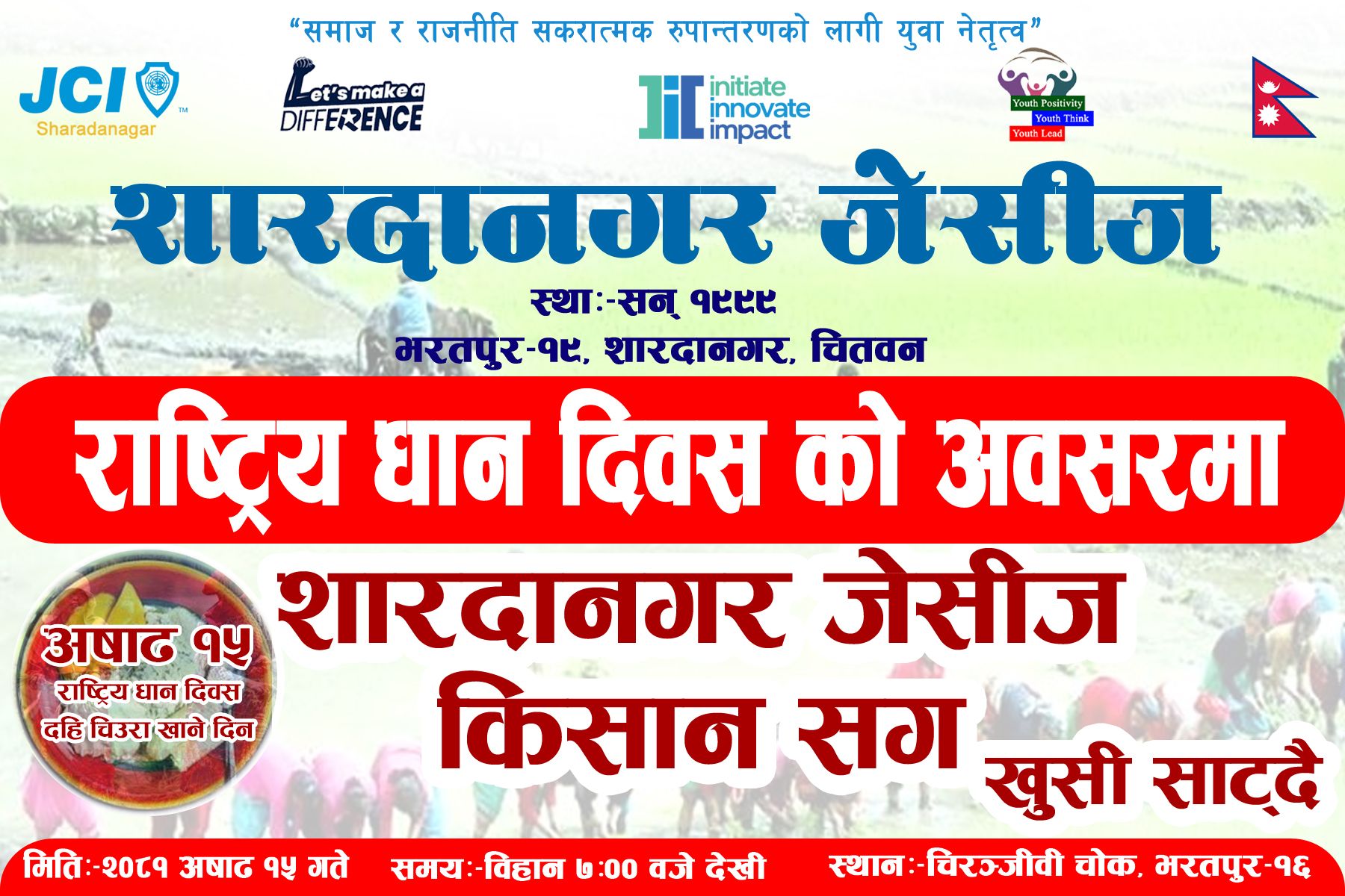 आज मिति २०८१/०३/१५ गते,तदअनुसार 29 June 2024शनिबारका दिन, शारदानगर जेसिज द्वारा आयोजित मानो रोपेर मुरि फलाउने दिन असार पन्ध्र ,धान दिवसको उपलक्ष्यमा" किसान सग शारदानगर जेसिज खुशी साटदै कार्यक्रम  "  शाखा अध्यक्ष जेसि भुवन सापकोटा ज्युको सभाध्यक्षतामा  सु सम्पन्न भएको थियो ।