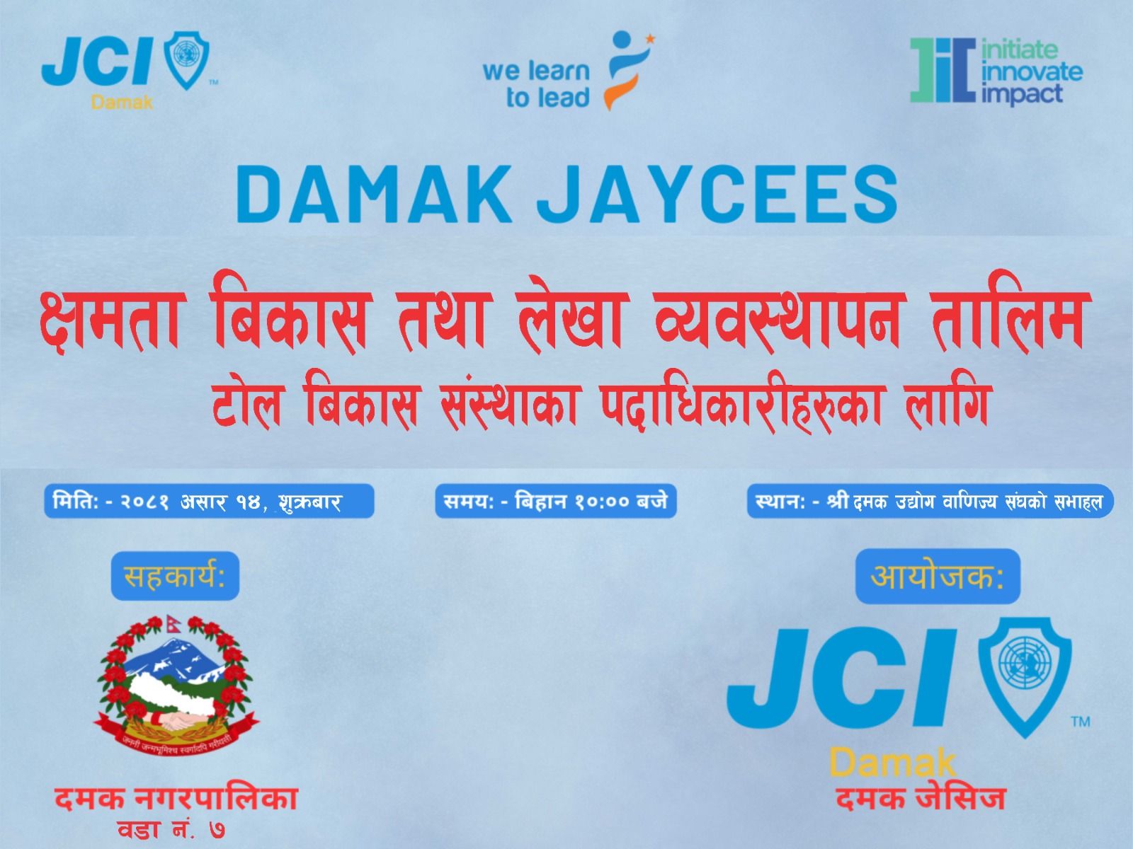 • Trainer: Govindaraj Kattel MTOT Graduate JCI NEPAL