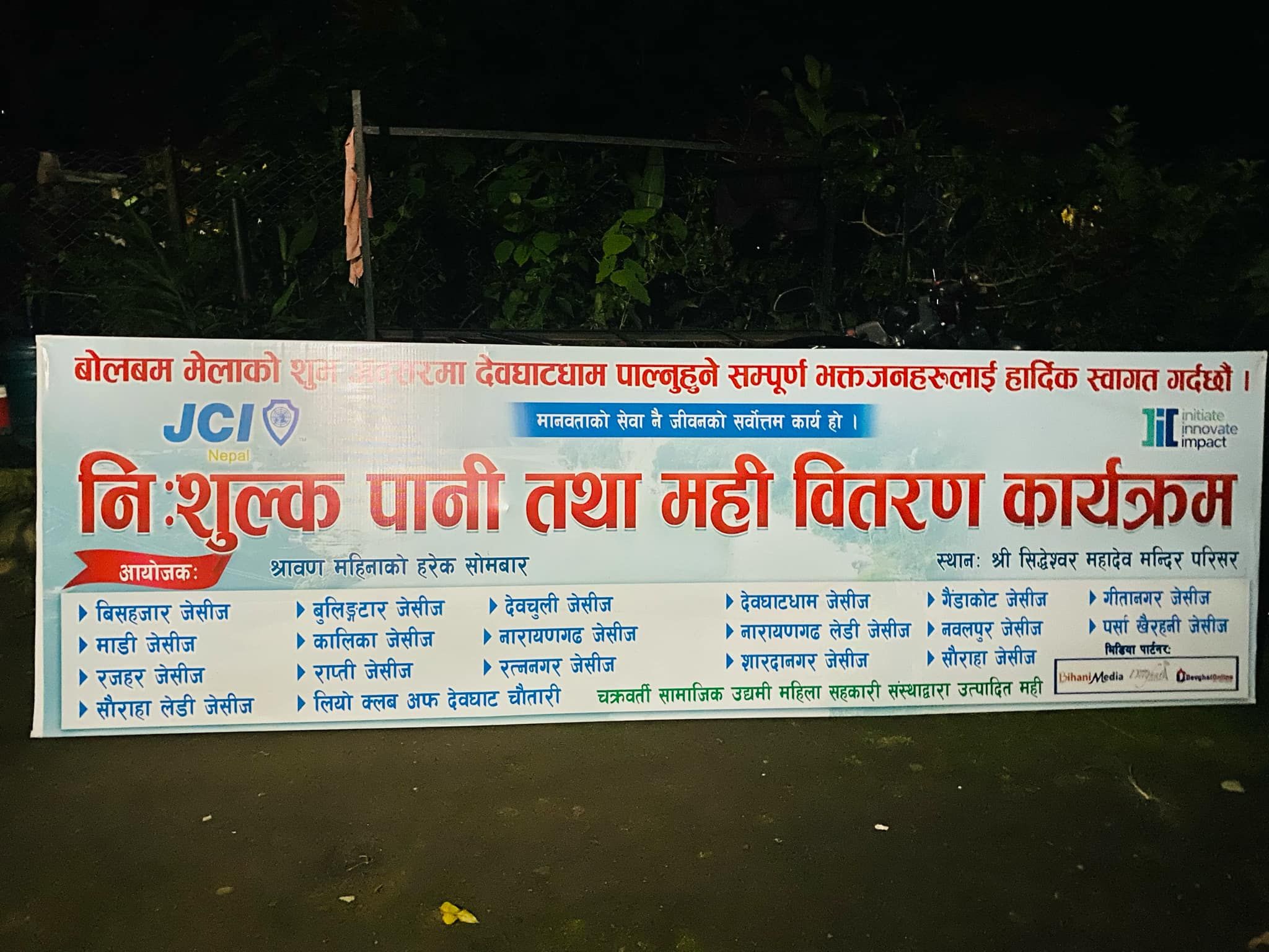 देवघाटधाममा भोली सोमबार बाट सुरु हुने बोलवम मेलामा आउने भक्तजनलाई देवघाटधाम जेसिजको संयोजनमा निशुल्क पानी तथा मही वितरण गरिने भएको छ ।