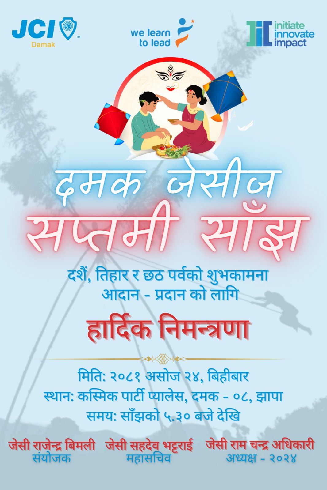 दमक जेसिसको आयोजनामा सप्तमी साँझ तथा शुभकामना आदानप्रदान कार्यक्रम सम्पन्न भएको छ। दमक नगरपालिकाका नगरप्रमुख रामकुमार थापाको प्रमुख अतिथ्यतामा भएको कार्यक्रममा विशिष्ट अतिथि नगर उपप्रमुख तथा पूर्व अध्यक्ष रेगीना भट्टराई प्रसाई ,राष्ट्रिय युवा परिषद् का उपाध्यक्ष सुरेन्द्र बस्नेत, राजनीतिक दलका नेतृत्वहरू र दमकमा रहेका विभिन्न संघसंस्थाहरू बाट आतिथ्यता रहेको कार्यक्रममा नेपाल जेसिसका राष्ट्रिय कार्यकारी उपाध्यक्ष भीमबहादुर कुँवर, राष्ट्रिय उपाध्यक्षहरू जेसी बहादुर तामाङ, जेसी योगेश राजबंशी, जेसी घनश्याम चौधरी नेपाल जेसिसका पूर्व राष्ट्रिय अध्यक्ष जेसी आई सिनेटर प्रकाश प्रसाद अधिकारी ज्यू,विभिन्न शाखा अध्यक्षज्यूहरू, सिनेटर ज्यूहरू दमक जेसिसका पूर्व अध्यक्ष ज्यूहरु को आतिथ्यता रहेको थियो। कार्यक्रममा नेपाली कांग्रेसका नगर अध्यक्ष तथा दमक जेसिसका पूर्व महासचिव प्रकाश प्रसाई, नेकपा एमालेका दमक नगर अध्यक्ष राम पौडेल, नेकपा माओवादी केन्द्रका नगर अध्यक्ष कुलबहादुर बस्नेत रवि, राप्रपाका नगर अध्यक्ष हेम सुवेदी, दमक बहुमुखी क्याम्पसका सञ्चालक समिति अध्यक्ष ढुण्डिराज भण्डारी ज्यूहरूले शुभकामना मन्तव्य राख्नुभएको थियो। सप्तमी साँझमा सांगीतिक तथा मनोरञ्जनात्मक कार्यक्रम समेत भएको थियो । दमक जेसिसका अध्यक्ष जेसी रामचन्द्र अधिकारी ज्यूको सभापतित्वमा भएको कार्यक्रम को कार्यक्रमको संयोजक जेसी राजेन्द्र बिमली रहनुभएको थियो। २५० जना भन्दा बढीको उपस्थिति रहेको कार्यक्रम दमक जेसिसका महासचिव जेसी सहदेव भट्टराई ज्यूले सञ्चालन गर्नुभएको थियो।