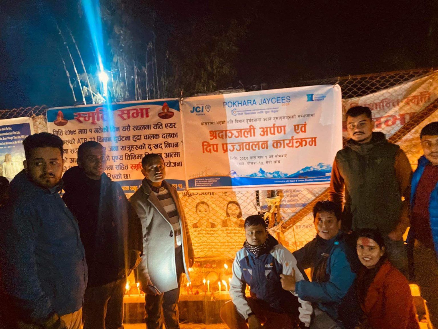 बि.स. २०७९ साल माघ १ गते पोखरामा भएको यति बिमान दुर्घटनामा ज्यान गुमाउनु भएका चालक दलका सदस्यहरू सहित जम्मा ७२ जना नागरीकहरूकोसंझनामा मिति २०८० साल माघ १ गते पोखरा जेसीजको नेतृत्वमा स्थानिय सामाजीक संघसंस्थाहरू संगको सहकार्यमा दुर्घटना स्थल, पोखरा १५ सेतिखोचमा दिप प्रज्वलन तथा श्रध्दाञ्जलि अर्पण कार्यक्रम सम्पन्न भएको छ।