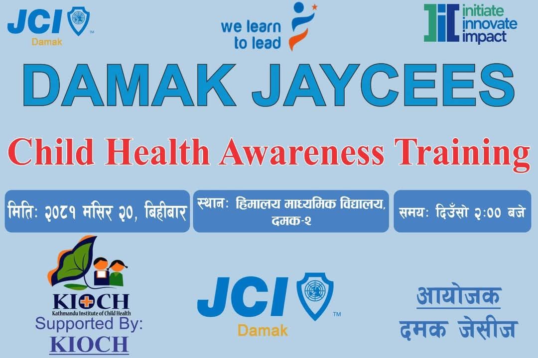 दमक जेसीजको जेसीज सप्ताह २०२४ अन्तर्गत। Child Health Awareness Training कार्यक्रम श्री हिमालय माध्यमिक विद्यालय दमक २ मा अध्ययनरत २०० भन्दा बढी विद्यार्थी तथा अभिभावकज्यूहरू को सहभागितामा सम्पन्न भएको छ। KIOCH अस्पताल दमक सँगको सहकार्यमा भएको उक्त तालिमको प्रमुख प्रशिक्षक डाक्टर सुनिल अधिकारी रहनुभएको थियो। चिसो, मौसम बदली र अन्य जोखिमहरूबाट बालबालिकाहरूलाई जोगाउन सकिने उपायहरूका बारेमा तालिम दिएको थियो। उक्त कार्यक्रमको संयोजक जेसी सन्ध्या बराल, प्रमुख अतिथि वडा अध्यक्ष प्रजापति सापकोटा,विशिष्ट अतिथिहरूमा वडा सदस्य ललितबहादुर बिक, प्रधानाध्यापक द्रोण कुमार श्रेष्ठ रहनुभएको थियो। वक्ताहरूले दमक जेसिज तथा KIOCH अस्पताल दमकले विद्यार्थी तथा अभिभावक लक्षित यस्ता किसिमका कार्यक्रमहरू आयोजना गरेकोमा धन्यवाद ज्ञापन गर्नुभएको थियो। कार्यक्रमको अध्यक्षता दमक जेसिजका अध्यक्ष जेसी रामचन्द्र अधिकारीज्यूले गर्नुभएको थियो।