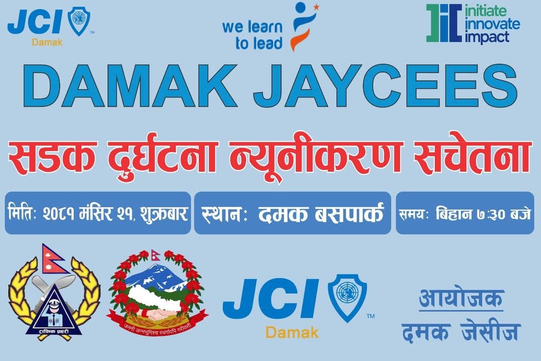 दमक जेसिजको जेसिज सप्ताह २०२४ अन्तर्गत सडक दुर्घटना न्यूनीकरण सचेतना कार्यक्रम,ट्राफिक प्रहरी कार्यालय,दमक नगरपालिका वडा नम्बर ६ सँगको सहकार्यमा दमक बसपार्कमा सम्पन्न भएको छ। बढ्दो सडक विस्तार र मर्मत, नगरभित्र बढ्दो सिटी सफारी हरूका कारण हुन सक्ने सम्भावित दुर्घटनाहरूको न्यूनीकरणका लागि विशेषत चालकहरूका लागि सचेतनामूलक कार्यक्रम आयोजना गरिएको थियो। औपचारिक कार्यक्रमको प्रमुख अतिथि वडा नम्बर ६ का वडाध्यक्ष टेकबहादुर थापा ज्यूले बसपार्कलाई व्यवस्थित गर्न का साथै चालकहरूलाई सचेतनामूलक प्रशिक्षणको जरुरी रहेको कुरा बताउनुभयो। ट्राफिक प्रहरी कार्यालय दमक का प्रमुख नारायण भट्टराई ज्यूले बसपार्कमा रहेका करिब १५० भन्दा बढी सिटी सफारी तथा अन्य सवारीका चालकहरूलाई दुर्घटना न्यूनीकरणका बारे प्रशिक्षण दिनुभयो। कार्यक्रममा साथीभाइ समूह दमकका संस्थापक अध्यक्ष गङ्गा सिटौला पूर्व अध्यक्ष चन्द्र खत्री, कमल कटवाल, सञ्जीव बराल लगायतको उपस्थिति रहेको थियो। जेसी धर्म ढुङ्गाना संयोजक रहेको उक्त कार्यक्रम को सभापतित्व दमक जेसिजका अध्यक्ष जेसी रामचन्द्र अधिकारीज्यूले गर्नु भएको थियो।