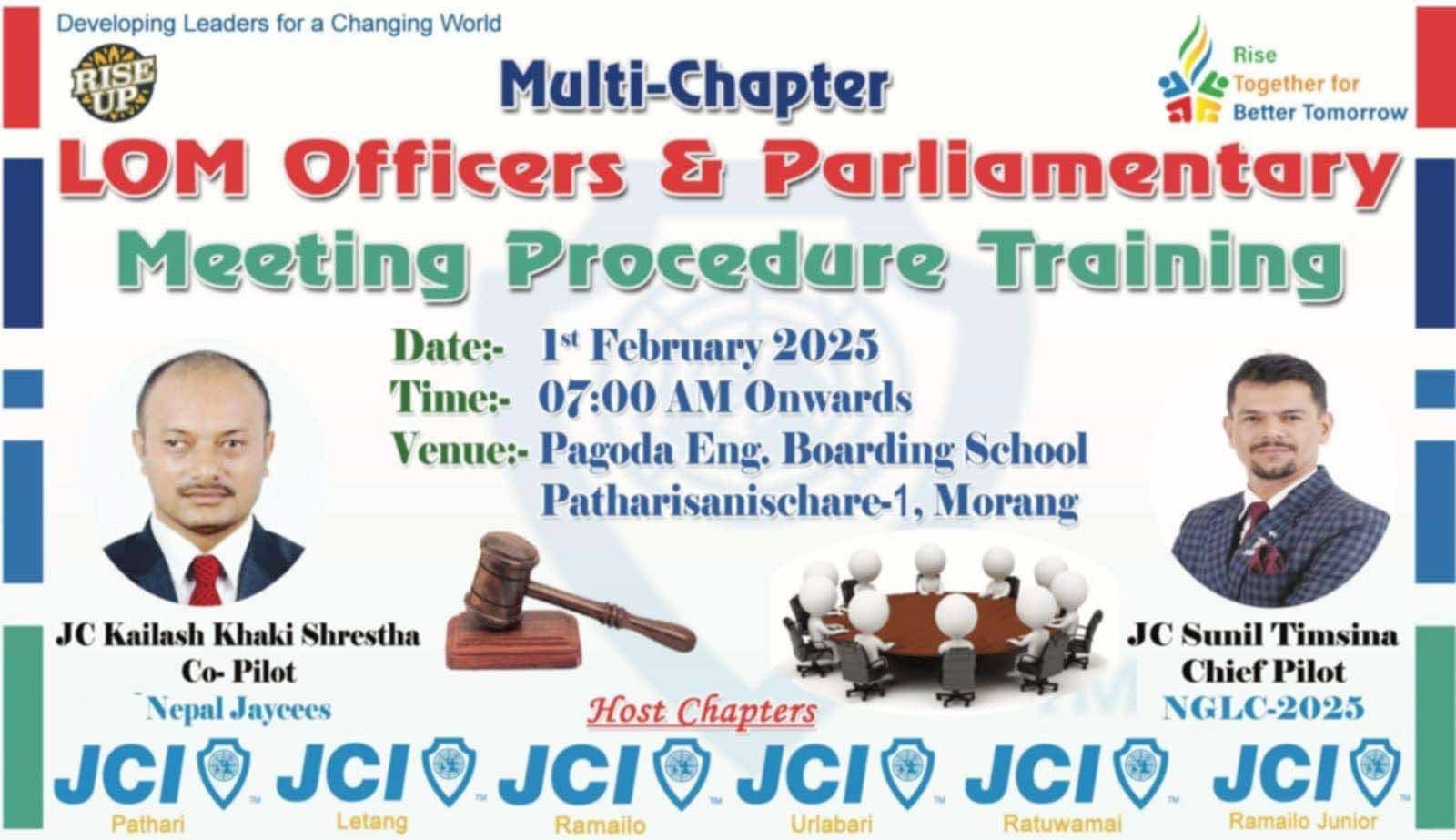 पथरी जेसिजको आतिथ्यता तथा उर्लाबारी जेसिज, रमाइलो जेसिज, रतुवामाई जेसिज, लेटाङ जेसिज, रमाइलो जुनियर जेसिजको संयुक्त आयोजनामा एक दिवसिय Multi chapter LOM officers and Parliamentary meeting procedure training सप्पन्न भएको छ। उर्लाबारी जेसिजको तर्फबाट बर्ष २०२५का अध्यक्ष जेसि टीका प्रसाद भट्टराई लगायत २० जना पदाधिकारीहरुको सक्रिय सहभागिता रहेको थियो ।