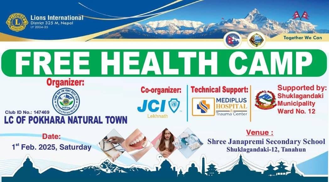 जेसीआइ लेखनाथको सहअयोजना तथा लायन्स क्लब अफ पोखरा नेचुरल टाउनको आयोजना, मेडिप्लस अस्पताल रानिपौवाको प्राविधिक सहयोग तथा शुक्लागण्डकी नगरपालिका फिरफिरे तनहुँ वडा न १२ को सहकार्यमा मिति २०८१/१०/ १९ गते शनिवार शु न पा १२ को जनप्रेमी मा वि को प्राङ्गणमा निशुल्क स्वास्थ्य परिक्षण कार्यक्रम सप्पन्न ।