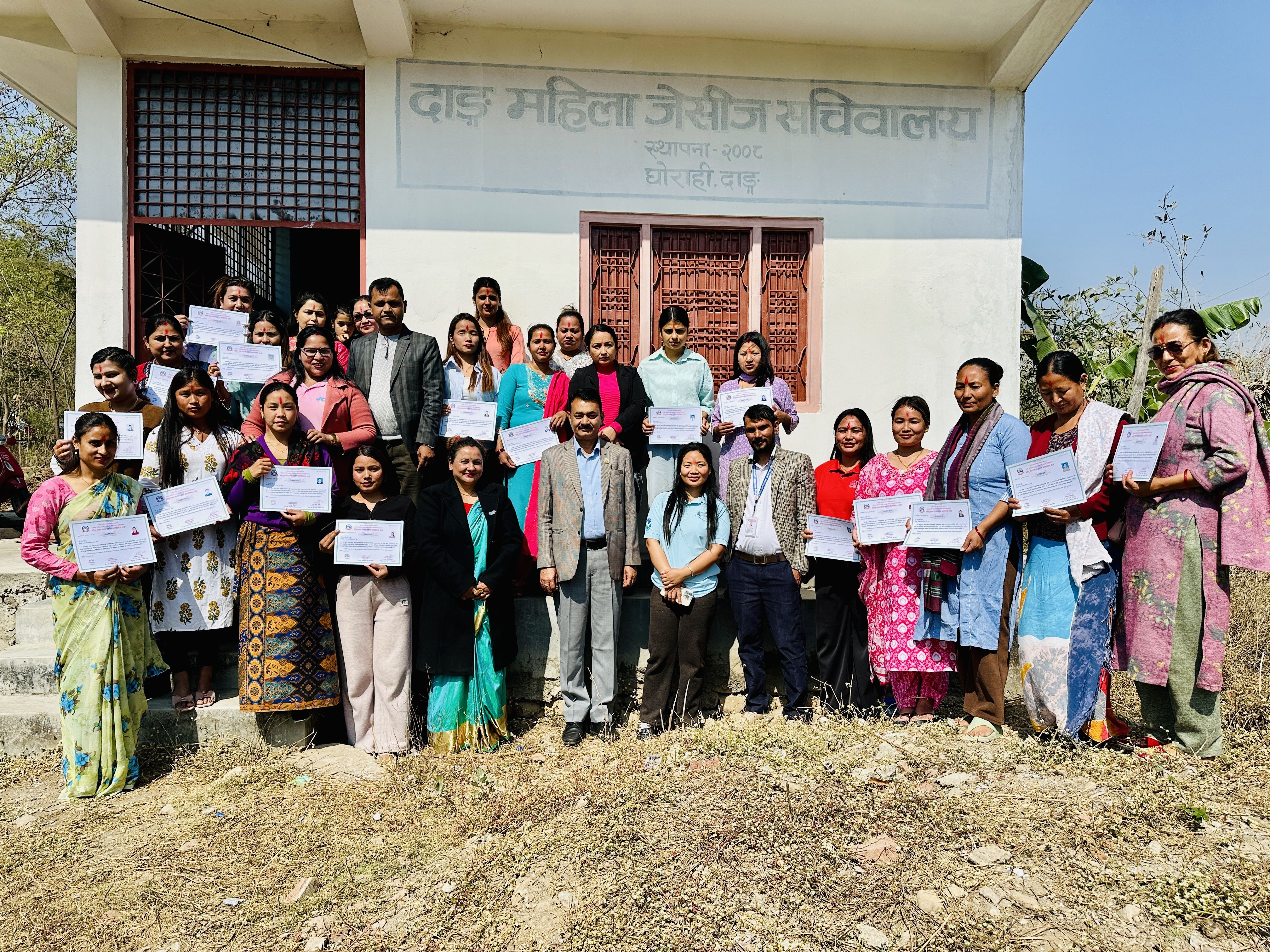 मिति २०८१-११ -२१ गते घरेलू तथा साना उद्योग दा ङ आयोजना तथा दाङ महिला जेसीजको सहजीकरण मा लुम्बिनी प्रदेश सभा सदस्य सांसद माननीय राजु खनाल द्वारा दाङ महिला जेसीजका लागि आर्थिक वर्ष २०८१/०८२ मा आयमूलक सिप को लागि विनियोजित रकम बाट सञ्चालित ४५ दिने बुटीक तालीम को समापन कार्यक्रम सम्पन्न गरियो ।