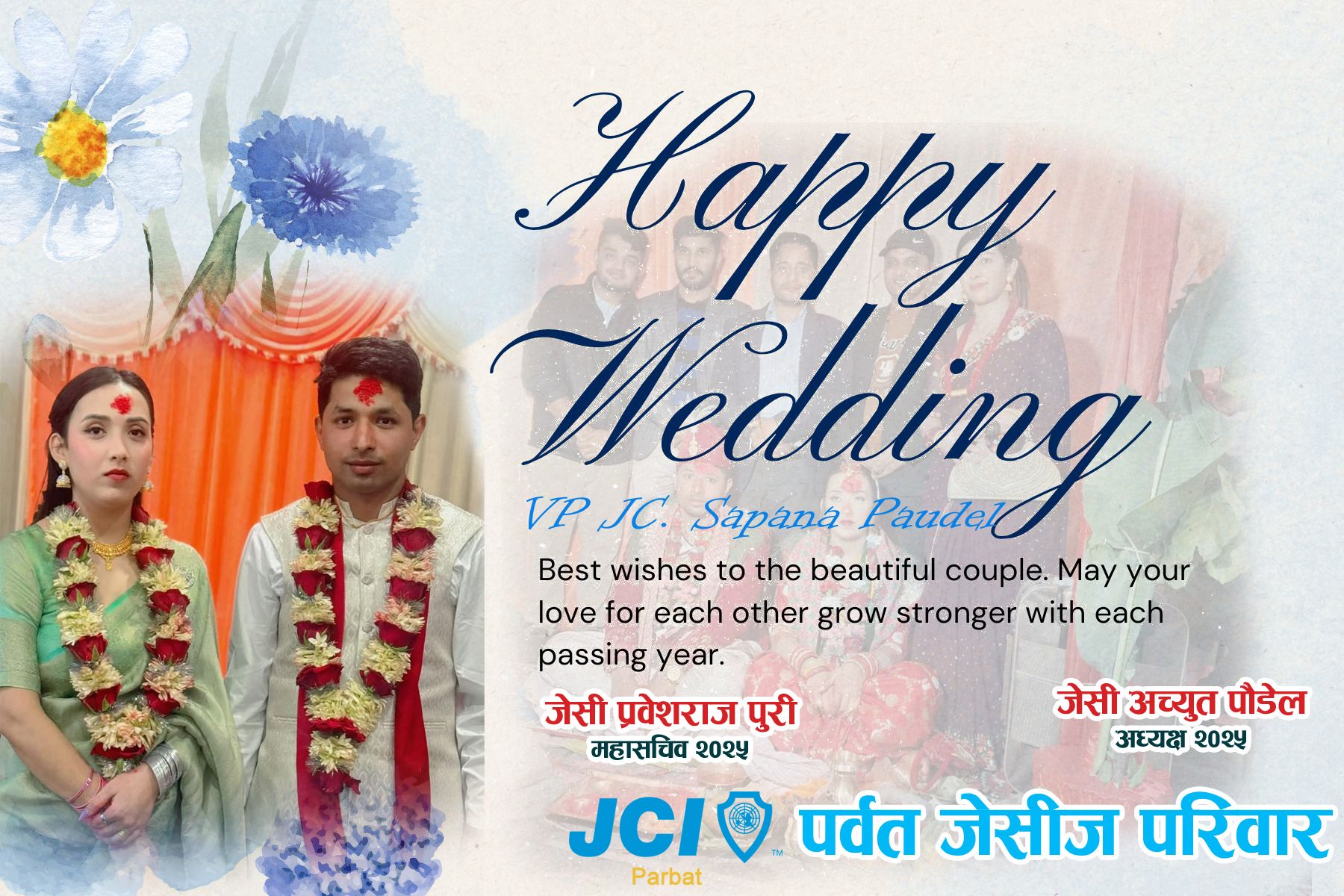 तपाईंहरूको नयाँ यात्रा प्रेम, विश्वास, र समझदारीले भरिपूर्ण रहोस्। पारिवारिक सुख, आपसी समझदारी, र जीवनभरको साथ मिलिरहोस्। जीवनको यो नयाँ अध्याय हर्षोल्लास, सफलताको उज्यालो, र अमूल्य सम्झनाहरूले सजियोस्। यस अवसरमा पर्वत जेसीज वर्ष २०२५ का शाखा अध्यक्ष जेसी अच्यूत पौडेल, निवर्तमान अध्यक्ष जेसी मिलन पौडेल, पूर्व अध्यक्ष एवम् बोर्ड अफ ट्रस्टिजका समंयोजक सिनेटर विषम कुमार श्रेष्ठ, महासचिव जेसी प्रवेश राज पुरी, सह-कोषाध्यक्ष जेसी विजन कुमार श्रेष्ठ, निर्देशक जेसी अजय पोखरेललगाएतको उपस्थितिमा नवदम्पतीलाई शुभकामना प्रदान गर्दछौं ।