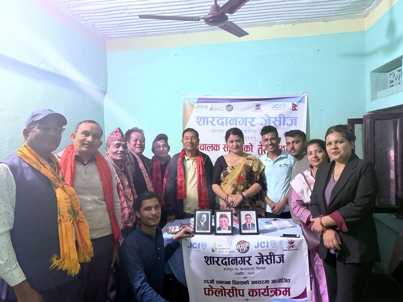 शारदानगर जेसिज स्थापना दिवशको उपलक्ष्यमा फेलोसिप कार्यक्रम सम्पन्न । मिति २०८१/१२/२० तदानुसार 2April 2025बुधबार को दिन शारदानगर जेसिजको सचिवालयमा शारदानगर जेसिज द्वारा आयोजित शारदानगर जेसिज २६औ वसन्त पार गरेको उपलक्ष्यमा फेलोशिप कार्यक्रम अध्यक्ष जेसि लक्ष्मी के.सि ज्युको अध्यक्षतामा र प्रमुख अतिथि शारदानगर जेसिजका धरोहर बर्ष २००६का शाखा अध्यक्ष एवम बोर्ड अफ टसटिजका कोषाध्यक्ष आदरणीय समाजसेवी ब्याक्तित्व श्री तन बहादुर पुन ज्युको प्रमुख आतिथ्यता र विशिस्ट अतिथि वर्ष २०११का शाखा अध्यक्ष एवम नेपाल जेसिज बर्ष २०१६का तालिम आयुक्त एवम प्रमुख अध्यक्ष सल्लाहकार एवम नेपाल जेसिज वर्ष २०२५का रास्ट्रिय अध्यक्ष सल्लाहकार आदरणीय ब्याक्तित्व जेसि सोम प्रसाद भण्डारी ज्युको विशिस्ट आतिथ्यतामा सम्पन्न उक्त कार्यक्रममा शारदानगर जेसिजका धरोहर पुर्व अध्यक्षज्युहरु ज्यु हरुमा बर्ष २००९का शाखा अध्यक्ष श्री तुलसीराम पाण्डे ज्यु र बर्ष २०१३का शाखा अध्यक्ष श्री गुन्जमान वि.क ज्यु र निबर्तमान अध्यक्ष जेसि भुवन सापकोटा ज्यु अतिथि ज्युहरुमा आदरणीय समाजसेवी ब्याक्तित्व श्री कमल सुवेदी ज्यु र शारदानगर जेसिजका अध्यक्ष ज्युका प्रथम पुरुष आदरणीय समाजसेवी ब्याक्तित्व श्री राजु के सि ज्युको गरिमामय उपस्थिति रहेको थियोे भने बोर्डका पदाधिकारी ज्युहरु र सदस्यज्युहरुको उपस्थितिमा स्थापना दिवशमा केक काटेर पुर्ब अध्यक्षज्यु हरु र बोर्डका पदाधिकारी ज्यु हरु बिच १९९९देखि हाल सम्म शारदानगर जेसिजमा भए गरेका सम्पूर्ण गतिविधि हरु र शारदानगर जेसिजको गर्बिलो इतिहासको बारेमा अन्तर्किया कार्यक्रम सम्पन्न भएको थियो।उक्त कार्यक्रम संयोजक एवम कार्यक्रम संचालक जेसि दिपेश आचार्य रहनुभएको थियो भने सस्थाका उपाध्यक्ष जेसि अञ्जली बरुवाल ज्युले आस्था पाठ वाचन गर्नु भएको थियो । सम्पूर्ण पुर्ब अध्यक्ष ज्युहरु र बोर्डका पदाधिकारी ज्युहरुको उपस्थितिमा कार्यक्रम भब्य र सब्यताको साथमा सु -सम्पन्न भएको थियो ।