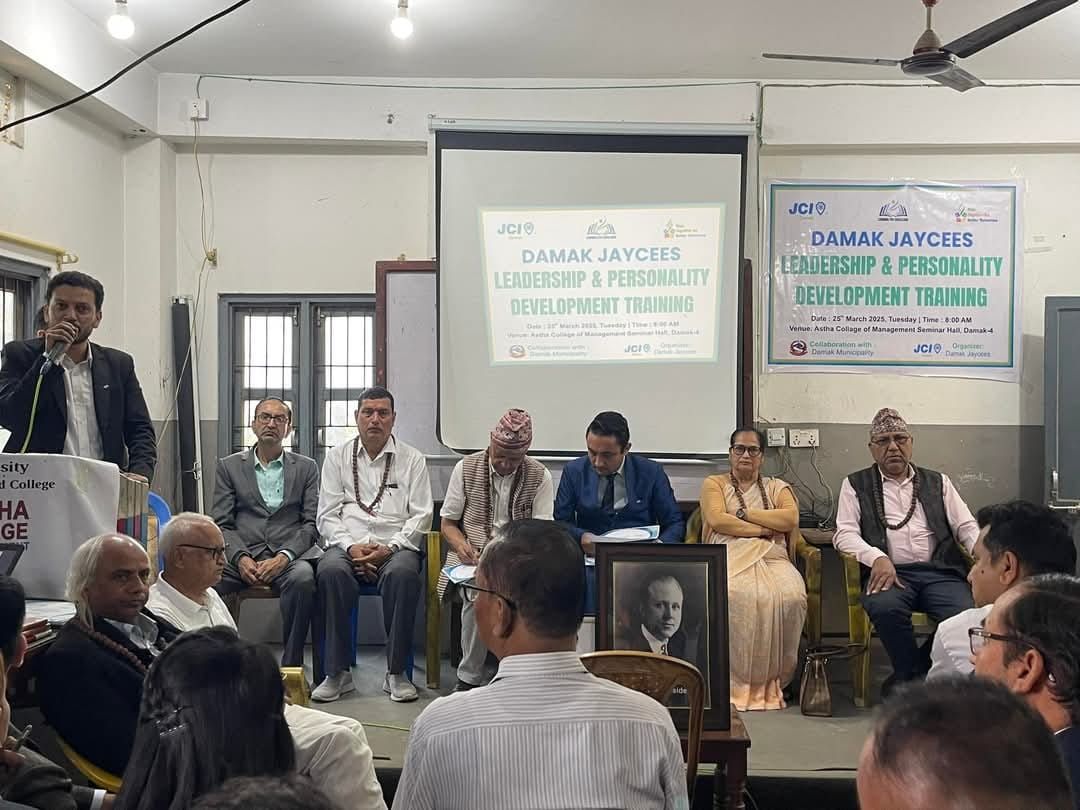 २०८१ साल चैत्र १२ गते मंगलबारका दिन दमक जेसीजको आयोजना तथा दमक नगरपालिकाको सहकार्यमा ‘LEADERSHIP & PERSONALLY DEVELOPMENT TRAINING’ कार्यक्रम आस्था कलेज अफ मेनेजमेन्ट दमकको सभा हलमा दमक नगरपालिकाका कार्यबाहक नगरप्रमुख आदर्णिय भीम प्रसाद पौडेलज्यूको प्रमुख आतिथ्यतामा सम्पन्न गरियो ।कार्यक्रमको अध्यक्षता दमक जेसीज बर्ष २०२५ का अध्यक्ष जेसी सहदेब भट्टराईज्यूले गर्नुभएको थियो ।कार्यक्रममा बिशेष अतिथि दमक नपाको सामाजिक बिकास समिति संयोजक तथा कार्यपालिका सदस्य आदरणीय शारदा भट्टराईज्यू, अतिथिहरू आस्था कलेज अफ मेनेजमेन्टका अध्यक्ष बलभद्र कोइरालाज्यू, एकता एकेडेमीका अध्यक्ष टंक सिटौलाज्यू, आस्था कलेजका सहायक क्याम्पस प्रमुख टिकाराम अधिकारीज्यू, दमक नपा सामाजिक बिकास शाखाका अधिकृत केशब प्रसाद प्रसाईज्यू, चन्द्रसूर्य सिप बिकास संस्थाका प्रबन्धक बिष्णु प्र.अधिकारीज्यू, दमक नपा ७ नं वडाका वडासदस्य जेसी अतित बान्तावा राई्ज्यू, दमक जेसीजका पूर्ब अध्यक्षहरू जेसी कमल कट्वालज्यू, जेसी नरेन्द्र बरालज्यू, जेसी नित्यनन्द ताजपुरियाज्यू, जेसिआई सिनेटर घनश्याम कोईरालाज्यू, जेसी गोबिन्दराज कट्टेलज्यू तथा निबर्तमान अध्यक्ष जेसी रामचन्द्र अधिकारीज्यू लगायतको उपस्थिति रहेको थियो ।कार्यक्रममा प्रमुख प्रशिक्षक गौरादह जेसीजका निबर्तमान अध्यक्ष तथा नेपाल जेसीज बर्ष २०२५ का Area A Training Coordinator जेसी खड्ग थापाज्यूले आस्था कलेज बिबिएस प्रथम बर्षका ८५ जनाभन्दा बढी बिध्यार्थीहरूलाई प्रशिक्षण गराउनुभएको थियो। कार्यक्रम दमक जेसीजका तालिम निर्देशक जेसी कृष्ण भट्टराईको संयोजकत्वमा भएको थियो भने कोषाध्यक्ष जेसी सरोज ढकालले जेसीज आस्था बाचन गर्नुभएको थियो । यसरी आजको तालिम कार्यक्रम सफलतापूर्बक सम्पन्न गरी समापन गरियो ।