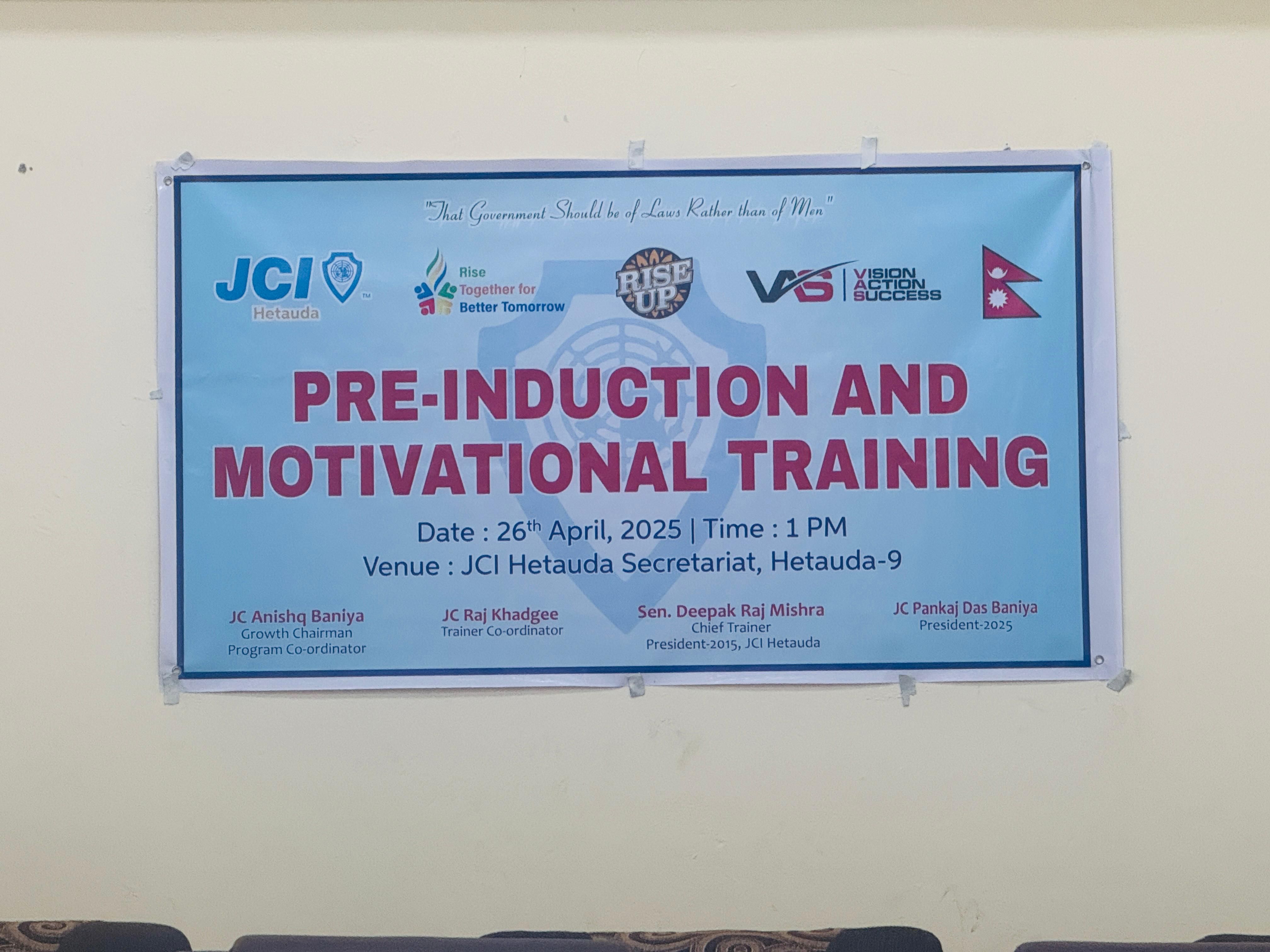 हेटौंडा जेसीजको आयोजनामा २०८२ बैशाख १३ गते शनिबार प्रि–इण्डक्सन एण्ड मोटिभेशनल तालिम कार्यक्रम सम्पन्न भएको । हेटौंडा जेसीजको सचिवालय हेटौंडा–९ मा सम्पन्न तालिम हेटौंडा जेसीज वर्ष २०२५ का अध्यक्ष पंकज दास बानियाँको सभाध्यक्षता एवम् हेटौंडा जेसीज वर्ष १९८१ का शाखा अध्यक्ष अंगदप्रसाद श्रेष्ठको प्रमुख आतिथ्यतामा भएको हो ।