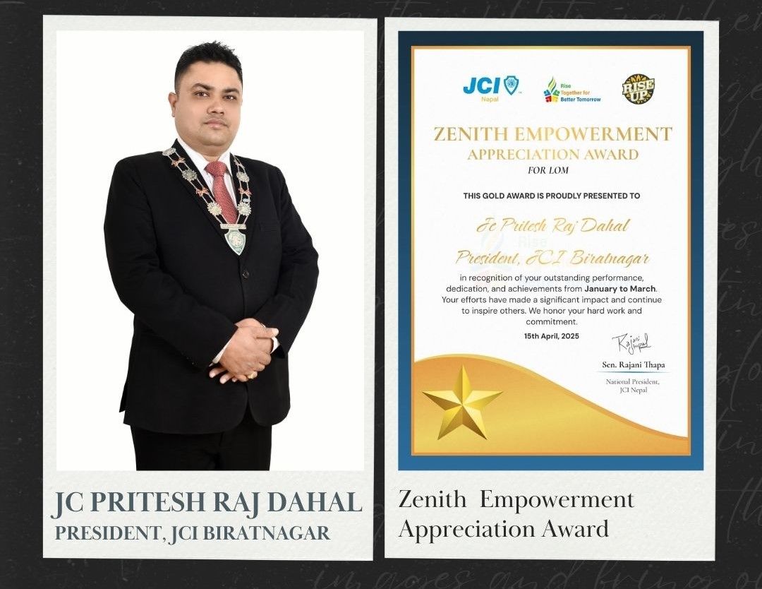 विराटनगर जेसीजका अध्यक्ष जेसी प्रितेश राज दाहालज्यूलाई नेपाल जेसीजद्वारा प्रदान गरिने ZENITH EMPOWERMENT GOLD AWARD बाट सम्मान गरिएको छ।