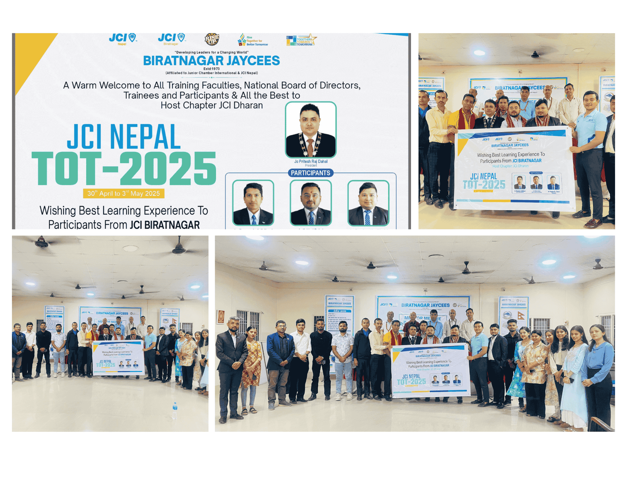 विराटनगर, वैशाख १७ – २०८२ वैशाख १६ गते (अप्रिल २९, २०२५) का दिन विराटनगर जेसीजले जेसिआई नेपाल TOT–2025 मा सहभागी हुन जाने सदस्यहरूलाई बिदाइ तथा शुभकामना दिन विशेष कार्यक्रमको आयोजना गर्यो।
