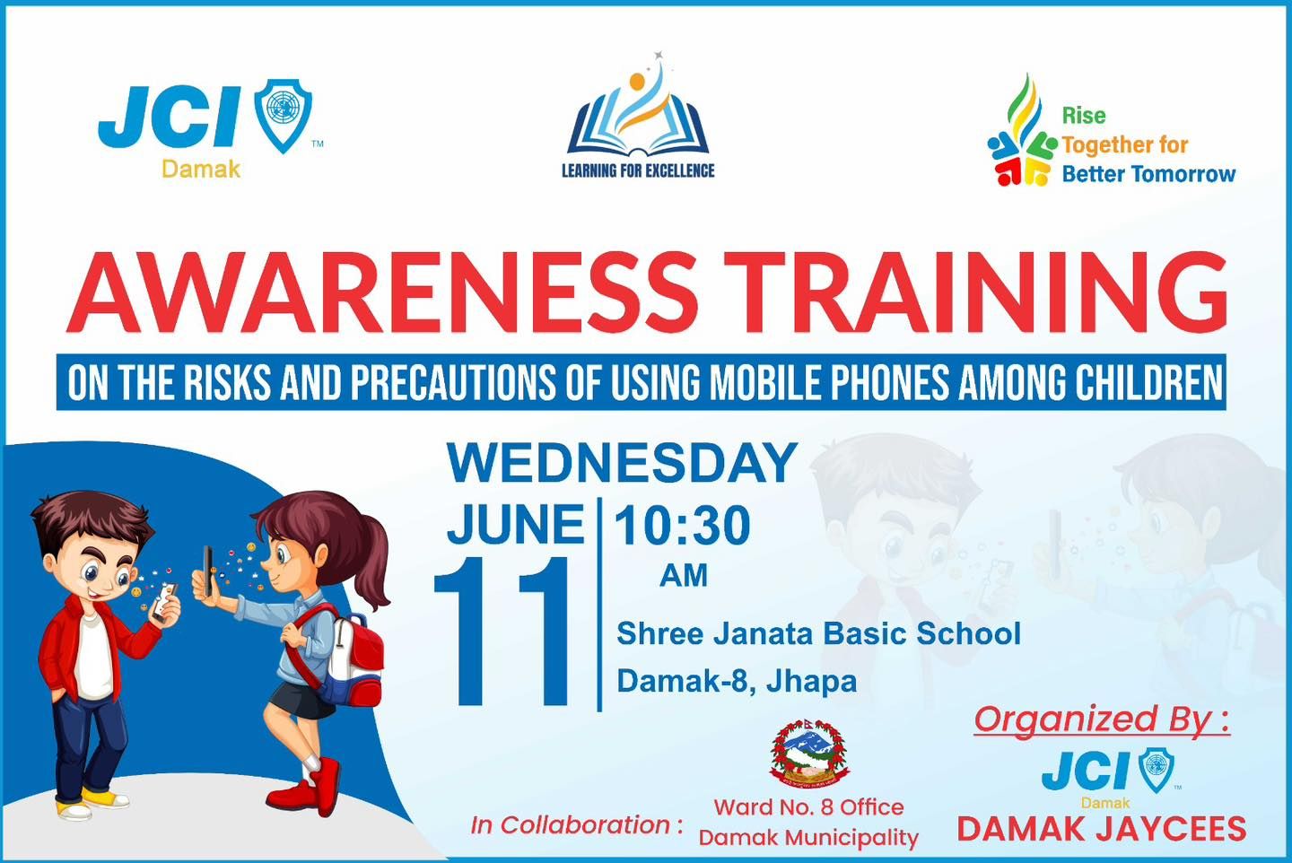 मिति २०८२ साल जेष्ठ २८ गते बुधबारका दिन दमक जेसीजको आयोजना तथा दमक नगरपालिका वडा नं ८ को सहकार्यमा ‘AWARENESS TRAINING ON THE RISKS & PRECAUTIONS OF USING MOBILE PHONES AMONG CHILDREN’ अर्थात बालबालिकामा मोबाइल फोन प्रयोग गर्दा हुने जोखिम र सावधानीहरू बिषयक जनचेतनामूलक तालिम
