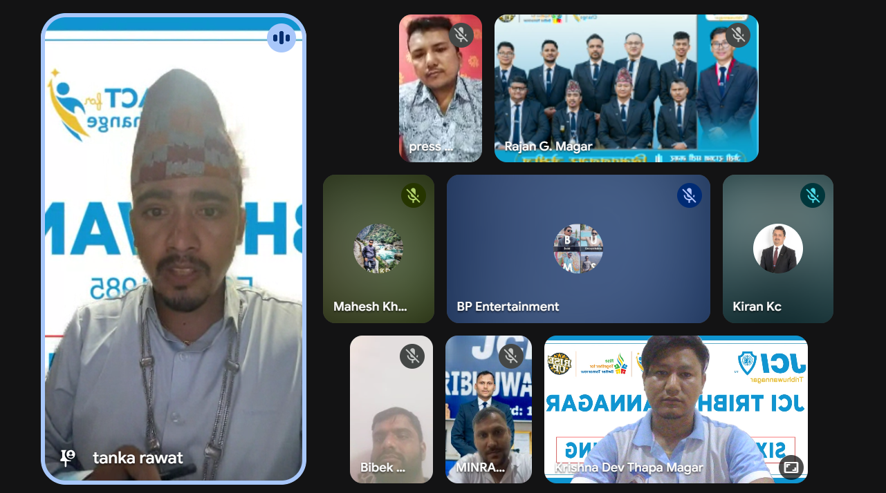 आज मिति २०८२ भाद्र २७ गते (12 September, 2025) शुक्रबारको दिन त्रिभुवननगर जेसीज वर्ष २०२५ का अध्यक्ष टंक बहादुर रावत (अनन्त)को अध्यक्षतामा विभिन्न एजेन्डाहरु उपर छलफल भई छैठौँ कार्यसमिति सम्पन्न भयो । हालको परिस्थितिलाई मध्य नगर गर्दै अनलाइन मार्फत आजको कार्यसमिति सम्पन्न भएको छ ।