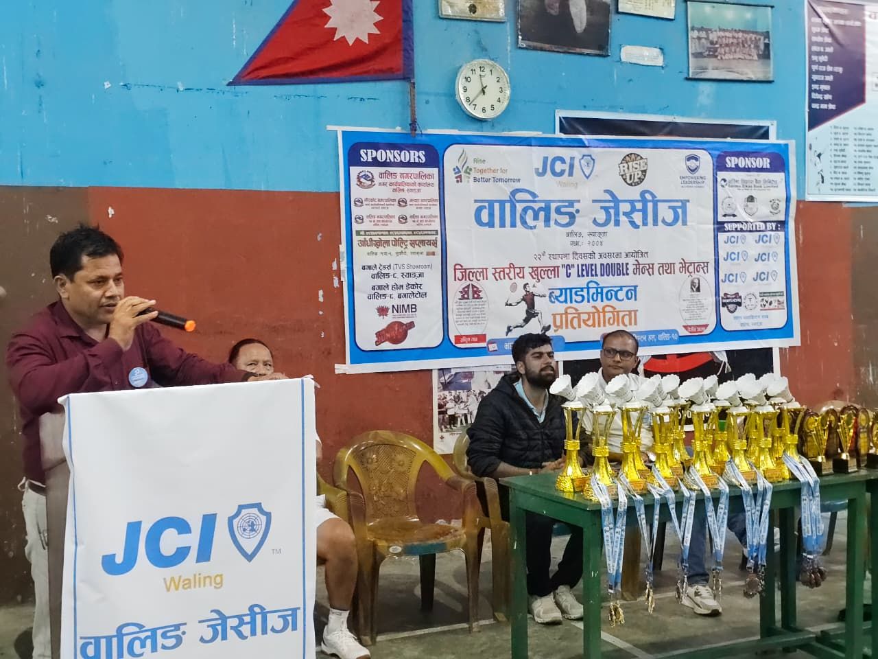 वालिङ जेसीजको २२ औँ स्थापना दिवसको अवसरमा वालिङ जेसीजको आधिकारीक टि-सर्ट तथा डवल पुरुष ब्याडमिन्टन प्रतियोगिता कार्यक्रम सम्पन्न गरिएको छ। मिति २०८२ भाद्र १२ र १३ गते वालिङ जेसीजका अध्यक्ष जेसी संदिप कंडेलकाे अध्यक्षतामा वालिङ नगरपालिका वडा नं १० मा रहेको वालिङ ब्याडमिन्टन हलमा सम्पन्न साे कार्यक्रमकाे प्रमुख अतिथि गण्डकी प्रदेश सभा सदस्य माननीय भोजराज अर्यालले ब्यानर वाचन गरि कार्यक्रमको सुभारम्भ गर्नुभएको थियो साथै उक्त कार्यक्रममा वालिङ जेसीजका वर्ष २०२५ का अतिरिक्त त्रियाकलाप संयोजक जेसी साजन पंगेनी स्वागत मन्तव्य सहित सम्पूर्ण जेसीजका सदस्य एंव खेलाडीहरुलाइ स्वागत गर्नुभएको थियो साथै जेसी देव बोगटी र जेसी दिपक लम्साल लगायतले आफ्नो मन्तव्य राख्नुभएको थियो । कार्यक्रम संयाेजक जेसी साजन पंगेनी र खेल संयोजक जेसी सुर्य प्रसाद रेग्मीले स्वागत मन्तव्य राख्नुभएको थियो। कार्यक्रममा उपाध्यक्ष जेसीज आस्थापाठकाे अगुवाइ उपाध्यक्ष जेसी विष्णु पंगेनीले गर्नुभएको थियोे । वालिङ जेसीजका महासचिव जेसी भानुभक्त आचार्यले सञ्चालन गर्नुभएको कार्यक्रममा प्रमुख अतिथिले वालिङ जेसीजद्धारा आयोजित वालिङ जेसीजको २२ औँ स्थापना दिवसको अवसरमा वालिङ जेसीजको आधिकारीक टि-सर्ट तथा डवल पुरुष ब्याडमिन्टन प्रतियोगिता कार्यक्रममा वालिङ जेसीजले जिल्ला भित्रका युवाहरुलाइ खेलमा प्रेरित गर्न महत्वपूर्ण भूमिका खेलेको र आगामी दिनहरुमा अन्य कार्यक्रमहरुमा वालिङ जेसीजको सहकार्य अपरिहार्य भएको भन्दै कार्यक्रममा सुभकामना व्यक्त गर्नुभएको थियो भने खेलको समापन अतिथि गल्याङ नगरपालिकाका नगर प्रमुख गुरु प्रसाद भट्टराइले सम्पूर्ण प्रथम द्वितीय तथा सान्त्वना प्रप्त गर्ने खेलाडीहरुलाइ बधाइ तथा सम्मान ब्यक्त गर्दै वालिङ जेसीजको कार्यक्रम सभ्य तथा भव्य भएको भनी समापन अतिथि गुरु प्रसाद भट्टराइ र अध्यक्ष संदिप कंडेलले सम्पूर्ण खेलाडकीहरुलाइ पुरस्कृत गर्नुभएको थियो । साथै वालिङ जेसीजका अध्यक्ष जेसी संदिप कंडेलले उक्त कार्यक्रममा जेसीजले व्यक्तित्व र नेतृत्व विकासमा सदैव क्रियाशील भइ कार्य तथा विभिन्न कार्यक्रमहरु संचालन तथा समन्वय गर्ने भन्दै कार्यक्रम समापन गर्नुभएको थियो ।