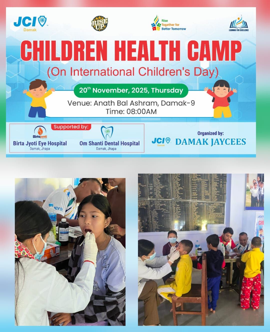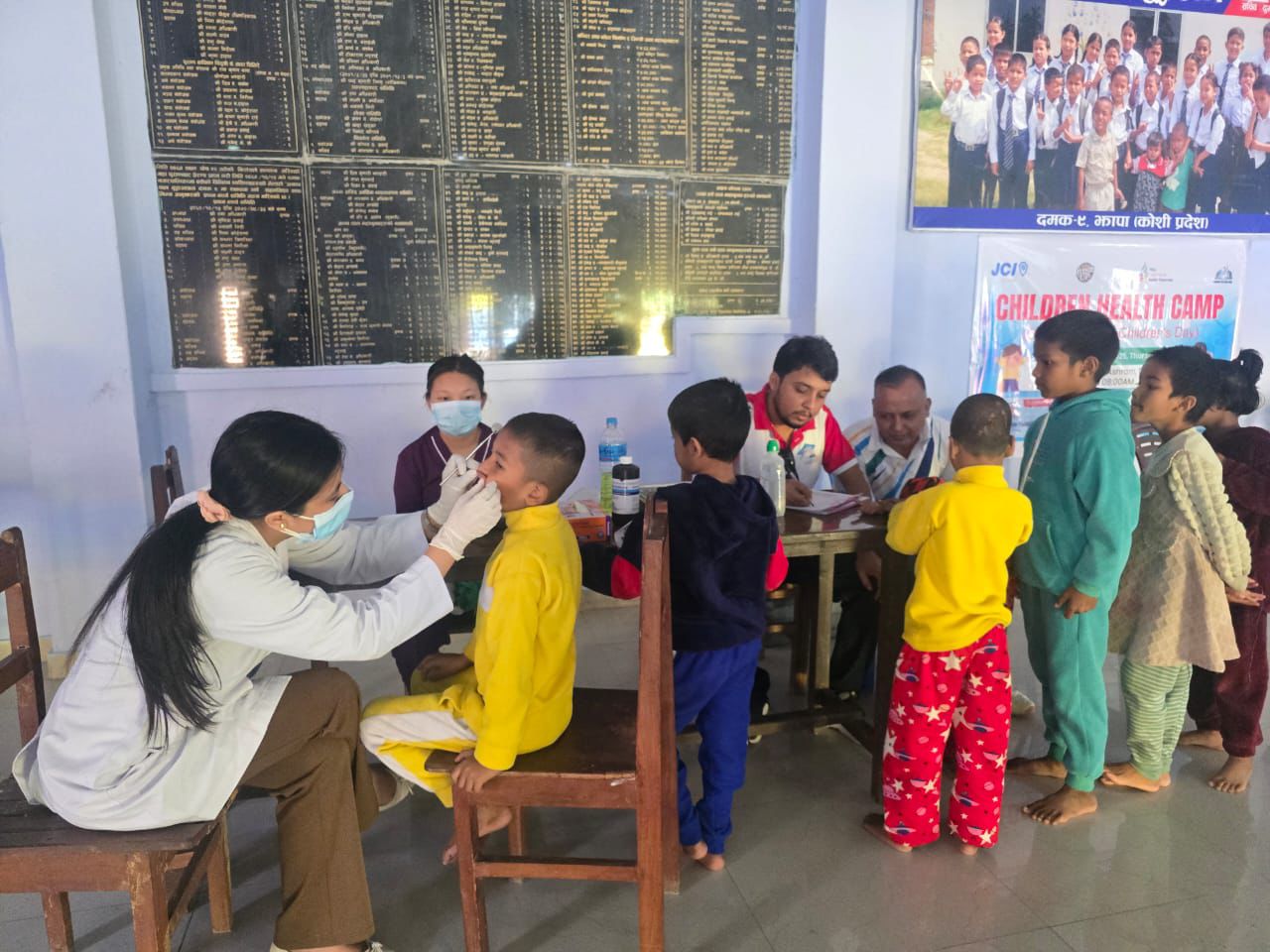 २०८२ साल मंसीर ४ गते बिहीबारका दिन दमक जेसीजको आयोजनामा जेसीज सप्ताह २०२५ अन्तर्गत चौथो दिनको पांचौ कार्यक्रम ‘CHILDREN HEALTH CAMP ’ कार्यक्रम दमक-९ स्थित अनाथ बाल आश्रममा आश्रमका सन्चालक समिति अध्यक्ष आदरणीय मन्दरा चिमरिया पौडेलज्यूको प्रमुख आतिथ्यता साथै दमक जेसीज बर्ष २०२५ का अध्यक्ष जेसी सहदेब भट्टराईज्यूको अध्यक्षतामा सम्पन्न भयो।कार्यक्रम बिश्व वाल दिवसको अवसर पारेर ॐ शान्ति डेन्टल हस्पिटल र बिर्ता ज्योति आंखा अस्पताल दमकको सहकार्यमा आश्रमका ३५ जना बालबालिकाहरू र हिमाली टोल बिकास संस्था दमक-९ का १० जना गरि ४५ जना भन्दा बढीको दन्त र आंखा परिक्षण गरिएको थियो । कार्यक्रममा बिशिष्ट अतिथि दमक नपा वडा नं ९ का जनप्रतिनिधि आदरणीय नरेश बन्जराज्यू, अतिथिहरू अनाथ बाल आश्रमका सचिब आदरणीय दुर्गा खनाल काफ्लेज्यू र कोषाध्यक्ष मेनुका बुढाथोकीज्यू, ॐ शान्ति डेण्टल हस्पिटलका सन्चालक आदरणीय कमल गैरेज्यू तथा डेन्टल सर्जन डा.काश्मी श्रेष्ठ र डा.टंक न्यौपानेज्यू, बिर्ताज्योति अस्पतालका लीलानाथ फुयांल र डुरी दासज्यू, दमक जेसीजका पूर्ब अध्यक्ष तथा बोर्ड अफ ट्रष्टिजका अध्यक्ष आदरणीय गन्ज बहादुर दाहालज्यू, जेसीआई सिनेटर राज कुमार भट्टराईज्यू, सिनेटर मैना दाहालज्यू, संचारकर्मी सुजन गौतमज्यू लगायतको उपस्थिति रहेको थियो । कार्यक्रम जेसीज सप्ताह २०२५का मूल संयोजक दमक जेसीजका कार्यकारिणी उपाध्यक्ष जेसी रूबल अधिकारी र आजको कार्यक्रमका संयोजक जेसी सरिता आचार्यको संयोजकत्वमा भएको थियो भने उपाध्यक्ष जेसी धर्म ढुगांनाले जेसीज आस्था पाठ बाचन गर्नुभएको थियो। यसरी आजको कार्यक्रम सफलतापूर्बक सम्पन्न गरी समापन गरियो ।