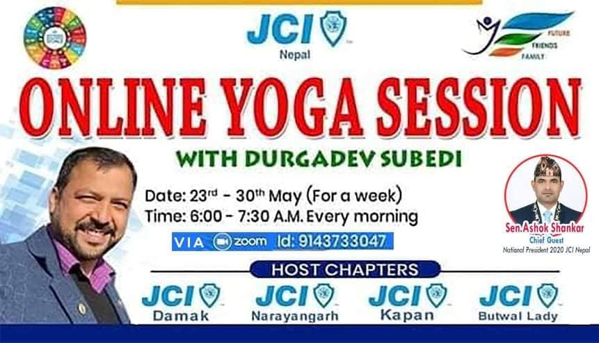 जेसीआई बुटवल लेडी,जेसीआई दमक, जेसीआई नारायणगढ, जेसीआई कपन को संयुक्त आयोजनामा मिति २०७७/०२/१० देखि २०७७/०२/१७ गते सम्मको सप्ताहव्यापी अनलाइन योगा कक्षा कार्यक्रम