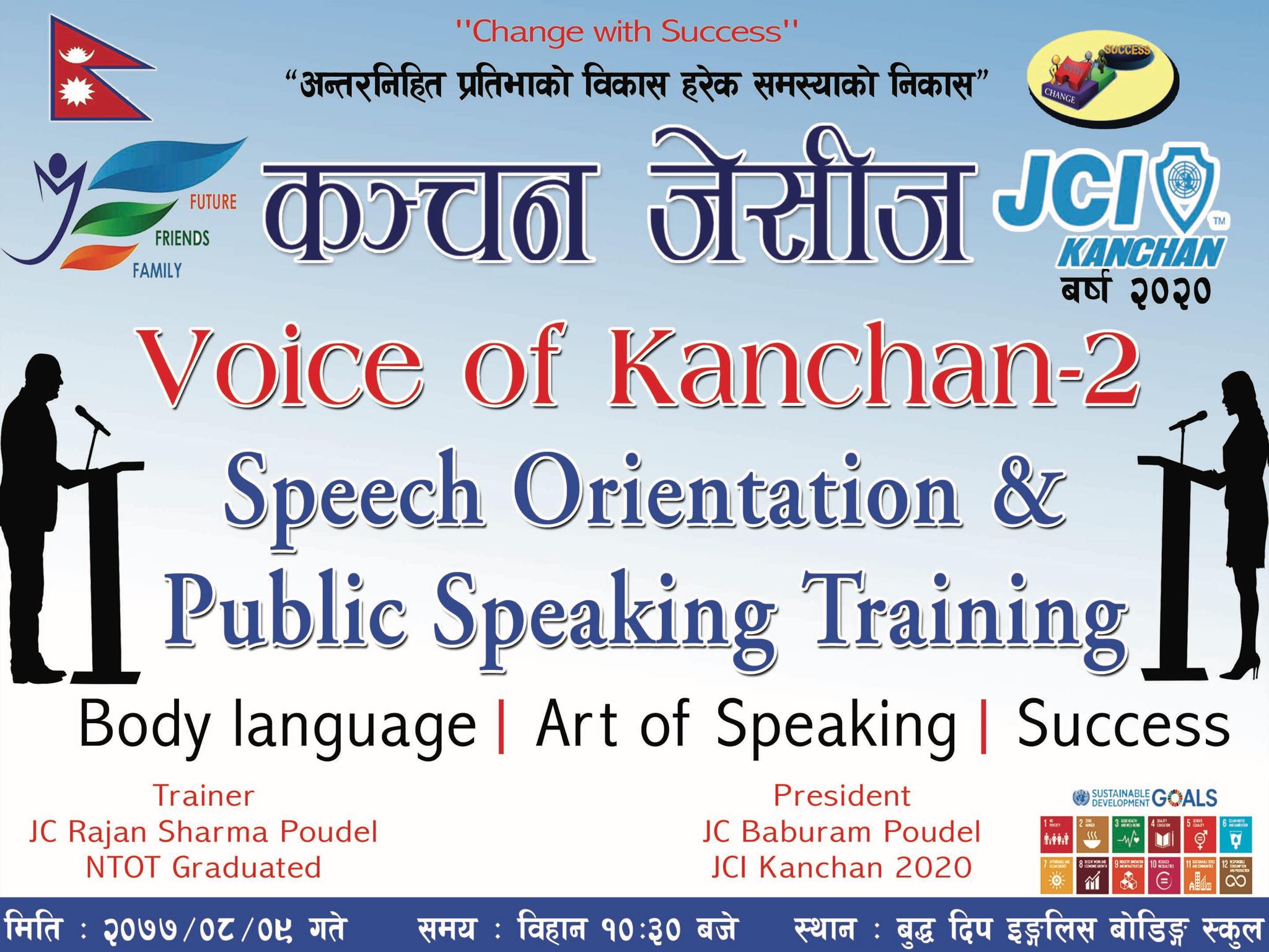 कञ्चन जेसीज बर्ष 2020 को आयोजनामा मिति 2077/08/09 गतेका दिन Speech Orientation and Public Speaking Training कार्यक्रम सम्पन्न गरेको छ। व्यक्तिको व्यक्तित्व विकासको मेरुडन्ड मानिने बोल्ने बला अभिबृद्ध गर्न यस प्रकारको तालिमले प्रभावकारी भुमिका खेल्ने विश्वास गरिएको छ।