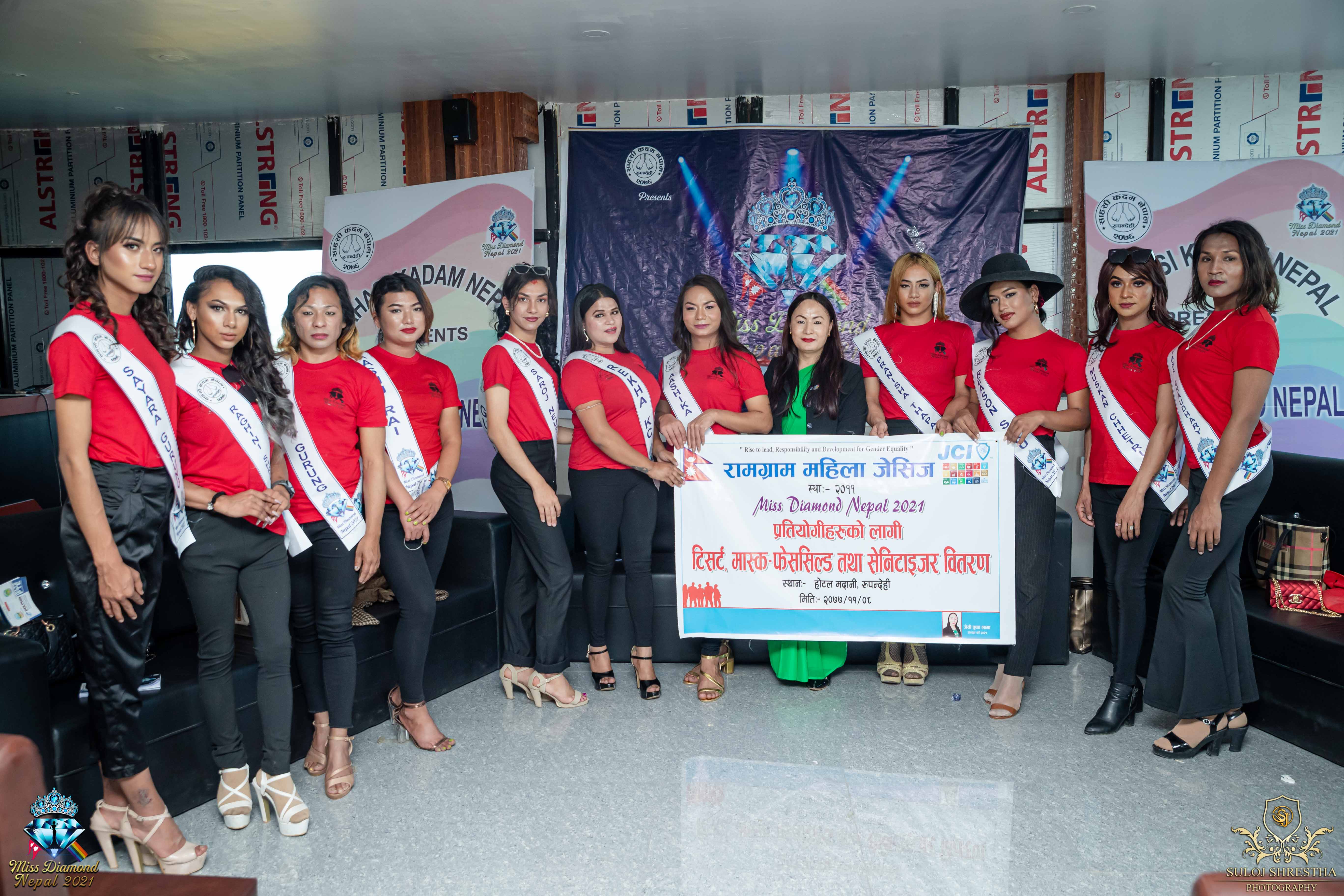 रामग्राम लेडि जेसीज २०२१ दुवारा मिस डाइमान नेपालका प्रतियोगी हरुलाई मिति २०७७/११/०८ मा अध्यक्ष जेसी पुस्पा लामा र बोर्ड का पदाधिकारी को उपस्थितिमा १३ थान टिसट र आवश्यक सुरक्षा का सामग्री वितरण गरियको छ