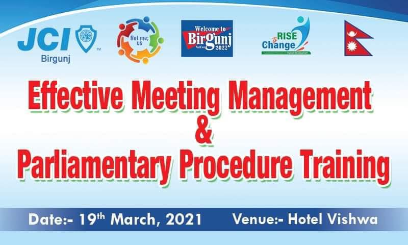 बीरगंज जेसीज को " Effective Meeting Management & Parliamentary Procedure Training " मिती २०७७ चैत्र ०६ तदानुसार १९ मार्च, २०२१ शुक्रबार का दिन बीरगंज जेसीज वर्ष २०२१ को शाखा अध्यक्ष जेसी रंजन राउत ज्यु को सभापतीत्व मा होटेल भिस्वा, बीरगंज को सभाहल मा सम्पन भयो .