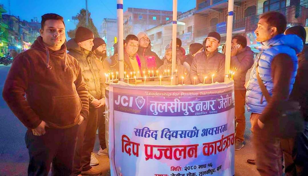तुल्सिपुर नगर जेसीज द्वारा सहिदहरुको सम्झनामा द्विप प्रज्वलन!!!!!!!!!!! तुल्सिपुर नगर जेसीजले आज माघ १६ गते सहिद दिवसको अवसरमा ज्ञात-अज्ञात सहिदहरुको सम्झनामा जेसिज चोकमा एक कार्यक्रमका बिच द्विप प्रज्वलन गरेको छ। तुल्सिपुर नगर जेसीज वर्ष २०२४ का अध्यक्ष जेसि पुर्ण बिक्रम डाङ्गिको अध्यक्षतामा सम्पन्न कार्यक्रममा प्रमुख अतिथी तुल्सिपुर उपमहानगरपालिका वडा न. ५ का अध्यक्ष बिरेन्द्र कुमार शाह,विशिष्ट अतिथी- ट्राफिक प्रहरी कार्यालयका प्रमुख इस्वरी देवकोटा रहनुभएको थियो। उक्त कार्यक्रममा तुल्सिपुर नगर जेसिजका पुर्व अध्यक्षहरु,निवर्तमान अध्यक्ष,सल्लाहकार ज्युहरु,बोर्ड पदाधिकारिहरु,जेसिज सदस्यहरु,पत्रकारहरु लगाएत अन्य सर्वसाधारणहरुको उल्लेख्य उपस्थिती रहेको थियो। (Posted on 2024-01-30)