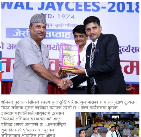 जेसीज सप्ताहमा लागु अौषध दुरुपयोगको लागि बुटवल जेसीजले कार्यक्रमका तस्विरहरु . जेसीज सप्ताहको उद्घाटन प्रदेश नम्वर पाँचका सामाजिक विकास मन्त्री सुदर्शन बरालले गर्नु भएको थियो । त्यस पछि भिडियो फिल्म र लागु अौषध न्यूनिकरणको लागि सहजकर्ता सहित विभिन्न कलेजमा कार्यक्रम समप्नन भएका थिए । सप्ताहको अन्तिम दिन बुटवल उपमहानगरका सवै बडा अध्यक्ष, मेयर तथा सरोकार वाला निकायका प्रतिनिधिको उपस्थितीमा नार्कोनन दक्षिण अमेरिकाका प्रशिक्षक बसन्तराज कुँवरले दुर्ब्यसन न्युनिकरण बारे सहजकर्ताको भूमिका निर्वाह गर्नु भएको थियो ।