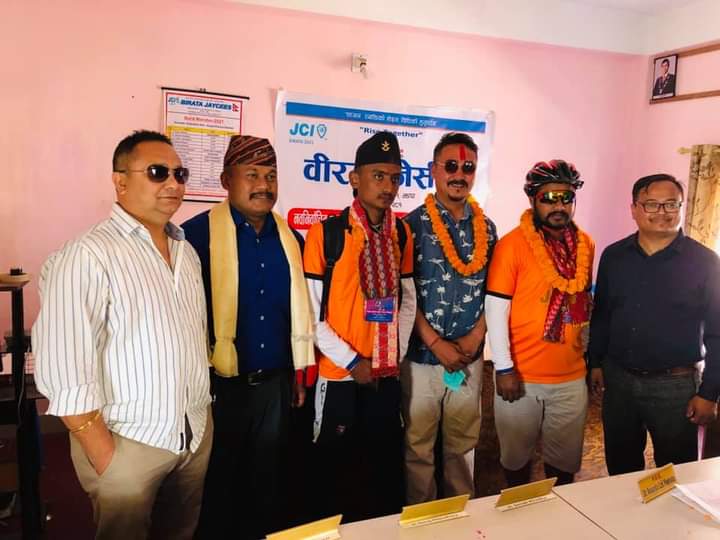 वीरता जेसीजले "बलात्कार मुक्त समाज को परिकल्पना,शान्ती सुशासन र समृद्ध नेपाल हाम्रो चाहना" नाराका साथ पुर्व मेची बाट सुरु भएको साइकल यात्री अभिषेक धमला र आकाश घिमिरे लाई एक कार्यक्रम का बिच बिदाई गरिएको छ। वीरता जेसीजका अध्यक्ष राजीव धिमालको अध्यक्षता तथा नेपाल जेसीजका पूर्व कार्यकारीणी उपाध्यक्ष तथा वीरता जेसीजका पूर्व अध्यक्ष सिनेटर विनोद वस्नेतको प्रमुख आतिथ्यमा भएको कार्यक्रममा वीरता जेसीजका प्रकरण निर्देशक कमल श्रेष्ठले स्वागत गरेका थिए । कार्यक्रममा मेची–महाकाली साइकल यात्री अभिषेक धमला झापाली कान्छा र आकाश क्षेत्रीलाई वीरता जेसीजको लोगो अंकित टी–सर्टसहित सम्मान गर्दै यात्रा सफलताको कामना गरिएको थियो । वीरता जेसीजका मनोरञ्जन संयोजक आसिमज्वयल श्रेष्ठले आस्था बाचन गरेको कार्यक्रममा धन्यवाद ज्ञापन वीरता जेसीजका कार्यकारीणी उपाध्यक्ष विकास वस्नेतले गरेका थिए । कार्यक्रमको सञ्चालन वीरता जेसीजका महासचिव लोकचन्द्र श्रेष्ठ (एलसी)ले गरेको थिए ।
