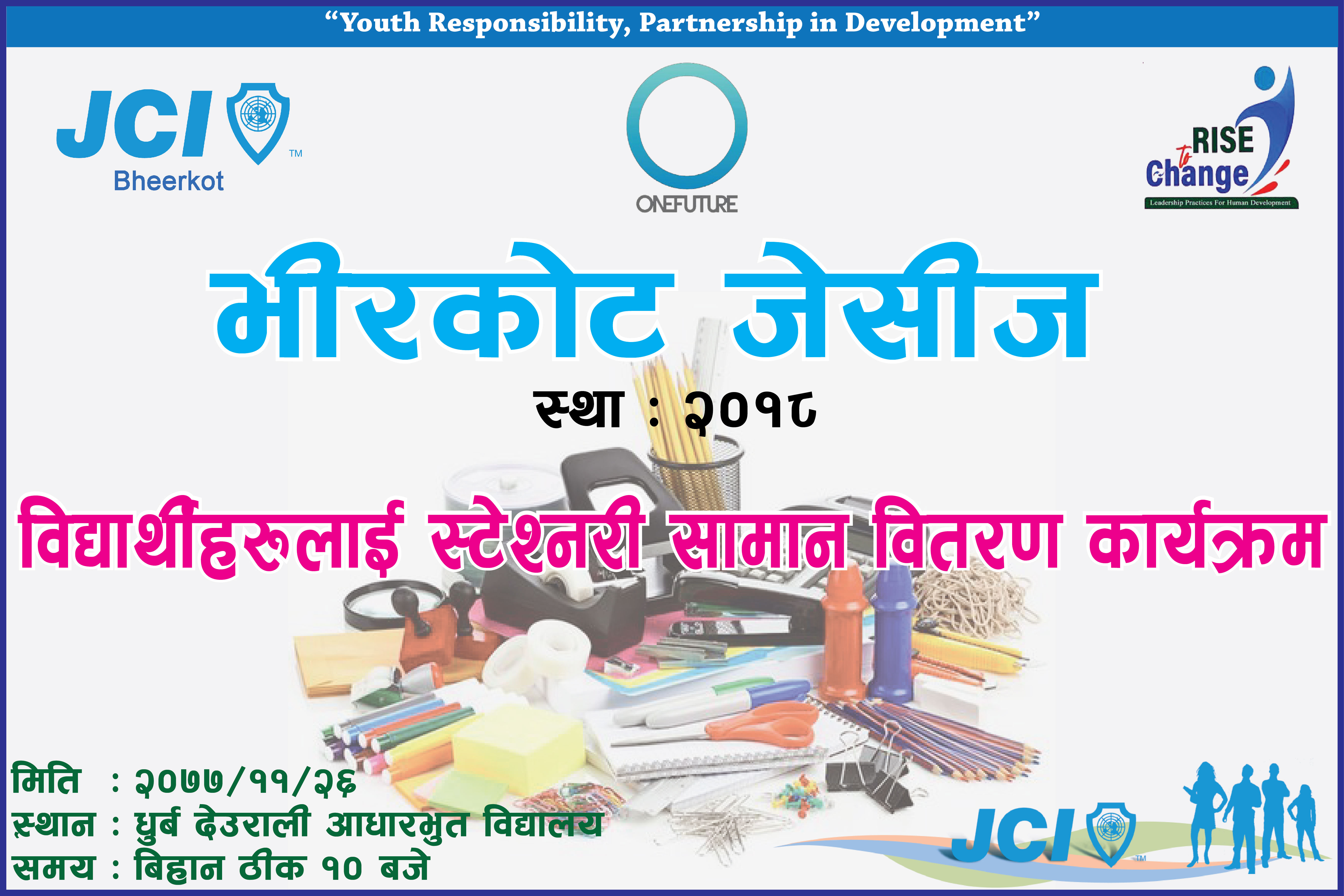 भीरकाेट जेसीजका बालमैत्री समन्वय संयाेजक जेसी गेमा कुमारी मगर ज्यूकाे जन्म दिनकाे सु-अबसरमा उहाँको विशेष सहयाेगमा भीरकाेट जेसीज द्दारा बिधार्थी भाईबहिनिहरूलाई स्टेसनरी सामान वितरण कार्यक्रम सम्पन्न । पुनः जेसी गेमा ज्यूलाई जन्म दिनकाे धेरै धेरै शुभकामना । जय जेसीज
