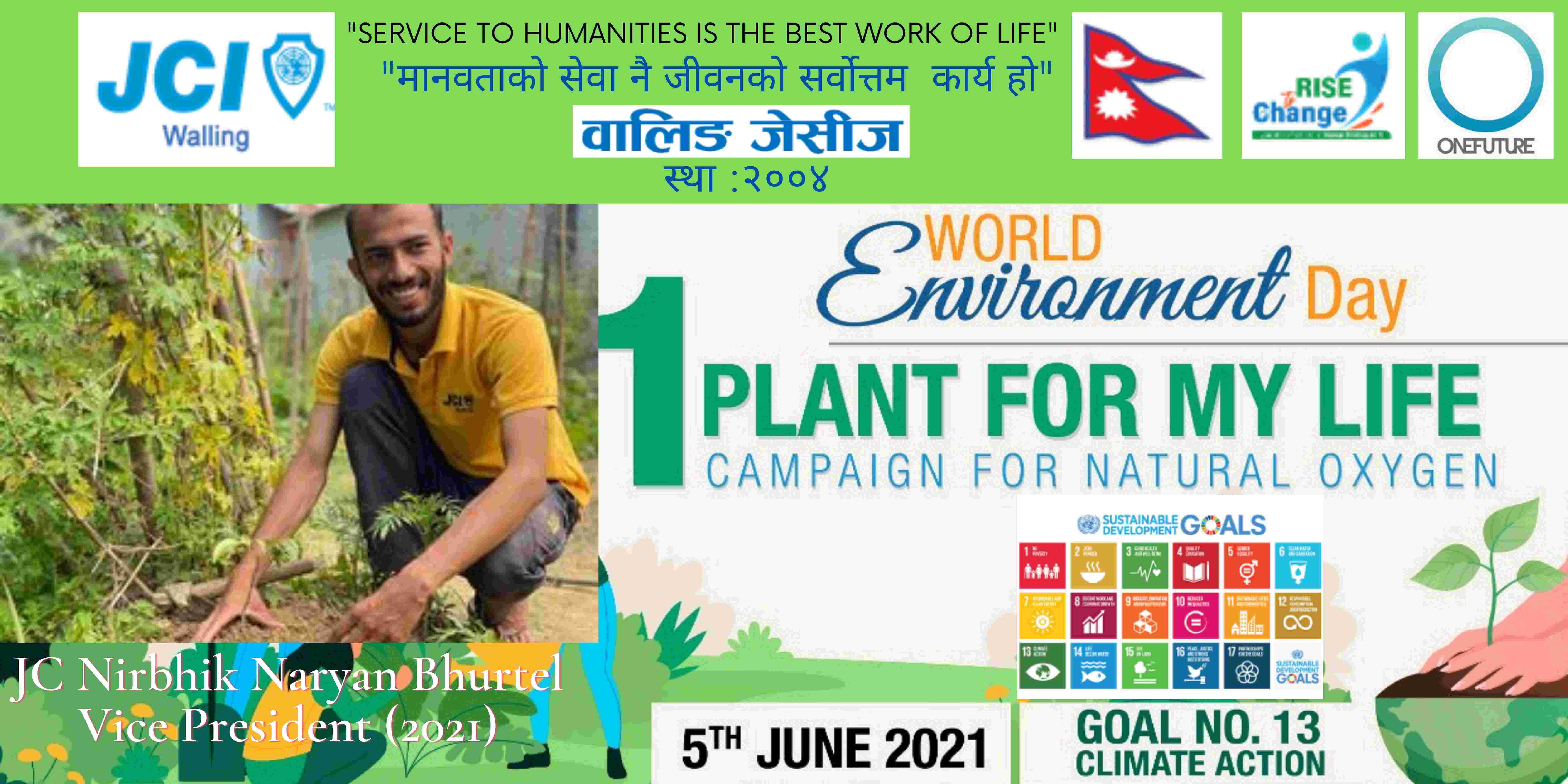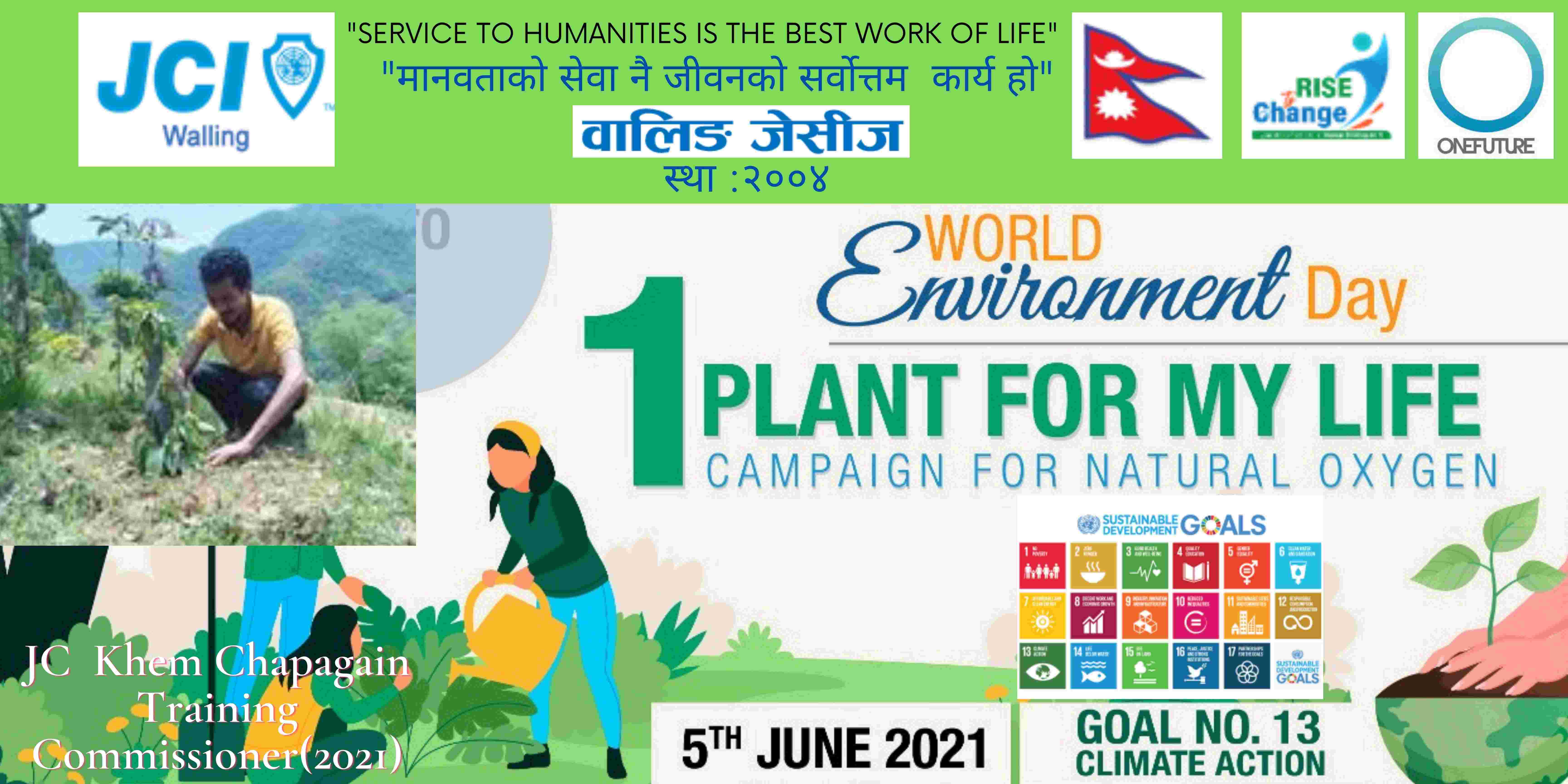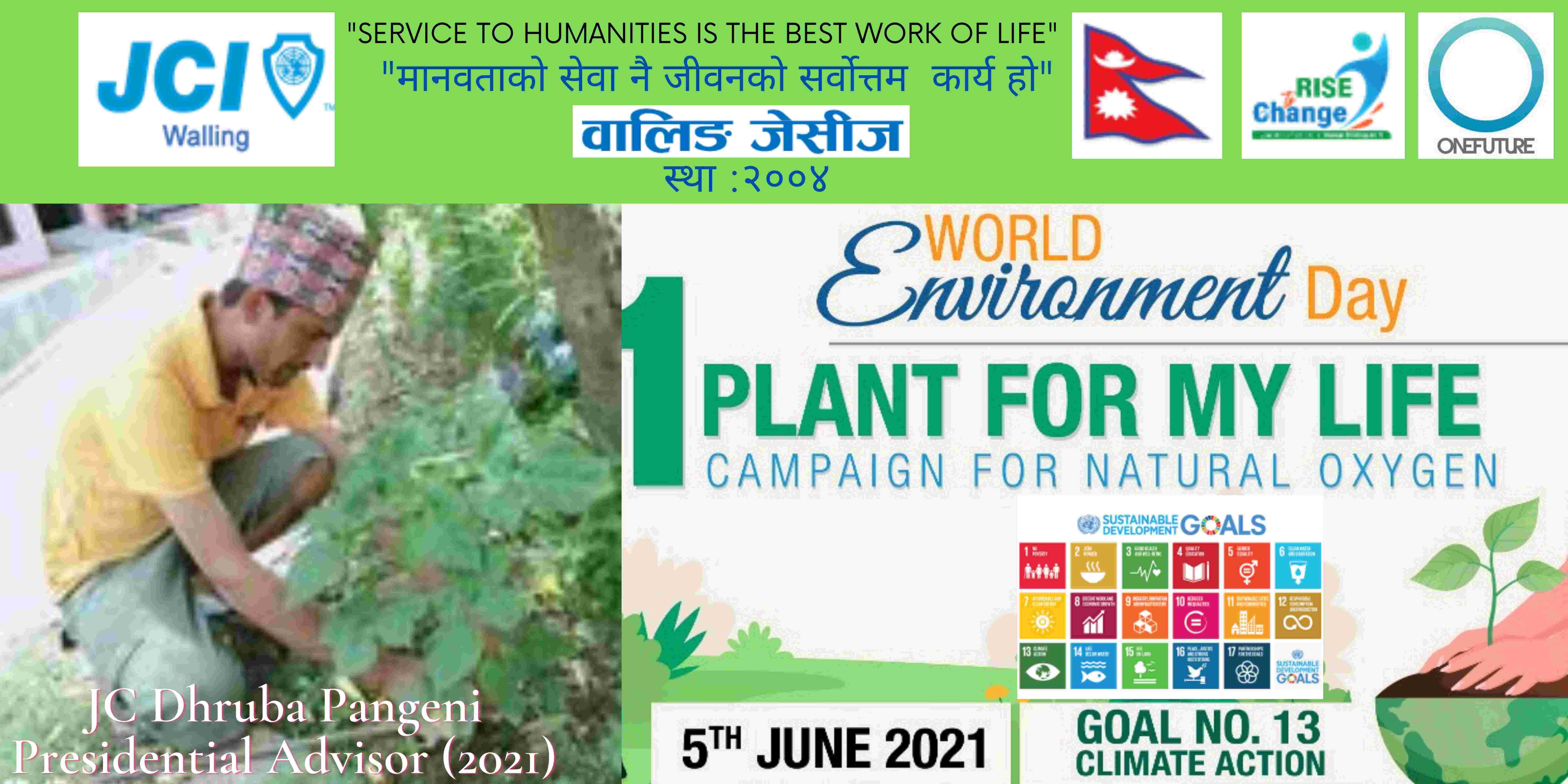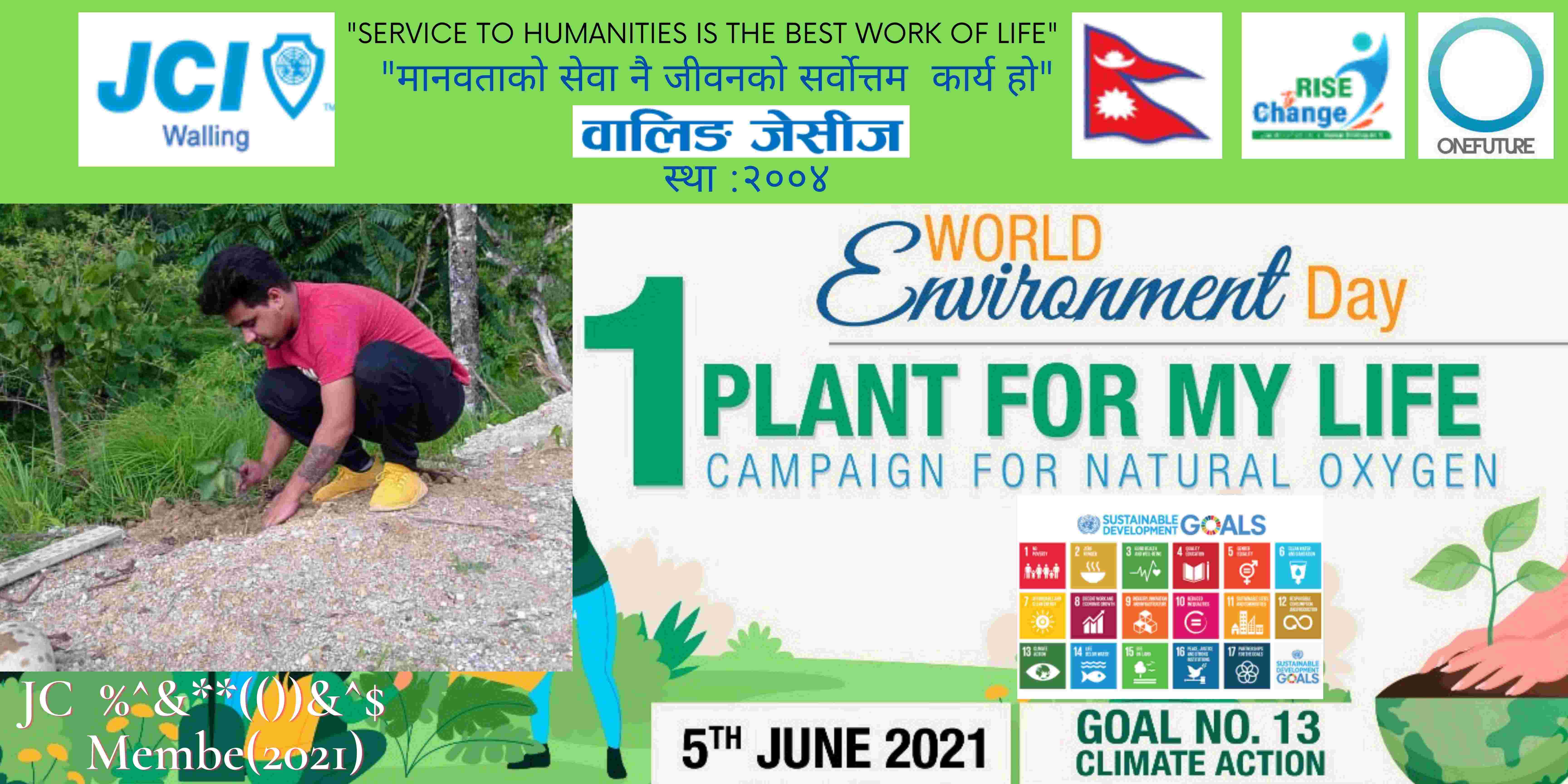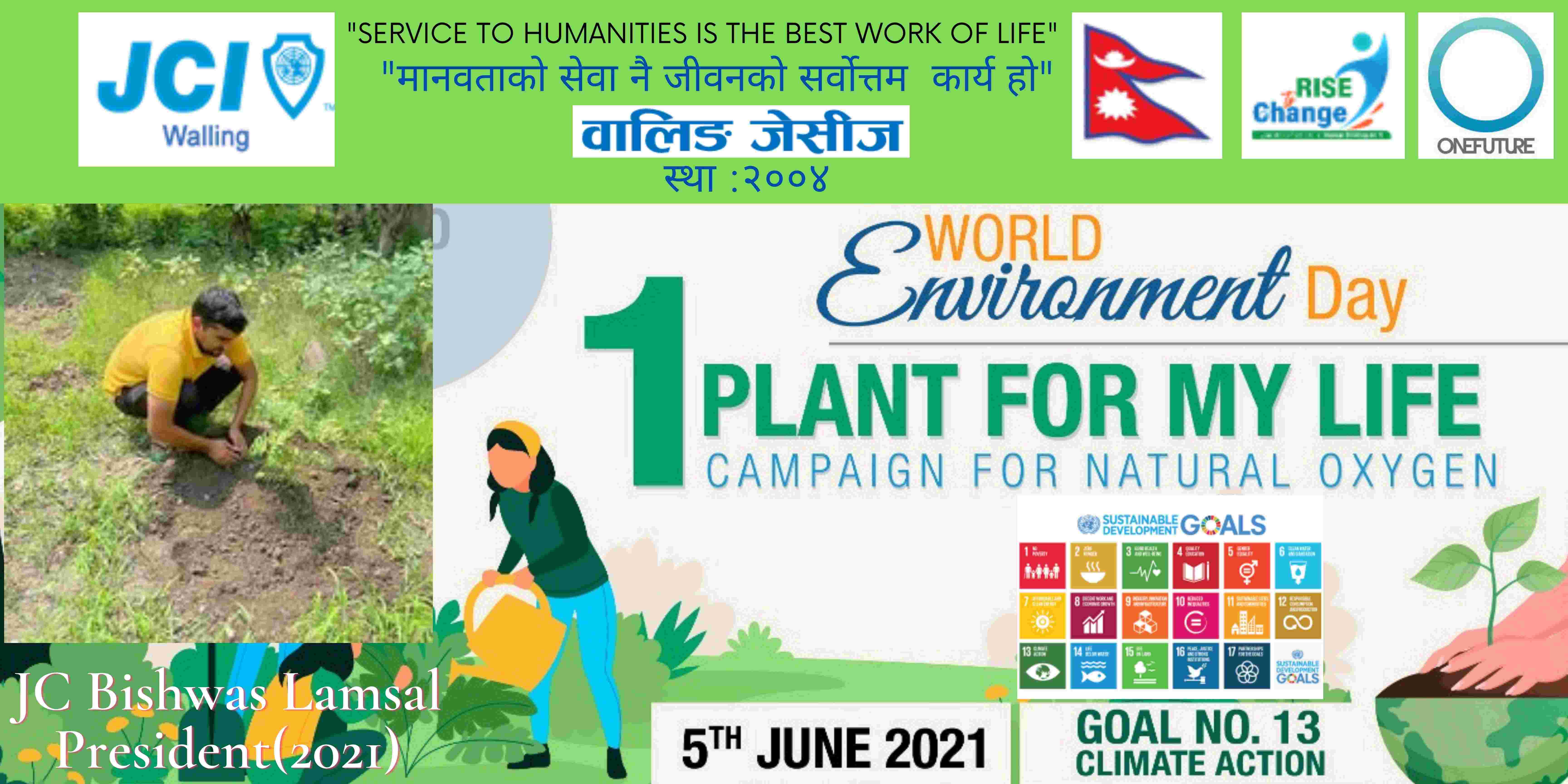 वालिङ जेसीजले विश्व वातावरण दिवसकाे अवसर पारेर वृक्षारोपण सहित प्राकृतिक अक्सिजन काे लागि " मेरो जीवनलाई एक बिरुवा" क्याम्पिङ मिति २०७८ साल जेठ २२ गते शनिबार सम्पन्न गरेको छ। नेपाल जेसीज वर्ष २०२१ को राष्ट्रिय अभियान " परिवर्तन का लागि उठाैं, मानव विकास सँगै नेतृत्व अभ्यासलाई सार्थक तुल्याउन वालिङ जेसीजको तर्फबाट दिगो विकास लक्ष्य अन्तर्गत रहेको लक्ष्य नं१३ अनुरूप साे कार्यक्रम गरिएको वालिङ जेसीजका अध्यक्ष जेसी विश्वास लम्सालले बताउनुभयो । हाल विश्वव्यापी महामारीको रूपमा फैलिदैं गइरहेको काेराेना भाइरस भेरियन्ट -२ काे संक्रमण तिव्र गतिमा बढ्दै जाँदा वालिङ जेसीजले अा- अाफ्नाे क्षेत्रबाट फाेटाे क्याम्पिङ सहित कार्यक्रम सम्पन्न गरेकाे हाे। उक्त कार्यक्रममा वालिङ जेसीजका बाेर्ड पदाधिकारी तथा सदस्यहरूको उल्लेख्य सहभागीता रहेको वालिङ जेसीजका महासचिव जेसी यज्ञ पुरूष रिजालले जानकारी दिनुभयो । विगतका दिनमा समेत वालिङ जेसीजले विपन्न परिवारलाई राहत सामाग्री, स्याङ्जा कारागार काे लागि टिभी लगायत काेभिड १९ राेकथामकाे लागि फ्रण्टलाइनमा बसेर सहयोग पुर्याउने स्वास्थ्यकर्मी र सुरक्षाकर्मी हरूलाई विभिन्न स्वास्थ्य सुरक्षाका सामाग्रीहरू प्रदान गर्दै आइरहेको छ। https://www.facebook.com/jci.waling/posts/175961681147929