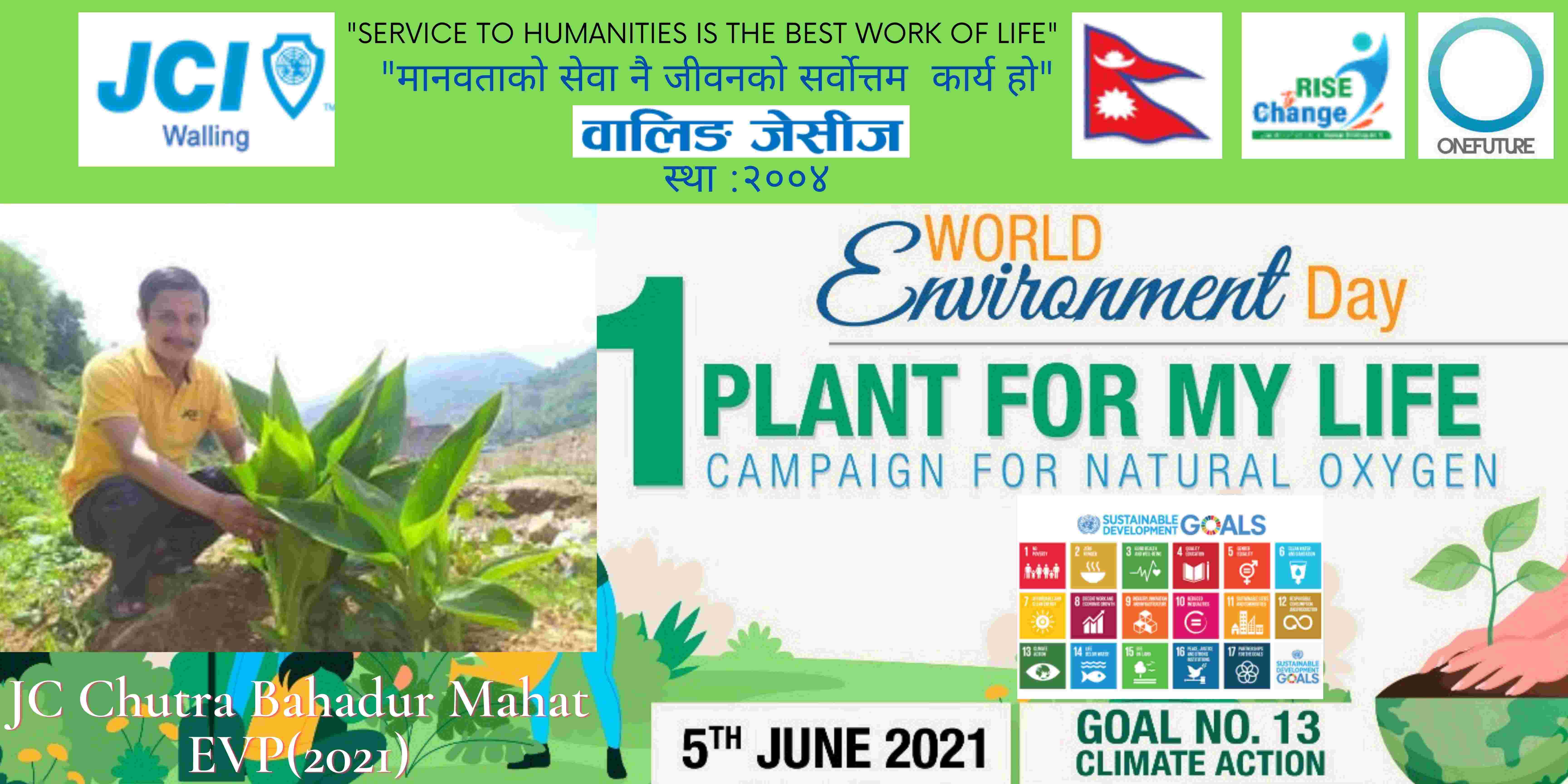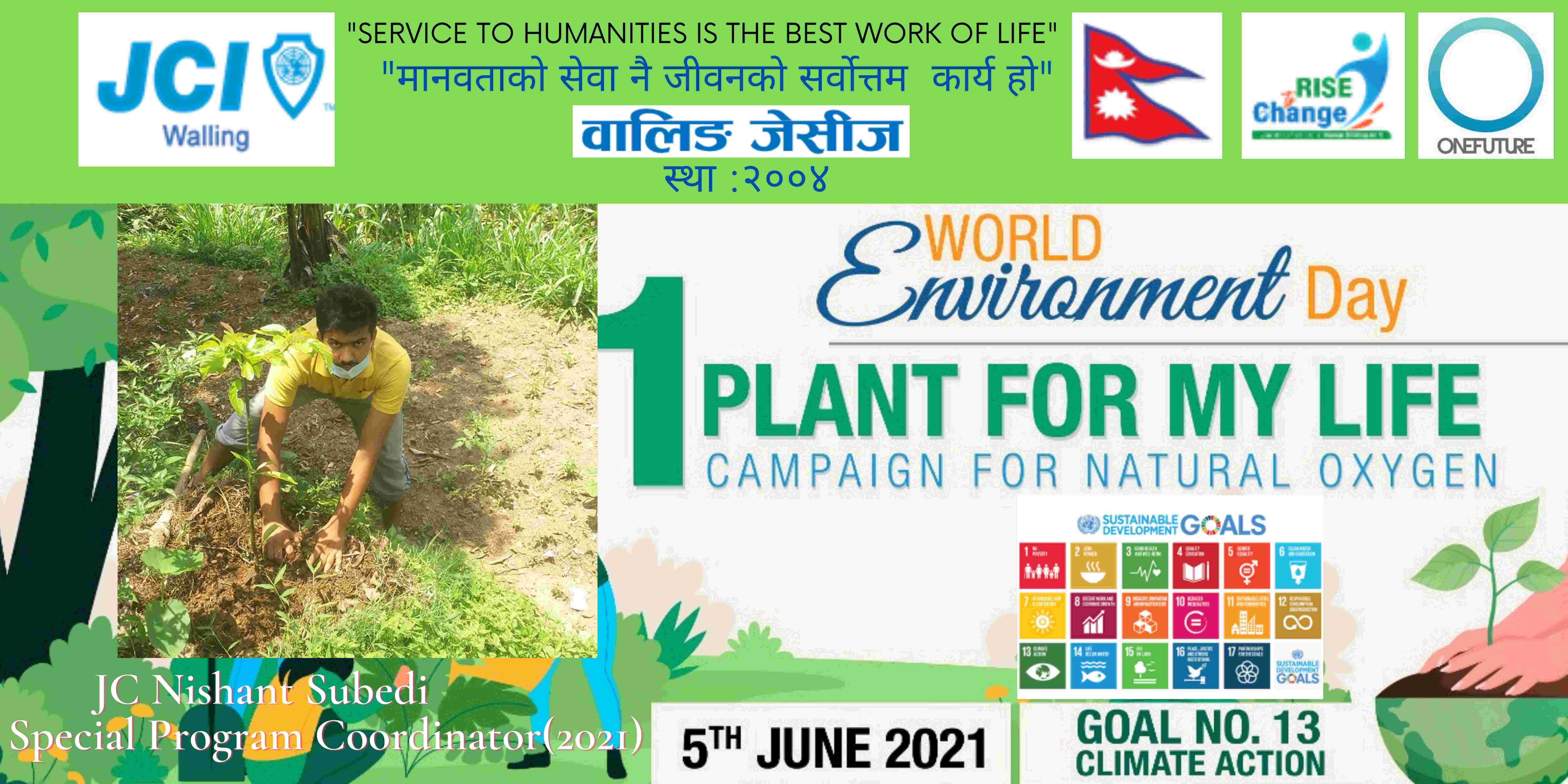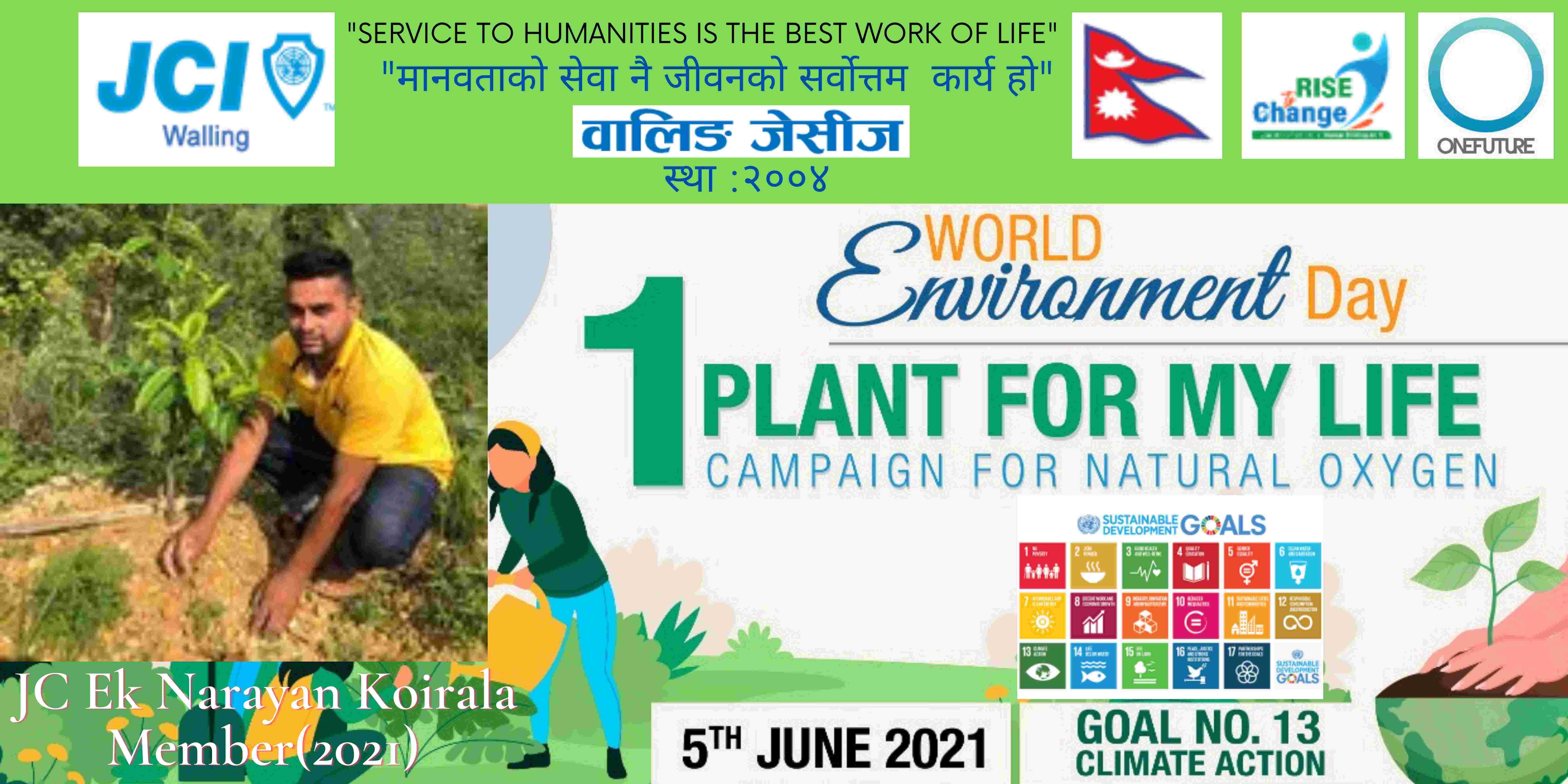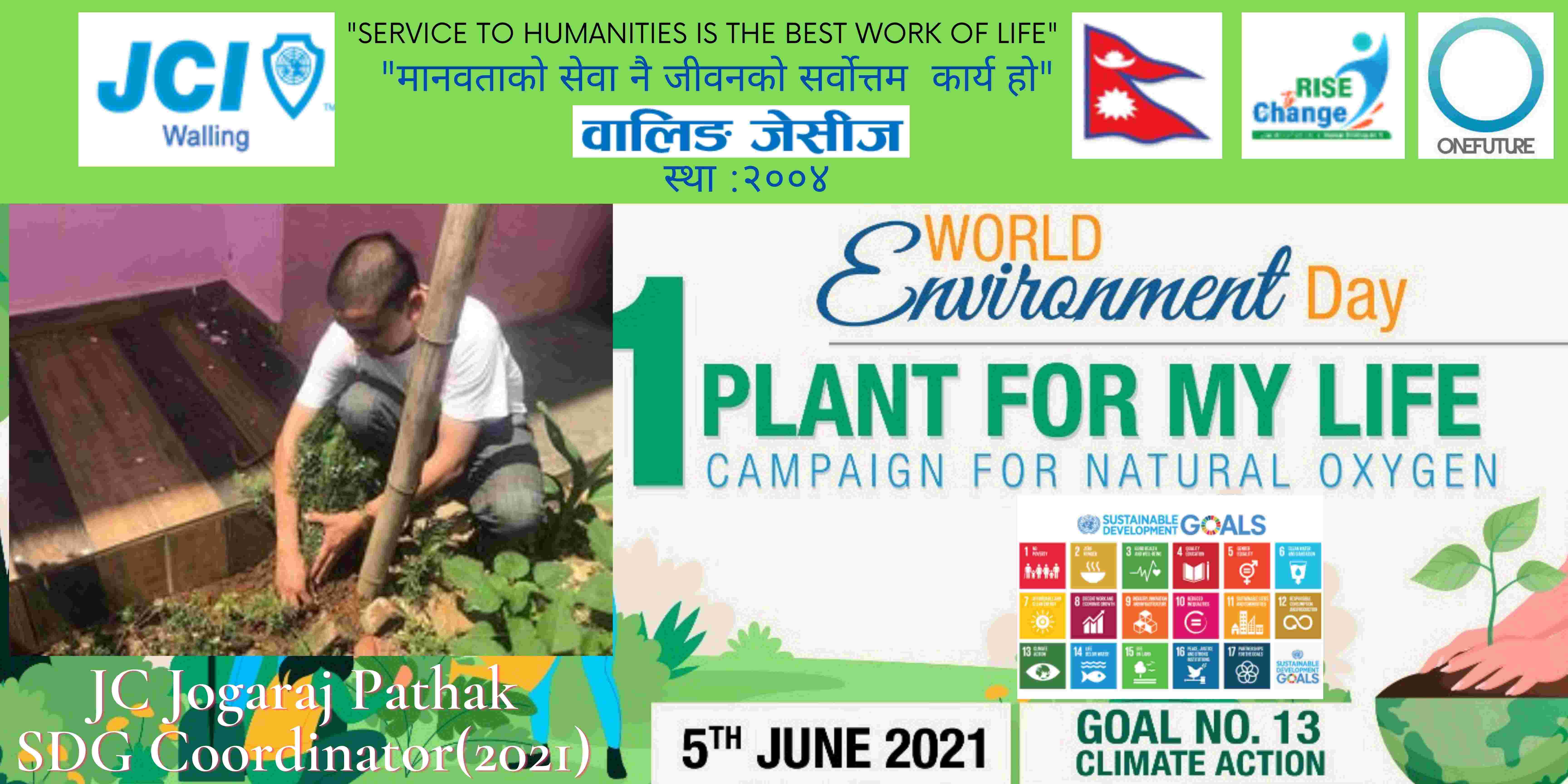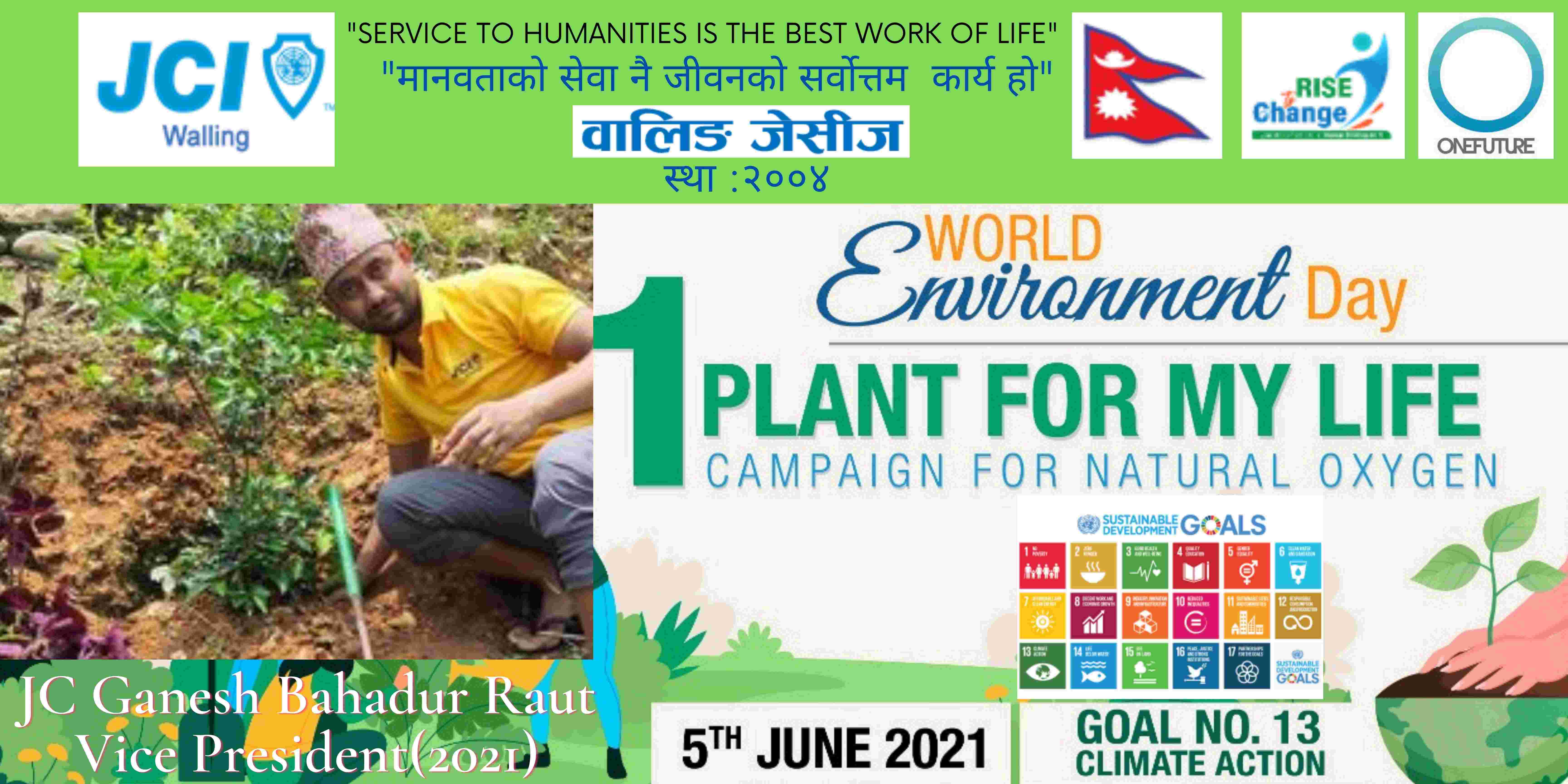 वालिङ जेसीजले विश्व वातावरण दिवसकाे अवसर पारेर वृक्षारोपण सहित प्राकृतिक अक्सिजन काे लागि " मेरो जीवनलाई एक बिरुवा" क्याम्पिङ मिति २०७८ साल जेठ २२ गते शनिबार सम्पन्न गरेको छ। नेपाल जेसीज वर्ष २०२१ को राष्ट्रिय अभियान " परिवर्तन का लागि उठाैं, मानव विकास सँगै नेतृत्व अभ्यासलाई सार्थक तुल्याउन वालिङ जेसीजको तर्फबाट दिगो विकास लक्ष्य अन्तर्गत रहेको लक्ष्य नं१३ अनुरूप साे कार्यक्रम गरिएको वालिङ जेसीजका अध्यक्ष जेसी विश्वास लम्सालले बताउनुभयो । हाल विश्वव्यापी महामारीको रूपमा फैलिदैं गइरहेको काेराेना भाइरस भेरियन्ट -२ काे संक्रमण तिव्र गतिमा बढ्दै जाँदा वालिङ जेसीजले अा- अाफ्नाे क्षेत्रबाट फाेटाे क्याम्पिङ सहित कार्यक्रम सम्पन्न गरेकाे हाे। उक्त कार्यक्रममा वालिङ जेसीजका बाेर्ड पदाधिकारी तथा सदस्यहरूको उल्लेख्य सहभागीता रहेको वालिङ जेसीजका महासचिव जेसी यज्ञ पुरूष रिजालले जानकारी दिनुभयो । विगतका दिनमा समेत वालिङ जेसीजले विपन्न परिवारलाई राहत सामाग्री, स्याङ्जा कारागार काे लागि टिभी लगायत काेभिड १९ राेकथामकाे लागि फ्रण्टलाइनमा बसेर सहयोग पुर्याउने स्वास्थ्यकर्मी र सुरक्षाकर्मी हरूलाई विभिन्न स्वास्थ्य सुरक्षाका सामाग्रीहरू प्रदान गर्दै आइरहेको छ। https://www.facebook.com/jci.waling/posts/175961681147929