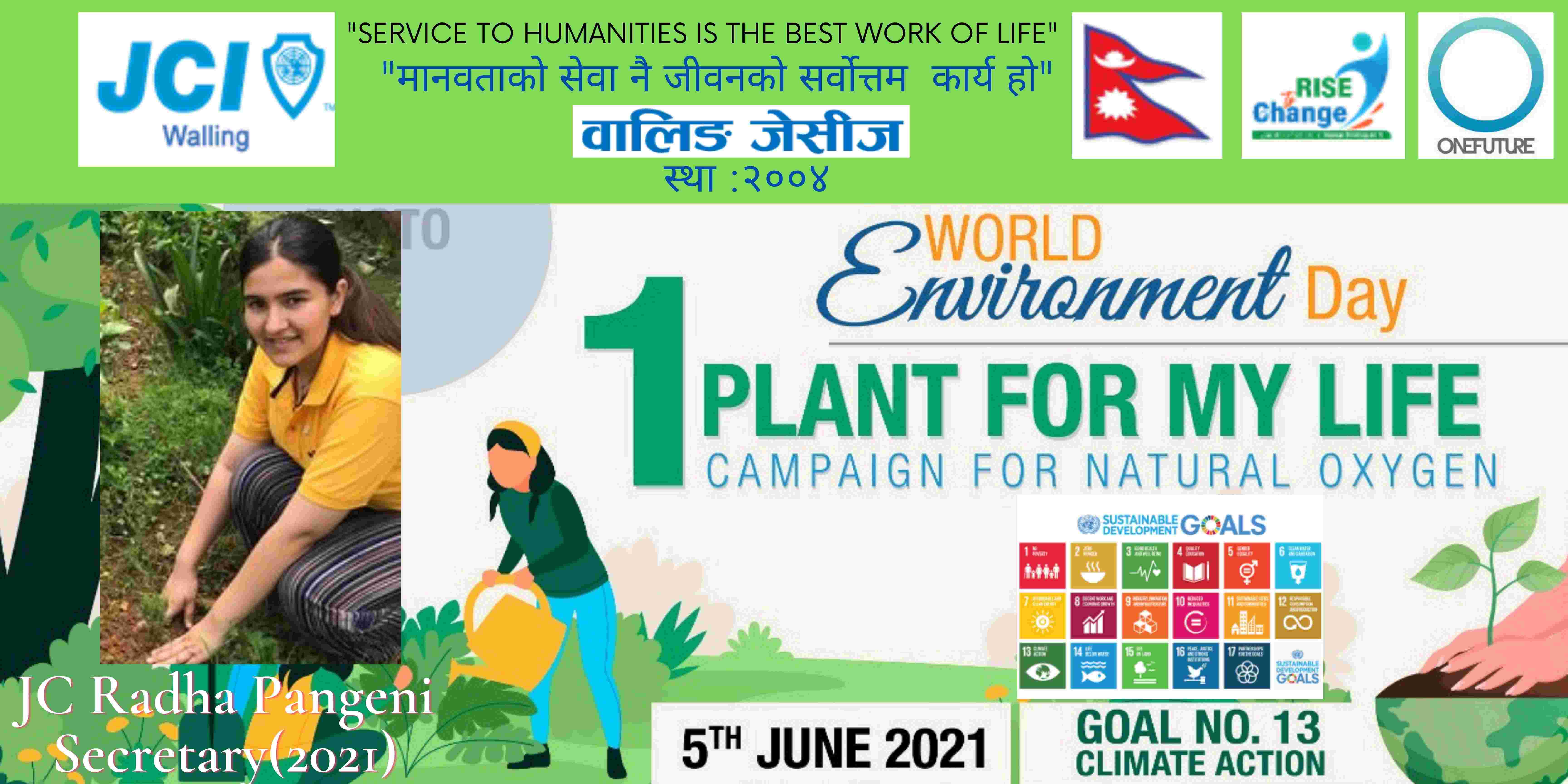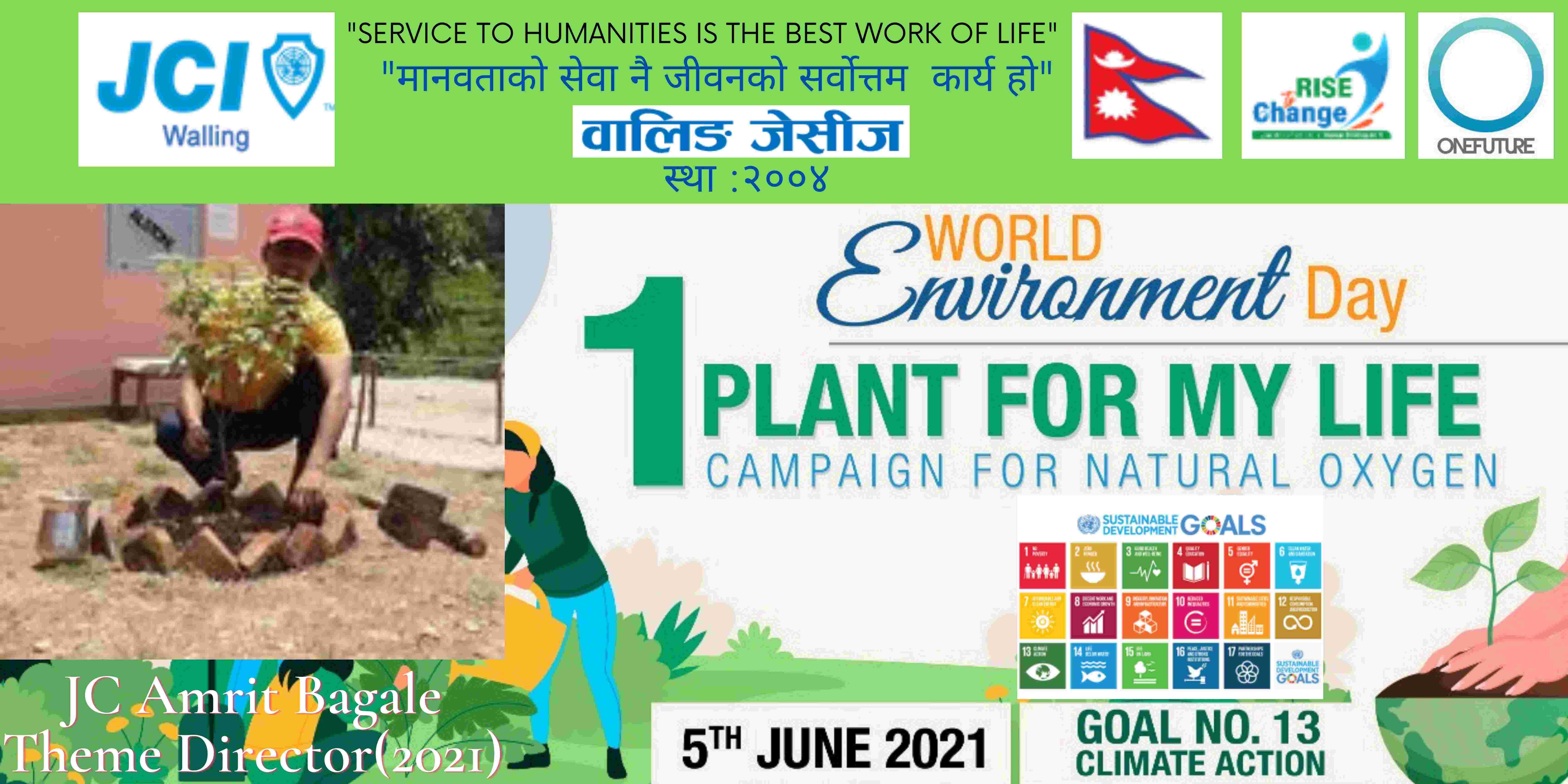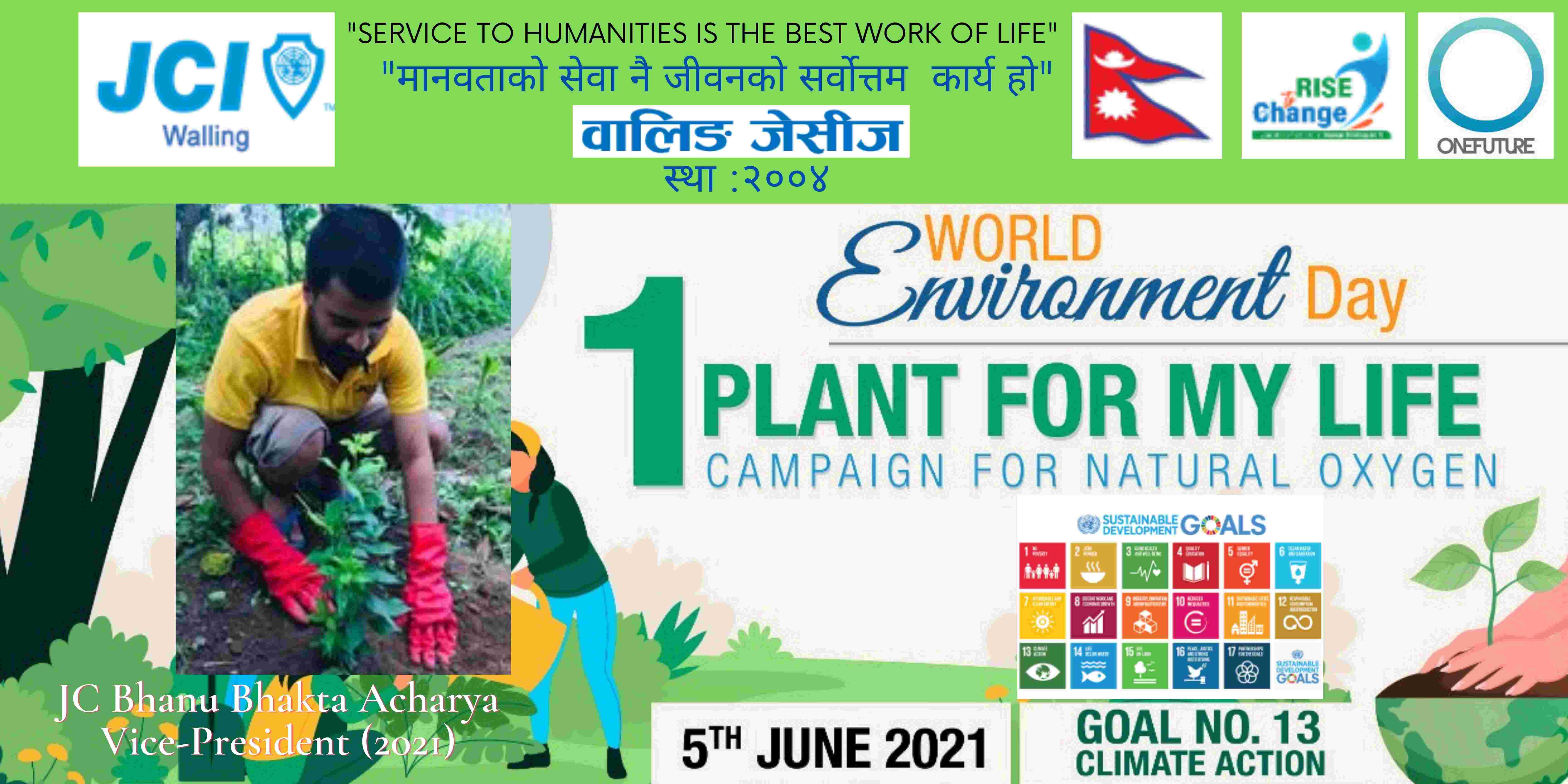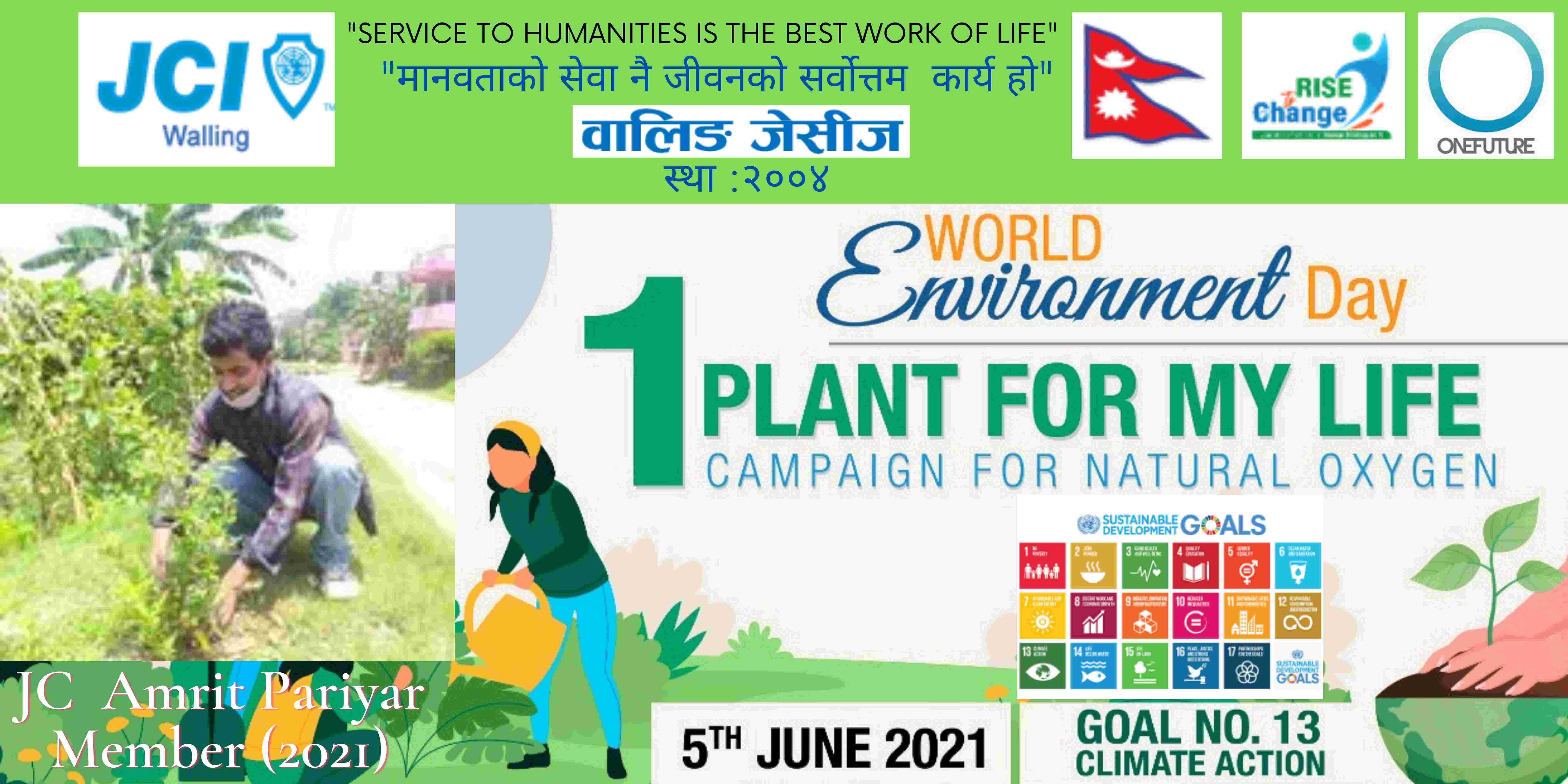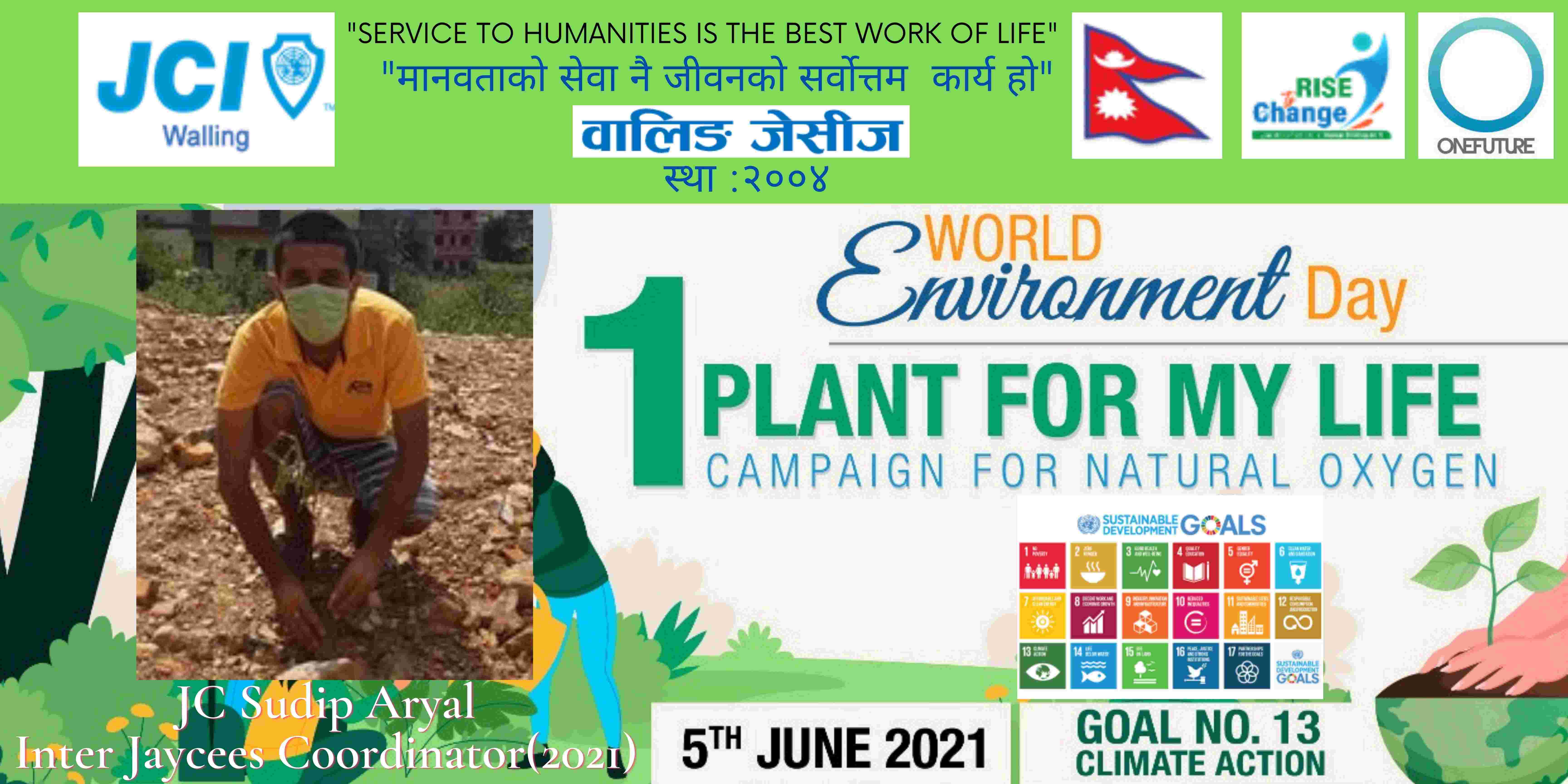 वालिङ जेसीजले विश्व वातावरण दिवसकाे अवसर पारेर वृक्षारोपण सहित प्राकृतिक अक्सिजन काे लागि " मेरो जीवनलाई एक बिरुवा" क्याम्पिङ मिति २०७८ साल जेठ २२ गते शनिबार सम्पन्न गरेको छ। नेपाल जेसीज वर्ष २०२१ को राष्ट्रिय अभियान " परिवर्तन का लागि उठाैं, मानव विकास सँगै नेतृत्व अभ्यासलाई सार्थक तुल्याउन वालिङ जेसीजको तर्फबाट दिगो विकास लक्ष्य अन्तर्गत रहेको लक्ष्य नं१३ अनुरूप साे कार्यक्रम गरिएको वालिङ जेसीजका अध्यक्ष जेसी विश्वास लम्सालले बताउनुभयो । हाल विश्वव्यापी महामारीको रूपमा फैलिदैं गइरहेको काेराेना भाइरस भेरियन्ट -२ काे संक्रमण तिव्र गतिमा बढ्दै जाँदा वालिङ जेसीजले अा- अाफ्नाे क्षेत्रबाट फाेटाे क्याम्पिङ सहित कार्यक्रम सम्पन्न गरेकाे हाे। उक्त कार्यक्रममा वालिङ जेसीजका बाेर्ड पदाधिकारी तथा सदस्यहरूको उल्लेख्य सहभागीता रहेको वालिङ जेसीजका महासचिव जेसी यज्ञ पुरूष रिजालले जानकारी दिनुभयो । विगतका दिनमा समेत वालिङ जेसीजले विपन्न परिवारलाई राहत सामाग्री, स्याङ्जा कारागार काे लागि टिभी लगायत काेभिड १९ राेकथामकाे लागि फ्रण्टलाइनमा बसेर सहयोग पुर्याउने स्वास्थ्यकर्मी र सुरक्षाकर्मी हरूलाई विभिन्न स्वास्थ्य सुरक्षाका सामाग्रीहरू प्रदान गर्दै आइरहेको छ। https://www.facebook.com/jci.waling/posts/175961681147929