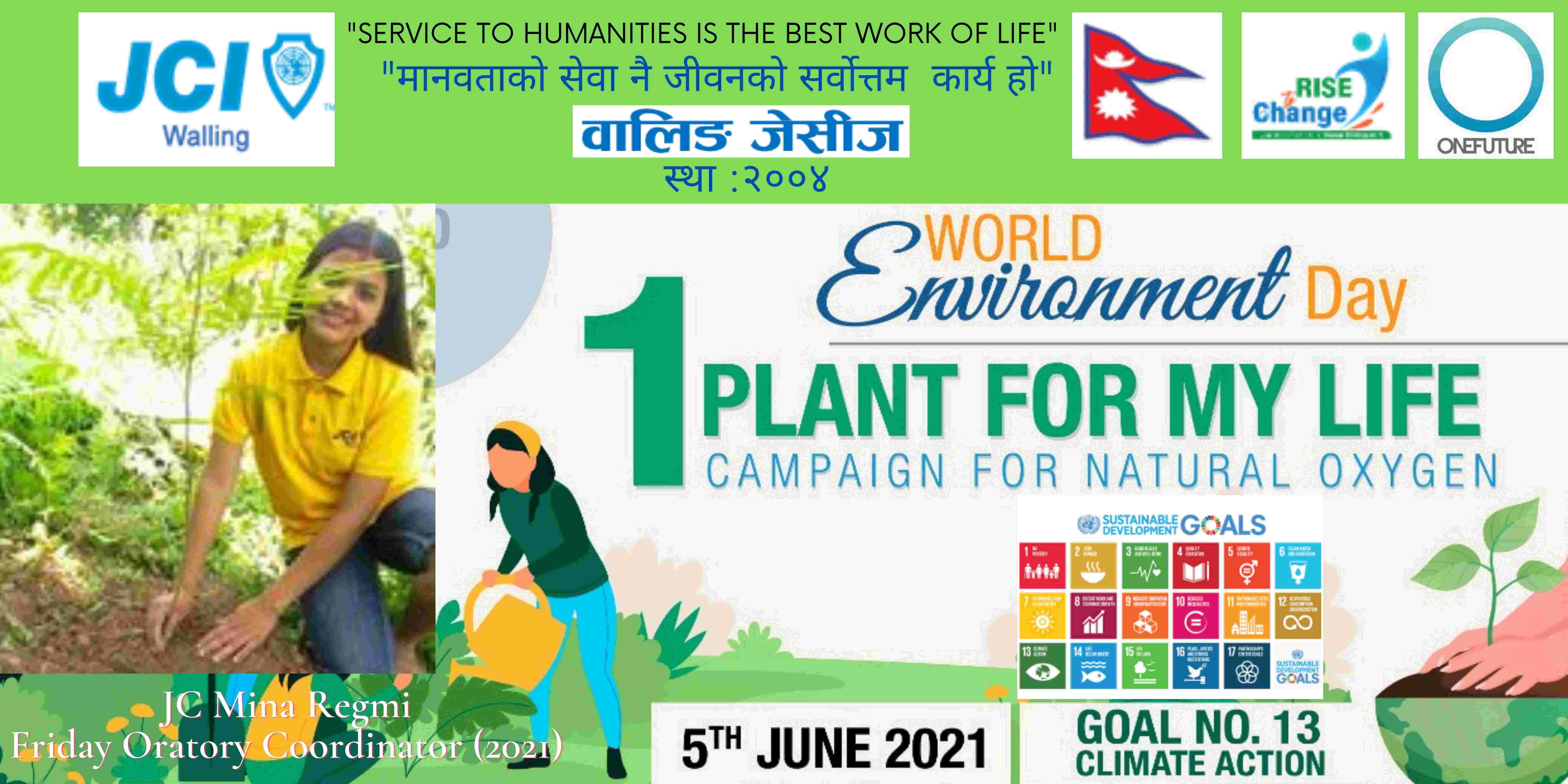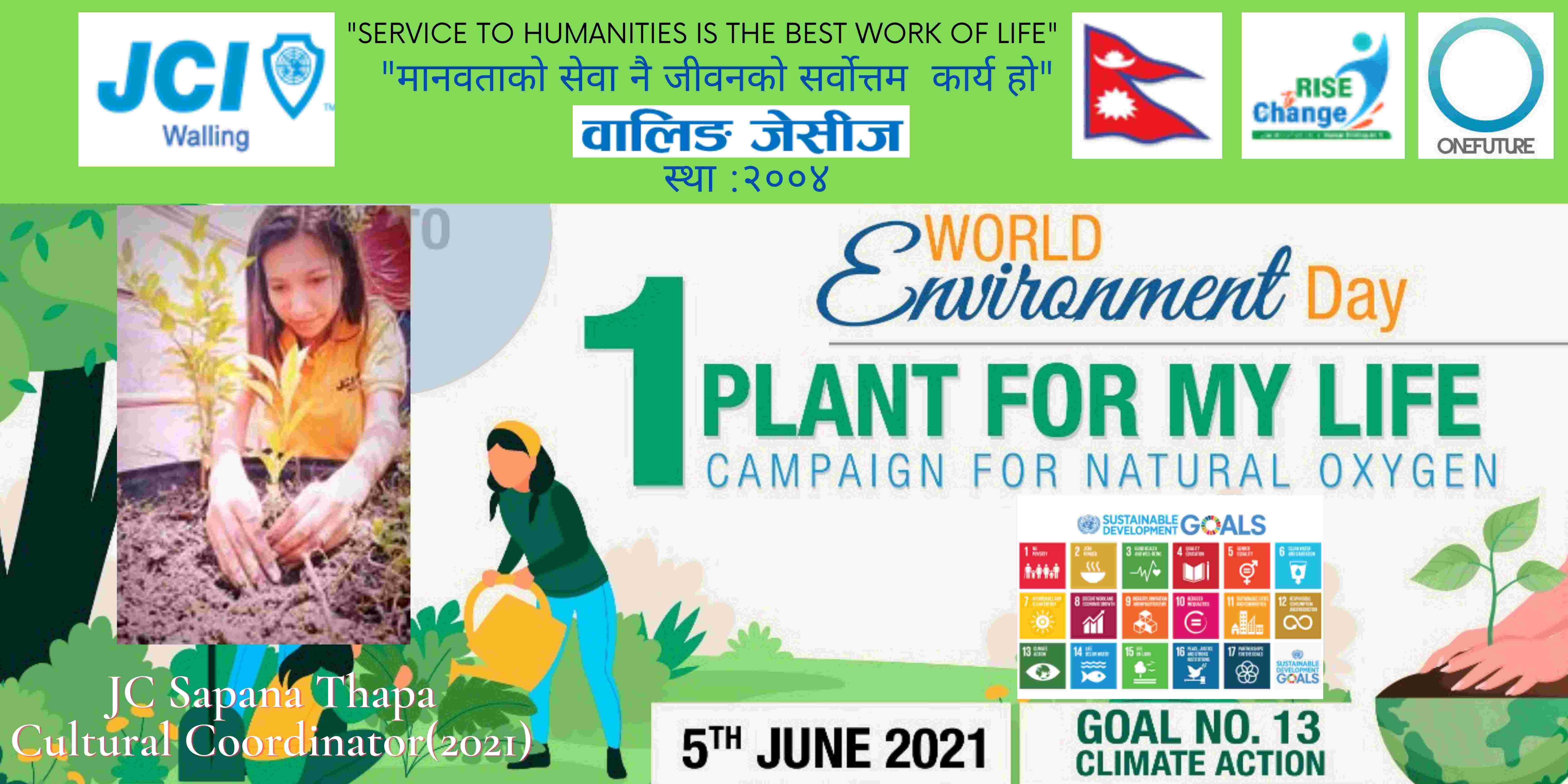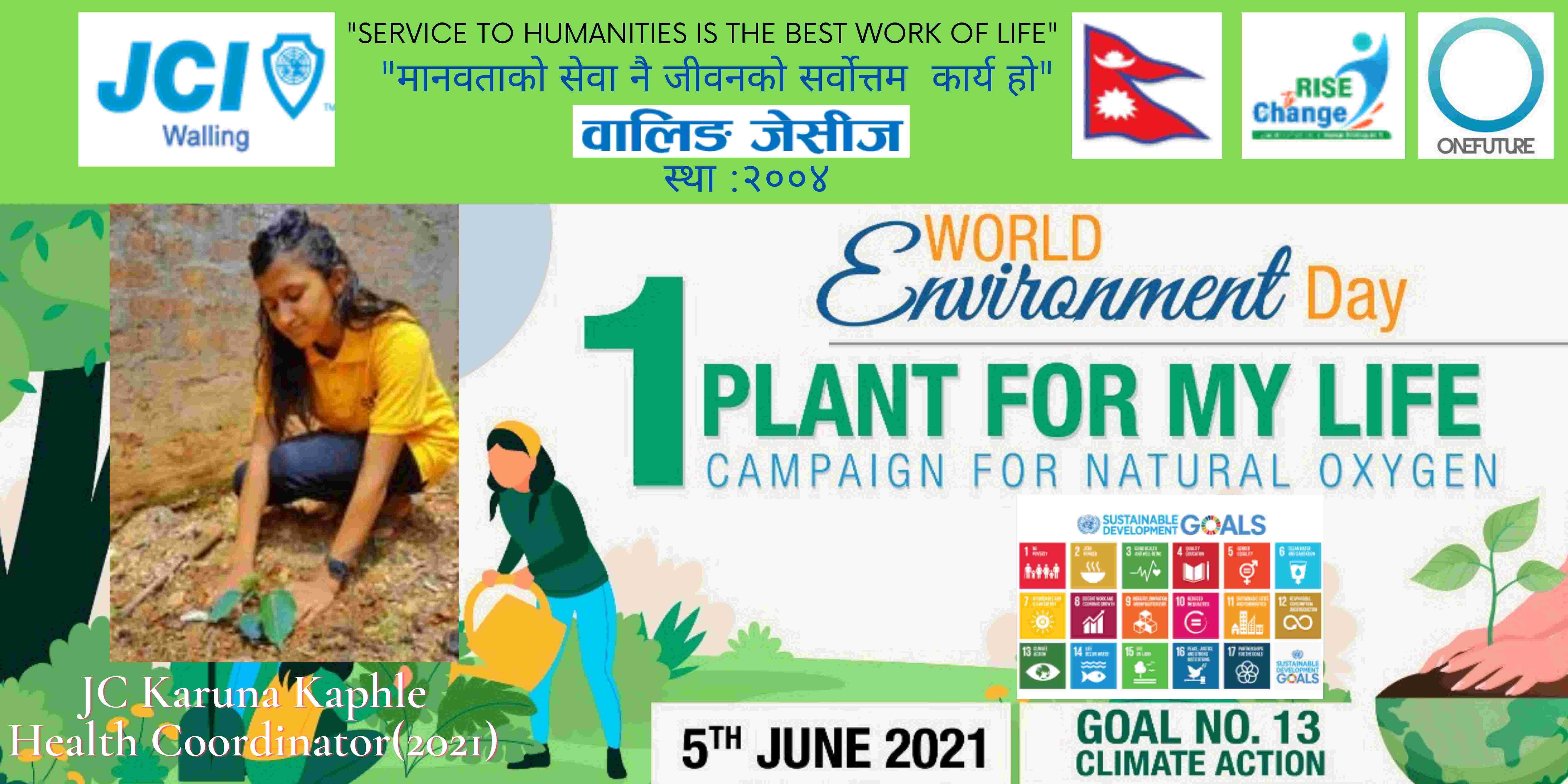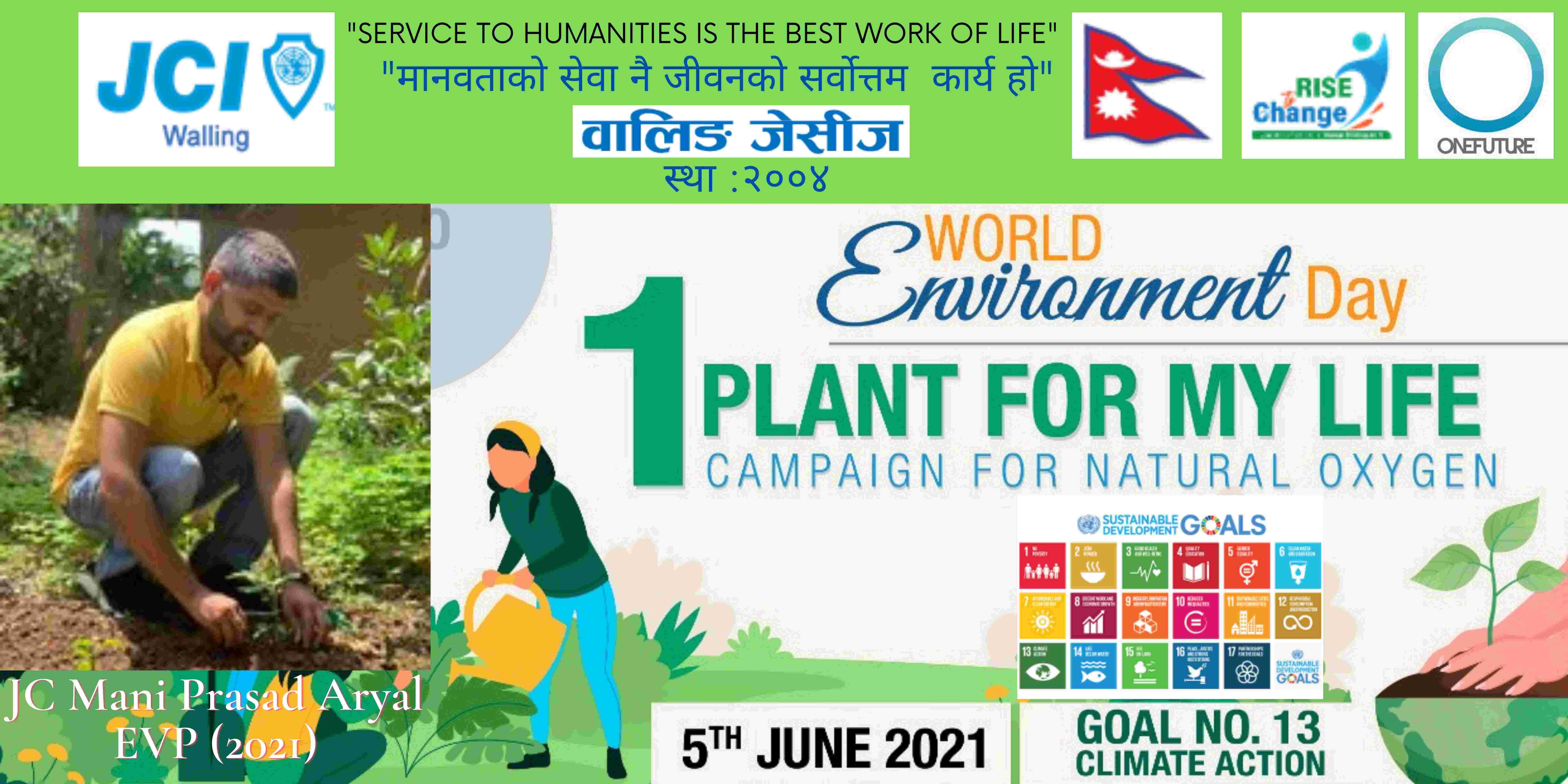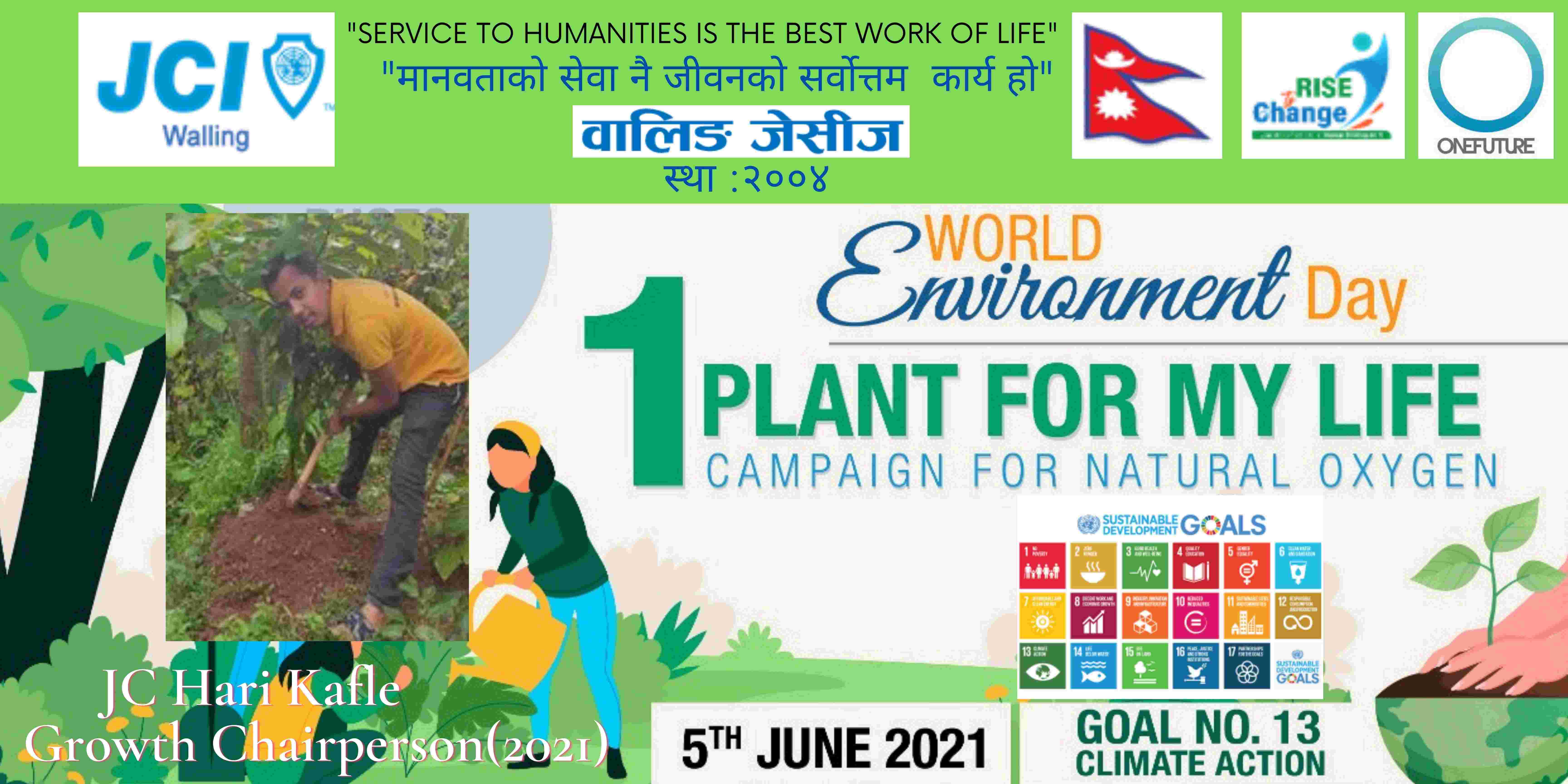 वालिङ जेसीजले विश्व वातावरण दिवसकाे अवसर पारेर वृक्षारोपण सहित प्राकृतिक अक्सिजन काे लागि " मेरो जीवनलाई एक बिरुवा" क्याम्पिङ मिति २०७८ साल जेठ २२ गते शनिबार सम्पन्न गरेको छ। नेपाल जेसीज वर्ष २०२१ को राष्ट्रिय अभियान " परिवर्तन का लागि उठाैं, मानव विकास सँगै नेतृत्व अभ्यासलाई सार्थक तुल्याउन वालिङ जेसीजको तर्फबाट दिगो विकास लक्ष्य अन्तर्गत रहेको लक्ष्य नं१३ अनुरूप साे कार्यक्रम गरिएको वालिङ जेसीजका अध्यक्ष जेसी विश्वास लम्सालले बताउनुभयो । हाल विश्वव्यापी महामारीको रूपमा फैलिदैं गइरहेको काेराेना भाइरस भेरियन्ट -२ काे संक्रमण तिव्र गतिमा बढ्दै जाँदा वालिङ जेसीजले अा- अाफ्नाे क्षेत्रबाट फाेटाे क्याम्पिङ सहित कार्यक्रम सम्पन्न गरेकाे हाे। उक्त कार्यक्रममा वालिङ जेसीजका बाेर्ड पदाधिकारी तथा सदस्यहरूको उल्लेख्य सहभागीता रहेको वालिङ जेसीजका महासचिव जेसी यज्ञ पुरूष रिजालले जानकारी दिनुभयो । विगतका दिनमा समेत वालिङ जेसीजले विपन्न परिवारलाई राहत सामाग्री, स्याङ्जा कारागार काे लागि टिभी लगायत काेभिड १९ राेकथामकाे लागि फ्रण्टलाइनमा बसेर सहयोग पुर्याउने स्वास्थ्यकर्मी र सुरक्षाकर्मी हरूलाई विभिन्न स्वास्थ्य सुरक्षाका सामाग्रीहरू प्रदान गर्दै आइरहेको छ। https://www.facebook.com/jci.waling/posts/175961681147929