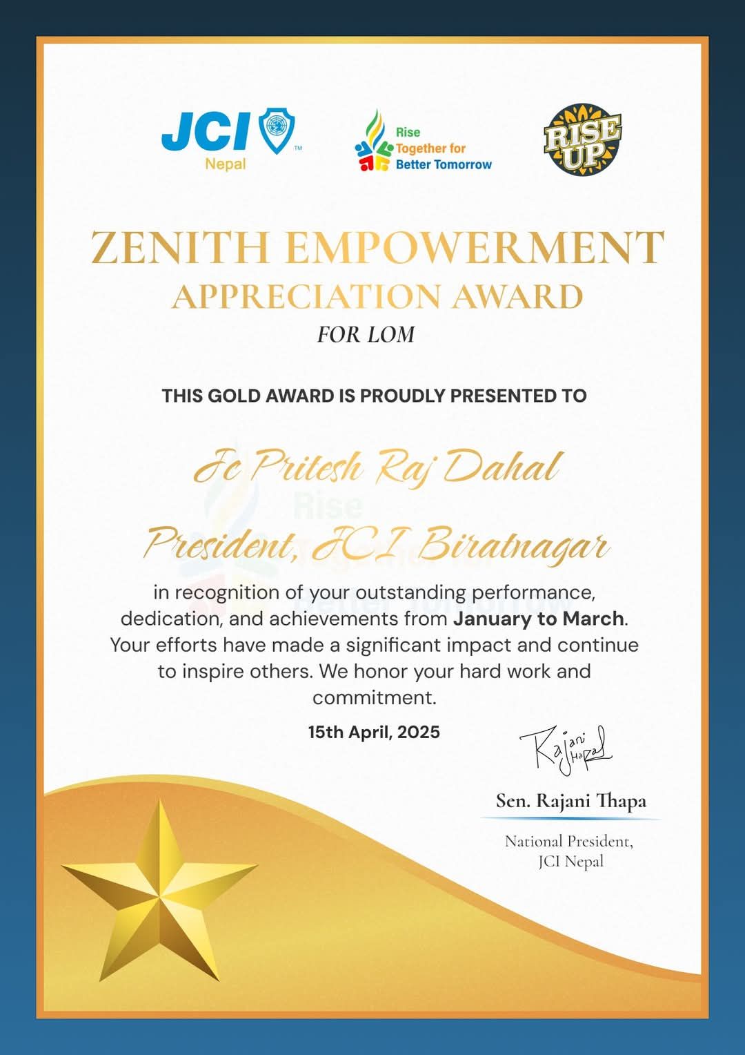 नेपाल जेसीज द्वारा बिराटनगर जेसीजका अध्यक्षलाई ZENITH EMPOWERMENT GOLD AWARD बाट सम्मान प्राप्त l Posted on 02-05-2025