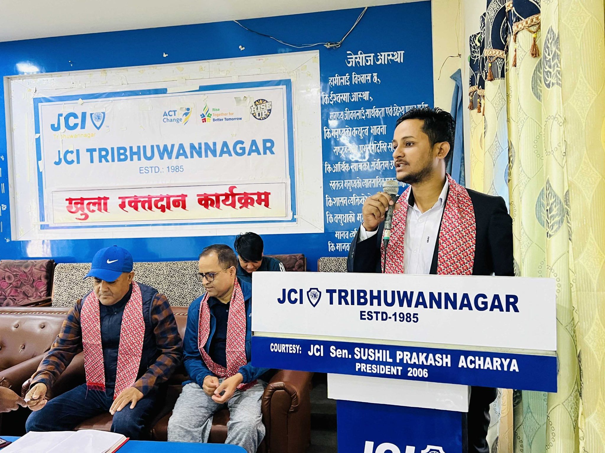 आज मिति २०८२ कार्तिक १५गते त्रिभुवननगर जेसीजको आयोजना खुला रक्तदान कार्यक्रम सम्पन्न भएको छ । वर्ष २०२५ का कार्यकारी उपाध्यक्ष जेसी चुडामणि पाण्डे (वावुराम) को अध्यक्षता र नेपाल रेडक्रस सोसाइटी दाङका मन्त्री प्रकाश श्रिवन्धको प्रमुख आतिथ्यता रहेको कार्यक्रममा रेडक्रस सोसाइटी घोराही शाखाका सभापति थम्मन चौधरी र त्रिभुवननगर जेसीजका पूर्व अध्यक्ष निशान्त आचार्यले मन्तव्य राख्नुभएको थियो । कार्यक्रम संयोजक जेसी रण बहादुर खड्काको स्वागत मन्तव्यवाट सुरु भएको कार्यक्रमको सहजिकरण महासचिव कृष्ण देव थापाले गर्नुभएको थियो ।