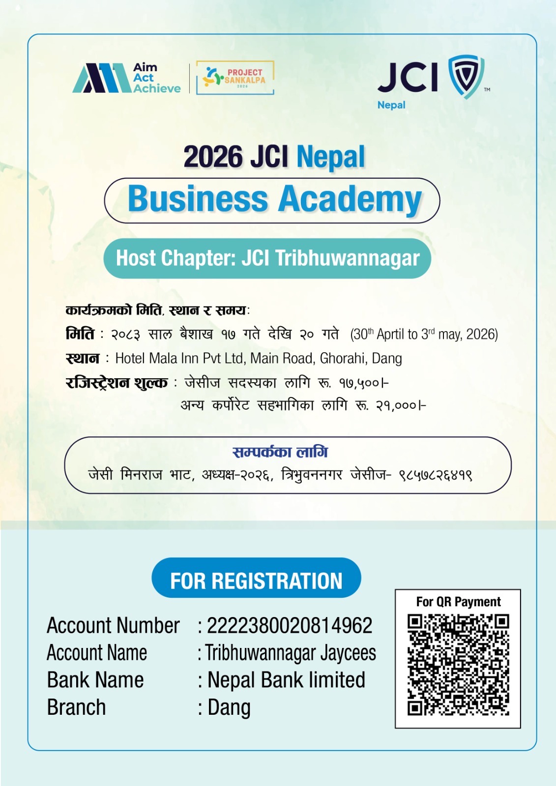 “कि आर्थिक न्यायको सर्वोत्तम उपलब्धी, स्वतन्त्र मनुष्यको व्यावसायिक स्वतन्त्रताद्धारा हुन सक्दछ” भन्ने जेसीजको आस्था अनुरुप युवाहरुलाई व्यवसायिक रुपमा शशक्त बनाई राष्ट्रलाईनै समृद्धिको अभियानमा अगाडि बढाउने उद्देश्यका साथ यस वर्ष Project Sankalpa-एकताको संकल्प, रूपान्तरणको यात्रा अन्तर्गत नेपाल जेसीजको प्रकरण “Aim, Act, Achieve" अभियानलाई सार्थक परिणाम सहित सफल, उत्कृष्ट एवं उपलब्धिमुलक बनाउन नेपाल जेसीज वर्ष–२०२६ को JCI Nepal Business Academy, त्रिभुवननगर जेसीजको आतिथ्यतामा निम्न मिति, स्थान र समयमा हुन गईरहेको विषय जानकारी गराउँदछु ।