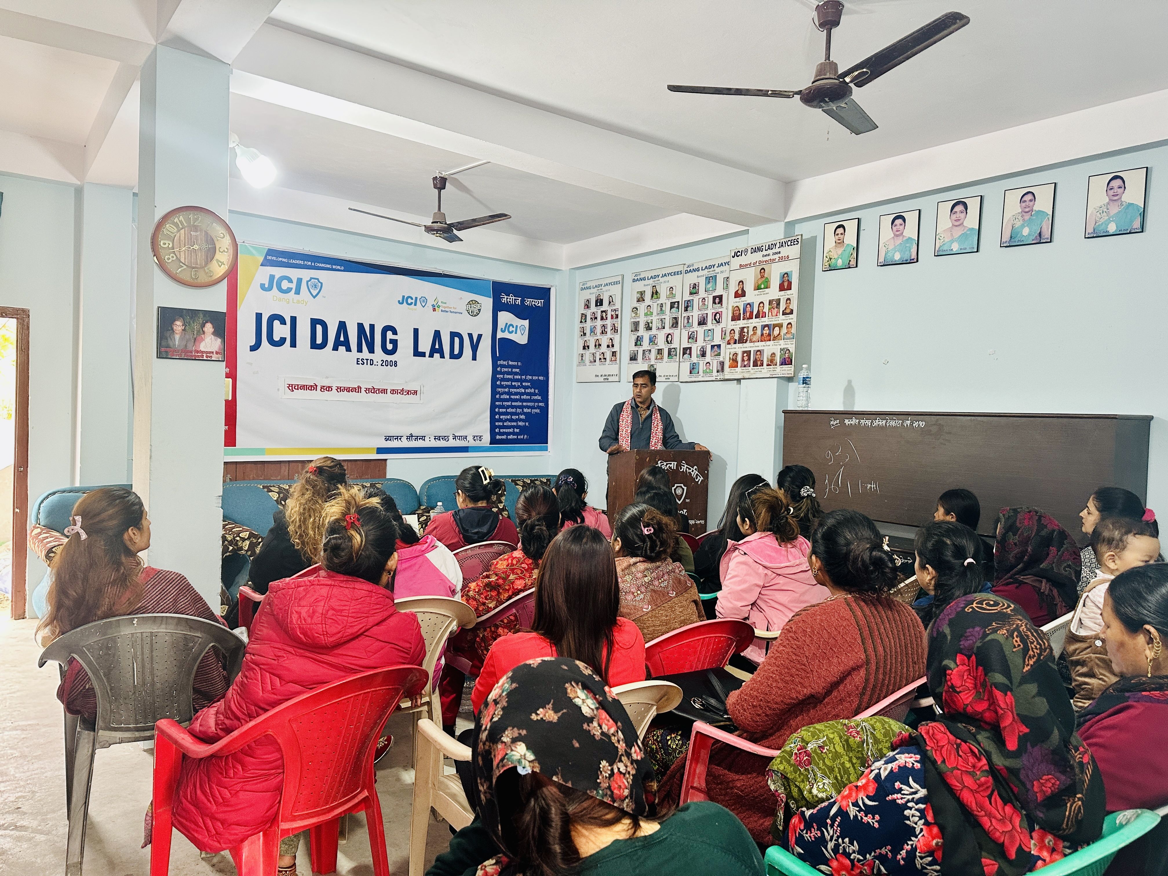 आज मिती २०८१-११- १६ गते सुचनाको हक सम्बन्धि सचेतना कार्यक्रम दाङ महिला जेसीज को आयोजना मा अध्यक्ष जेसी अनिता ढकालको ज्यूको सभाध्यक्षता मा पत्रकार महासँघ दाङ का अध्यक्ष सन्तोष सुवेदी ज्यू को प्रमुख आतिथ्यता मा संयोजक उपाध्यक्ष जेसी दिपा पुन को स्वागत मन्तव्य बाट कार्यक्रम को सुरुवात भएको थियो । आस्था पाठ को अगुवाई सदस्य जेसी सरस्वती वली केसी ज्यू ले गर्नुभएको थियो । सुचना को हक सम्बन्धि विषय लाई प्रमुख अतिथी ज्यू ले प्रस्ट्याउनु भएको थियो । उक्त कार्यक्रम मा पूर्व अध्यक्ष जेसी निरजा पोख्रेल ज्यू ले आफ्नो मन्तव्य राख्नु भएको थियो । कार्यक्रममा दाङ महिला जेसीज का साथै विभिन्न क्षेत्र मा आवद्ध महिला दिदी बहिनी हरु को उपस्थिति रहेको थियो । कार्यक्रम को सहजीकरण महासचिव जेसी भिमा डिसी ज्यू ले गर्नु भएको थियो भने अध्यक्ष जेसी अनिता ढकाल ज्यूले धन्यवाद सहित कार्यक्रम को समापन गर्नु भएको थियो