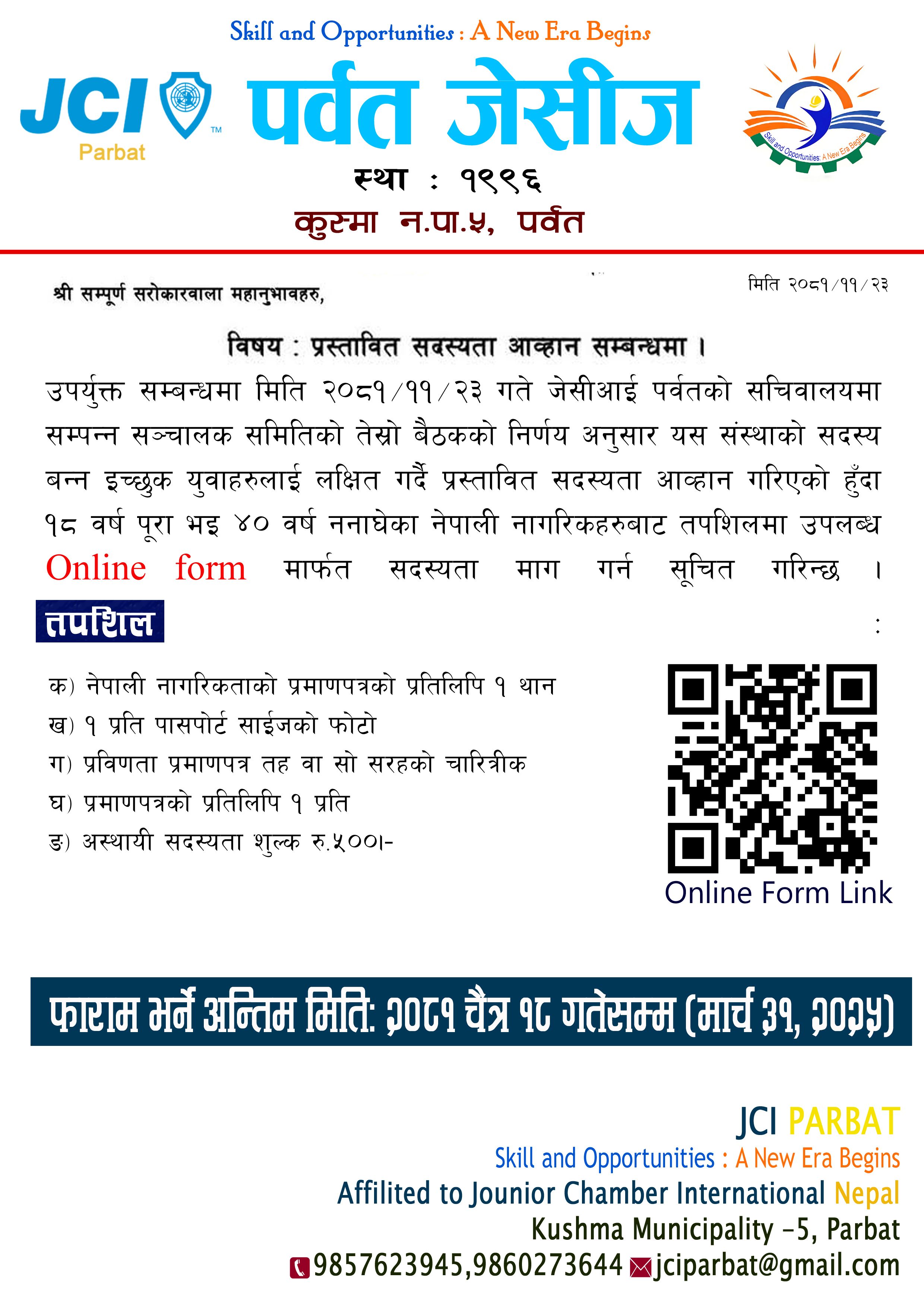 उपर्युक्त सम्बन्धमा मिति २०८१/११/२३ गते जेसीआई पर्वतको सचिवालयमा सम्पन्न सञ्चालक समितिको तेस्र्रो बैठकको निर्णय अनुसार यस संस्थाको सदस्य बन्न इच्छुक युवाहरुलाई लक्षित गर्दै प्रस्तावित सदस्यता आव्हान गरिएको हुँदा १८ वर्ष पूरा भइ ४० वर्ष ननाघेका नेपाली नागरिकहरुबाट तपशिलमा उपलब्ध online form मार्फत सदस्यता माग गर्न सूचित गरिन्छ ।