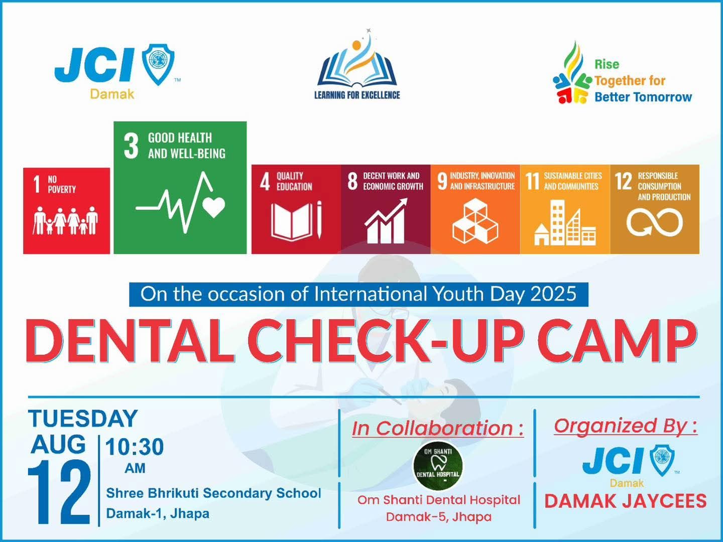 मिति २०८२ साल साउन २७ गते मंगलबार तद्अनुसार 12th August, 2025 का दिन अन्तर्राष्ट्रिय युवा दिवस-२०२५(International Youth Day-2025)को अवसरमा (International Youth Day-2025)को अवसरमा दमक जेसीजको आयोजना तथा ॐ शान्ति डेन्टल हस्पिटल, दमक-५, झापाको सहकार्यमा दमक-१ स्थित श्री भृकुटी माध्यमिक विद्यालयमा अध्ययनरत विद्यार्थीहरूको दन्त परिक्षणका निम्ति ‘Dental Check-Up Camp’ कार्यक्रम दमक जेसीजका संस्थापक अध्यक्ष आदरणीय गणेश ढकालज्यूको प्रमुख आतिथ्यतामा सम्पन्न गरियो ।कार्यक्रमको अध्यक्षता दमक जेसीज बर्ष २०२५ का अध्यक्ष जेसी सहदेब भट्टराईज्यूले गर्नुभएको थियो ।कार्यक्रममा बिशिष्ट अतिथि दमक जेसीज बर्ष १९९६ का अध्यक्ष तथा दमक जेसीज BOT का अध्यक्ष आदरणीय गन्ज बहादुर दाहालज्यू, अतिथिहरू भृकुटी माध्यमिक विद्यालयका प्रधानाध्यामक लक्ष्मी प्रसाद न्यौपानेज्यू, ॐ शान्ति डेन्टल हस्पिटलका सन्चालक कमल गैरेज्यू तथा हस्पिटलमा कार्यारत डा. अन्जली ठाकुर र डा. सायरा ढकालज्यू, दमक जेसीजका पूर्ब अध्यक्षहरू आदरणीय कमल कटुवाल र नरेन्द्र बरालज्यू तथा दमक जेसीज बर्ष २०२५ बोर्डका पदाधिकारीहरू लगायतको उपस्थिति रहेको थियो । सो दन्त परिक्षण शिबिर कार्यक्रममा विद्यालयका ३०० जना भन्दा बढी विद्यार्थीहरुको निःशुल्क दन्त परिक्षण गरिएको थियो। कार्यक्रम दमक जेसीजका उपाध्यक्ष जेसी सन्ध्या बरालको संयोजकत्वमा भएको थियो भने जनसम्पर्क अधिकारी जेसी बिशाल अधिकारीले जेसीज आस्था पाठ बाचन गर्नुभएको थियो । श्री भृकुटी माध्यमिक विद्यालय परिवार तथा ॐ शान्ति डेन्टल हस्पिटल प्रति आभार ब्यक्त गर्दै कार्यक्रममा सहभागी भई समर्थन र प्रेरणा प्रदान गर्नु हुने सम्पूर्ण महानुभावहरूप्रति हार्दिक धन्यबाद व्यक्त गर्दछौं।